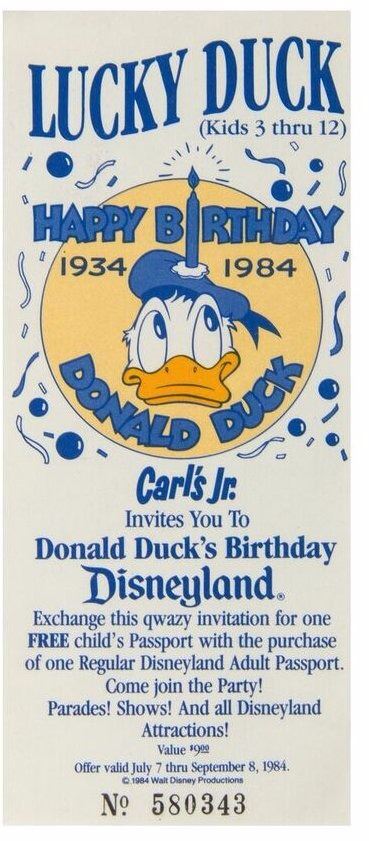 (Disneyland, 1984) A child's invitation to Disneyland for Donald Duck's 50th birthday party. This invitation was given through Carl's Jr. Restaurants and could be exchanged for a free child's Passport with the purchase of an Adult Passport. This item measures 6.1"x2.6" and is in good condition.