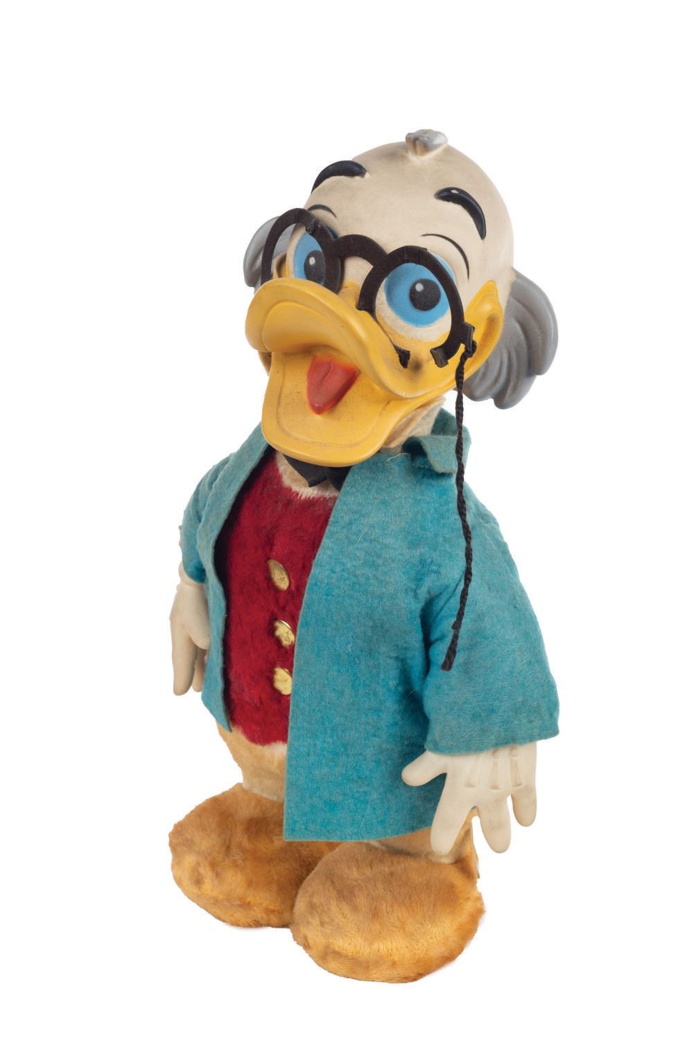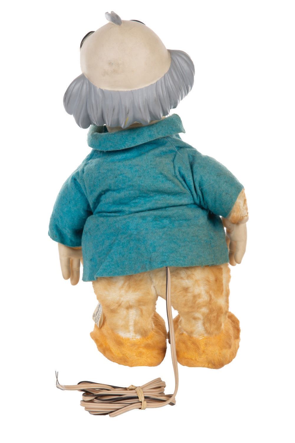 (Gund, 1963) A vintage Professor Ludwig Von Drake Talking Doll manufactured by Gund. A speaker is embedded in the torso, and a speaker cord is attached. The doll is intended to connect to an RCA Victor tape cartridge recorder, and originally came with a pre-recorded tape cartridge featuring the voice of Ludwig von Drake, Paul Frees, singing songs and telling stories. Measuring 15"x9" and 5" deep, the doll is in good condition with minor wear from age, and splitting damage to his glass's frames, though all parts of the glasses are present. The electronics are untested.