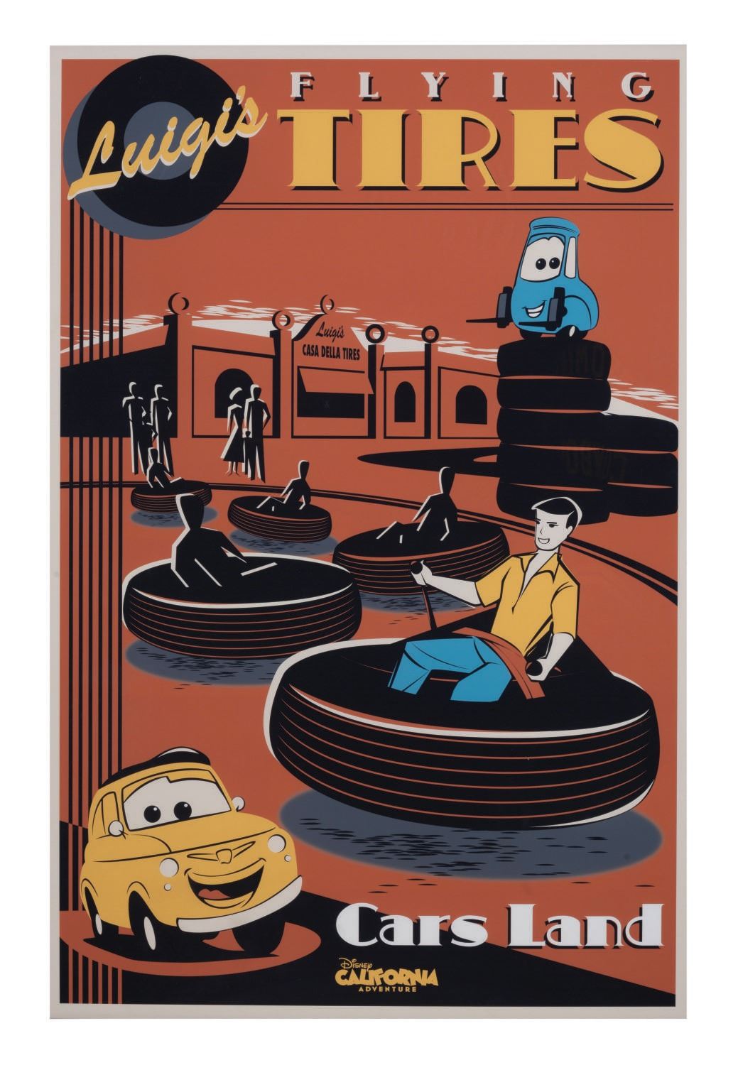 (California Adventure, 2012) An extremely rare original poster from "Luigi's Flying Tires" at Disney California Adventure Park. The poster was developed by Greg Maletic, in partnership with Walt Disney Imagineering and Hunt Design. The artwork features the popular Disney -PIXAR Cars characters in imagery inspired by the classic screen-printed Flying Saucers attraction poster. Upon the Grand Reopening of the Park and addition of Cars Land, a short run of these were printed for display at the Entrance and Esplanade. Measuring 30"x45", the poster is in fine condition.