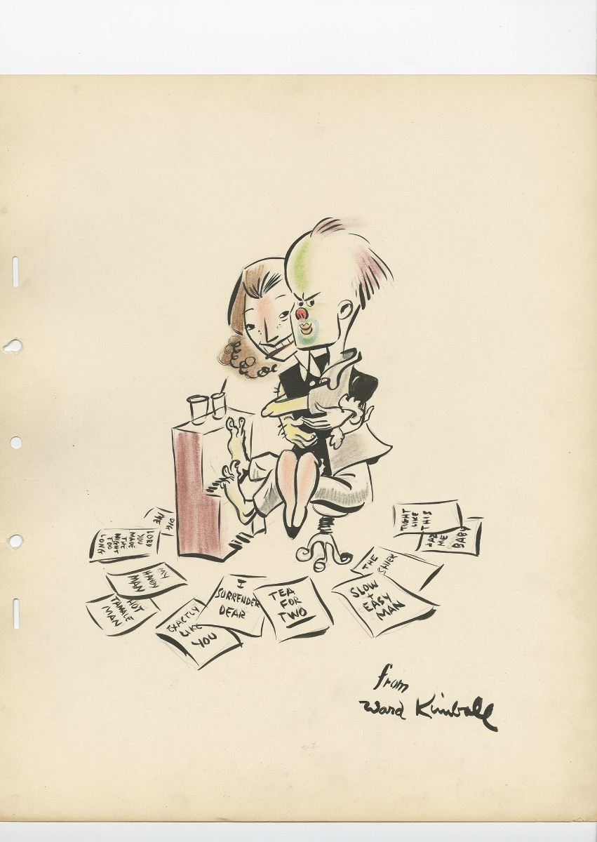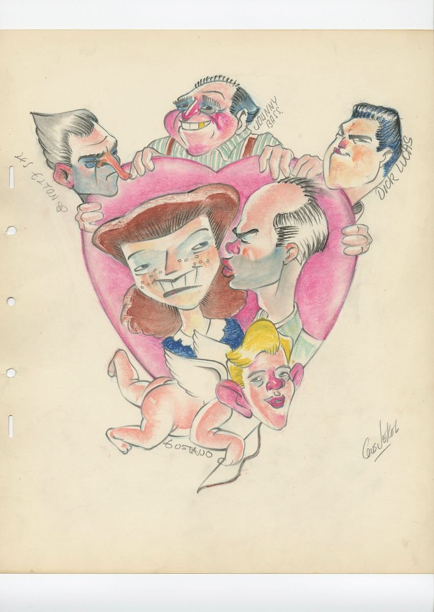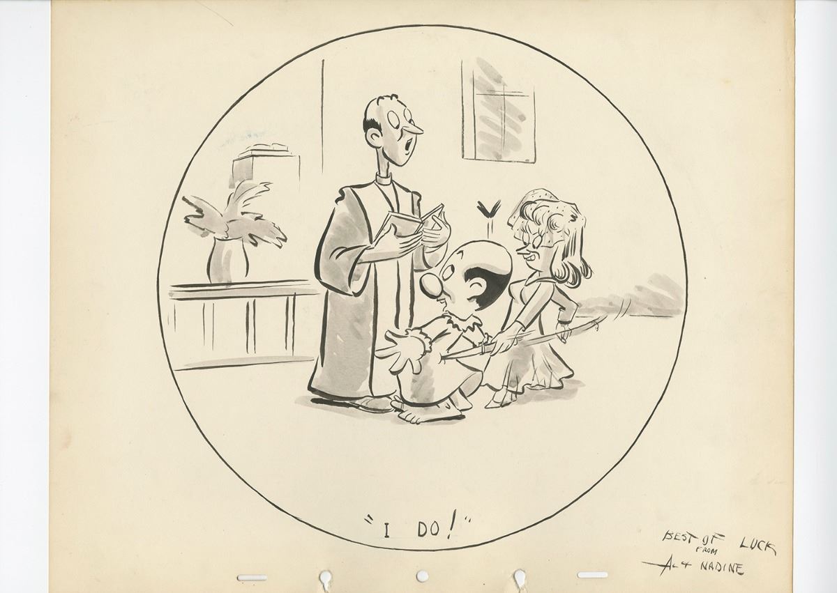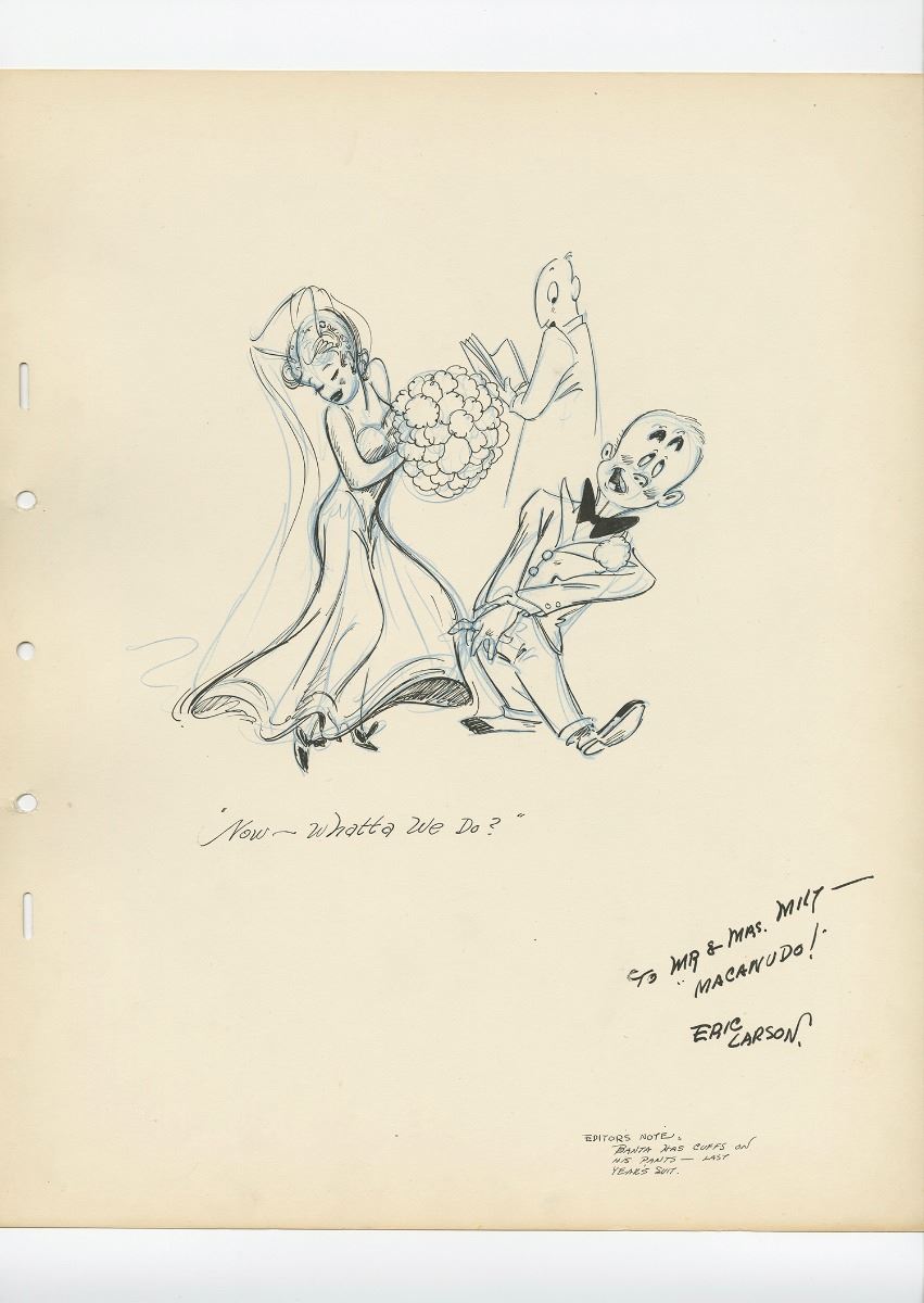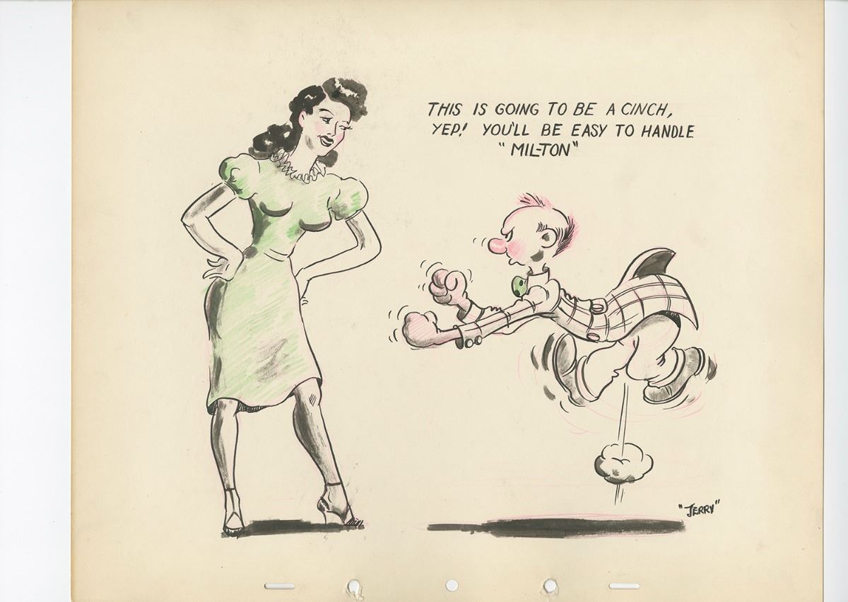 (Walt Disney Studios, 1943) Milt Banta joined the Disney Studio in the early 1940s. He was an assistant animator at first but later became a writer, and is credited on several shorts as well as "Alice In Wonderland", "Peter Pan", and "Sleeping Beauty". He also wrote and illustrated several Golden Books in the early 1950s. This amazing collection of (30) paintings by animators at the studio given to Milt Banta as a wedding gift in 1943. It was a tradition at the studio for the artists to constantly draw and share caricatures of other artists as well as their original artwork. When a special occasion would arise, more thought-out and detailed pieces were the norm. These original pieces of artwork, all on 12.5"x15" pegged heavy paper, include artworks by Bill Justice, John Lounsbery, Les Clark, Jesse Marsh, Fred Moore, and others. An amazing archive of artwork from some of the best artists at the studio during the war.