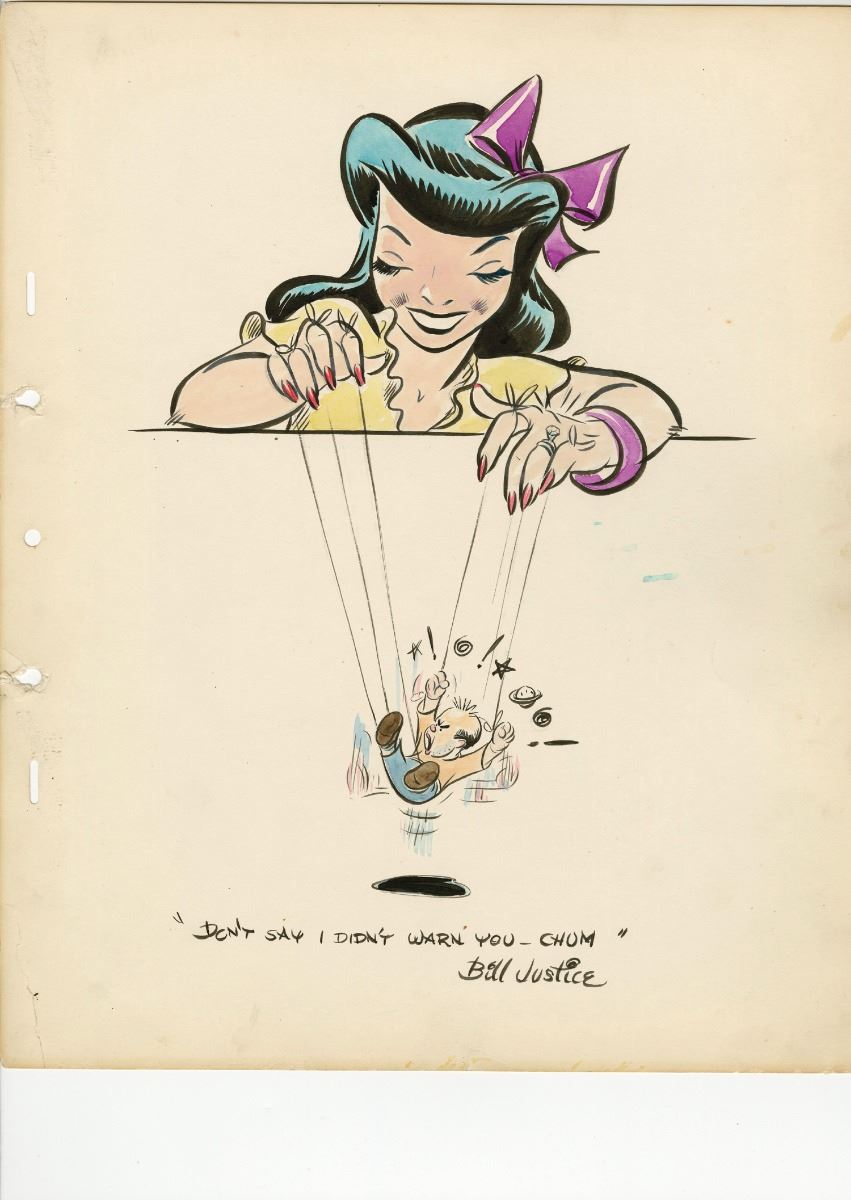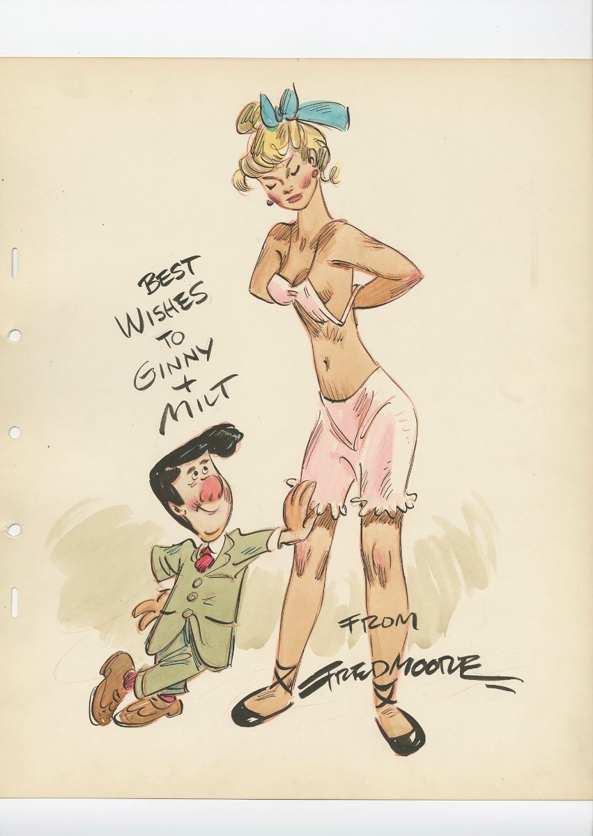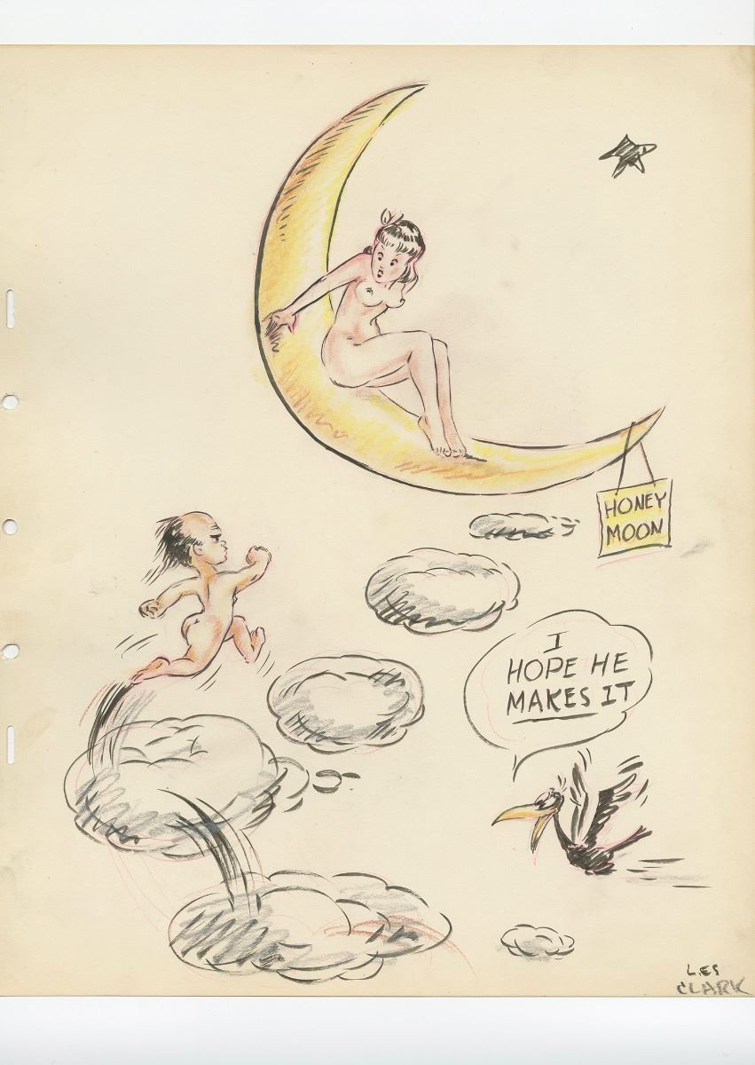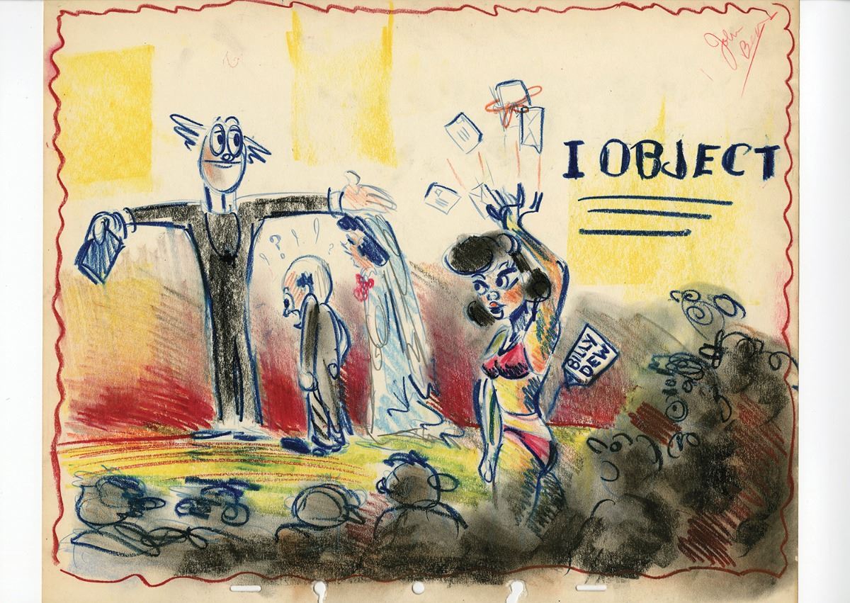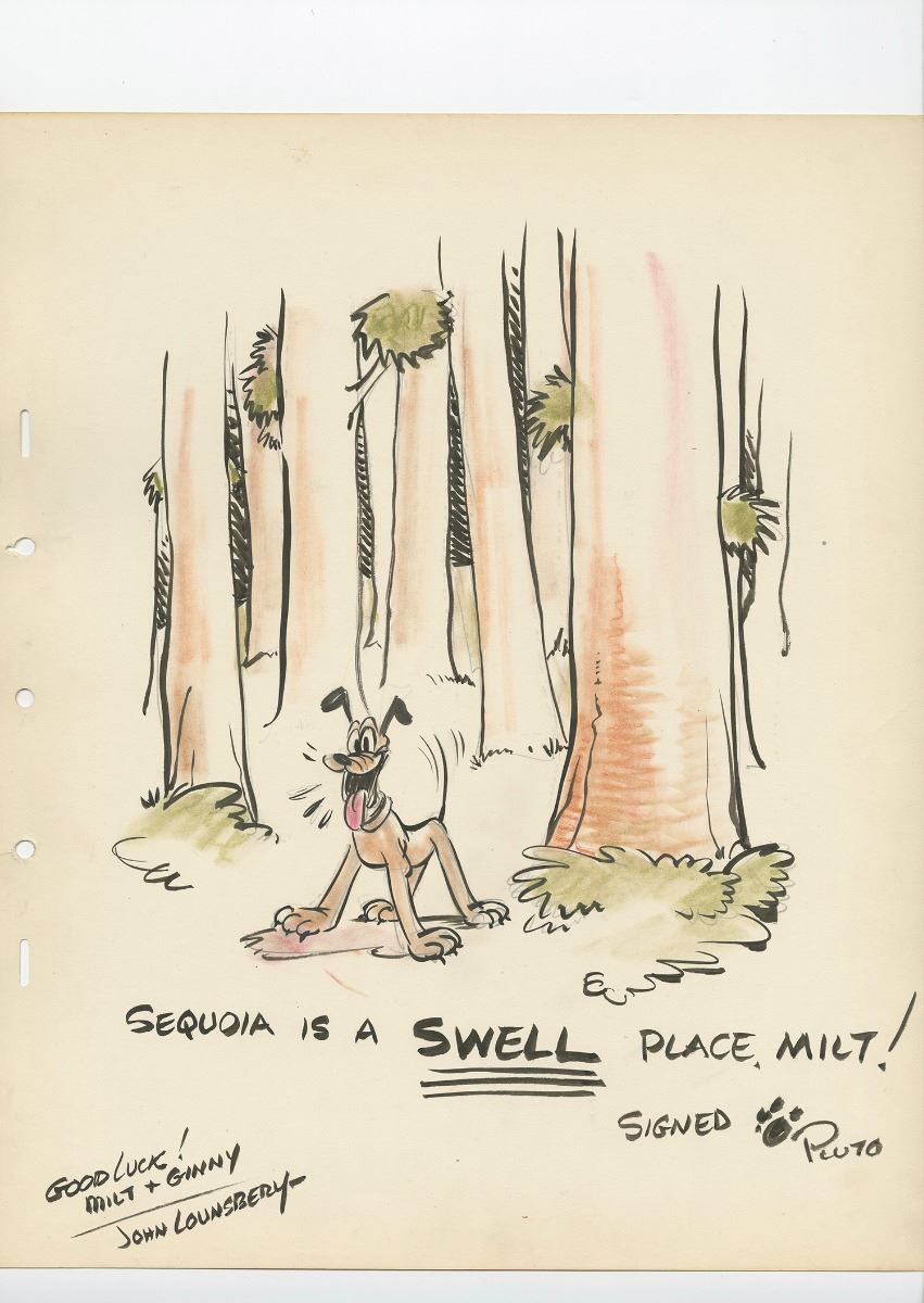 (Walt Disney Studios, 1943) Milt Banta joined the Disney Studio in the early 1940s. He was an assistant animator at first but later became a writer, and is credited on several shorts as well as "Alice In Wonderland", "Peter Pan", and "Sleeping Beauty". He also wrote and illustrated several Golden Books in the early 1950s. This amazing collection of (30) paintings by animators at the studio given to Milt Banta as a wedding gift in 1943. It was a tradition at the studio for the artists to constantly draw and share caricatures of other artists as well as their original artwork. When a special occasion would arise, more thought-out and detailed pieces were the norm. These original pieces of artwork, all on 12.5"x15" pegged heavy paper, include artworks by Bill Justice, John Lounsbery, Les Clark, Jesse Marsh, Fred Moore, and others. An amazing archive of artwork from some of the best artists at the studio during the war.