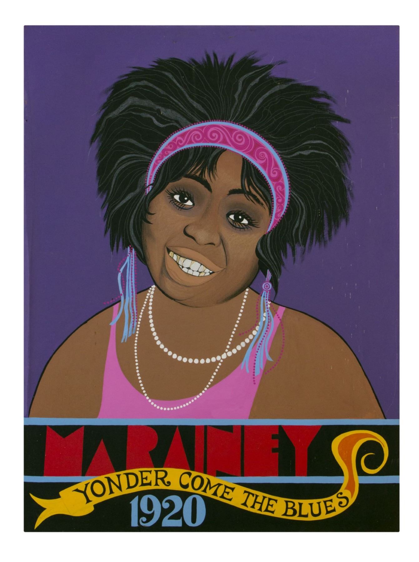 (2001) An original painting by Rolly Crump of blues singer Ma Rainey. Accomplished in acrylic on canvas, this painting measures 40"x30" and is in fair to good condition with some scuffing, a few specks of stray paint, and a crease to the left-edge of the canvas.