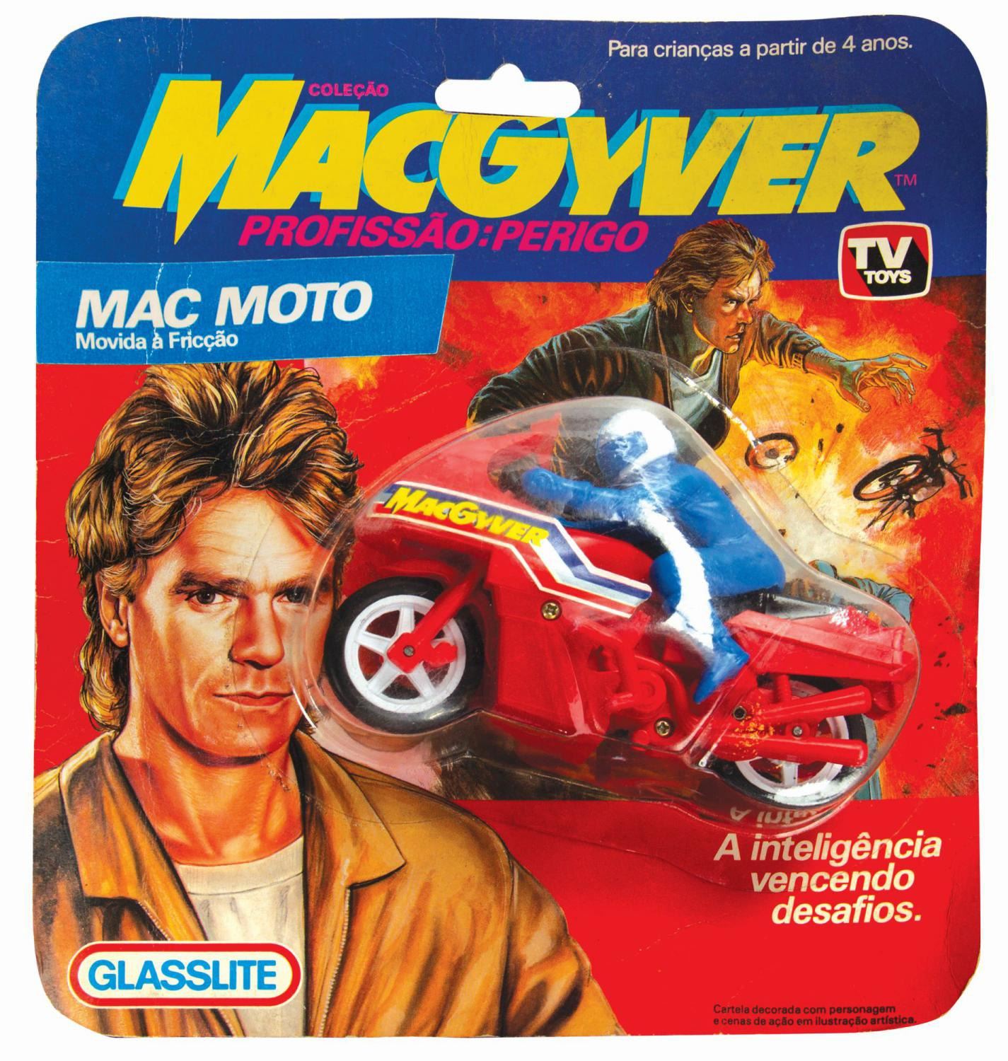 (Glasslite, 1993) A rare vintage MacGyver "Mac Moto" motorcycle toy manufactured by Brazilian toymaker Glasslite. The friction powered plastic and metal motorcycle is unopened, still inside the original plastic bubble on the original backing card. Measuring 8.75"x7.75" and 2" deep, the card is in good condition with some light creasing from the weight of the motorcycle and shelf wear. The motorcycle itself is as-new.