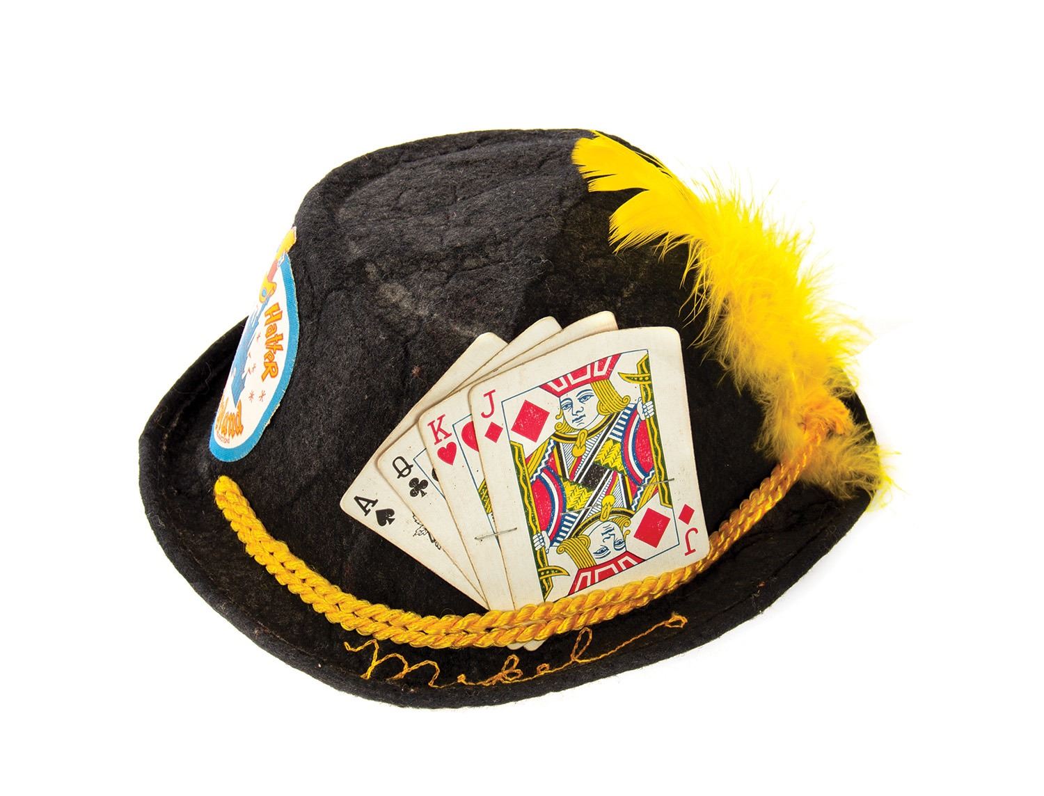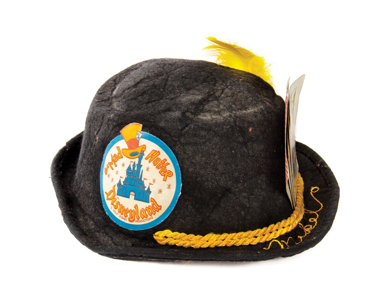 (Disneyland, c.1970s) A rare Disneyland Mad Hatter kids felt cap. This cap features the Mad Hatter Disneyland logo and incorporates four playing cards and a yellow feather into the design. The name Mikel is embroidered into the front. The hat is a child's size small and is in fair condition with wear throughout, including some heavy creasing to top.