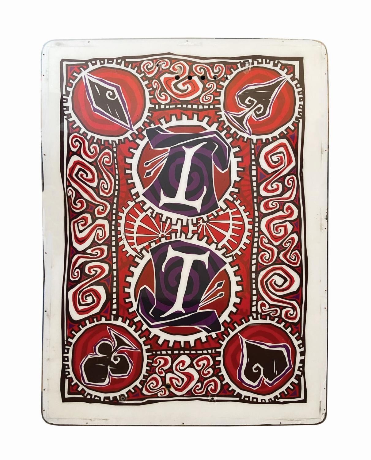 (California Adventure, 2010s) A large playing card prop from the Mad T Party at Disney's California Adventure. This high-energy evening event featured modern, stylized versions familiar Alice in Wonderland characters, with a live band, DJ, and dancers performing throughout the night, with an arcade and two bar locations available to guests. The secondary stage was called the House of Cards and featured oversized playing card light boxes. Created in acrylic, this card would have formed the back of one of the light boxes, and as such would have been directly attached to the stage scaffolding. Measuring 83.75"x59.5", the card is in good park-used condition, with some scratching and scuffing to the surface from mounting. There is a visible line around the edge from the frame of the light box, and a few areas where the image decal exhibits scratching.