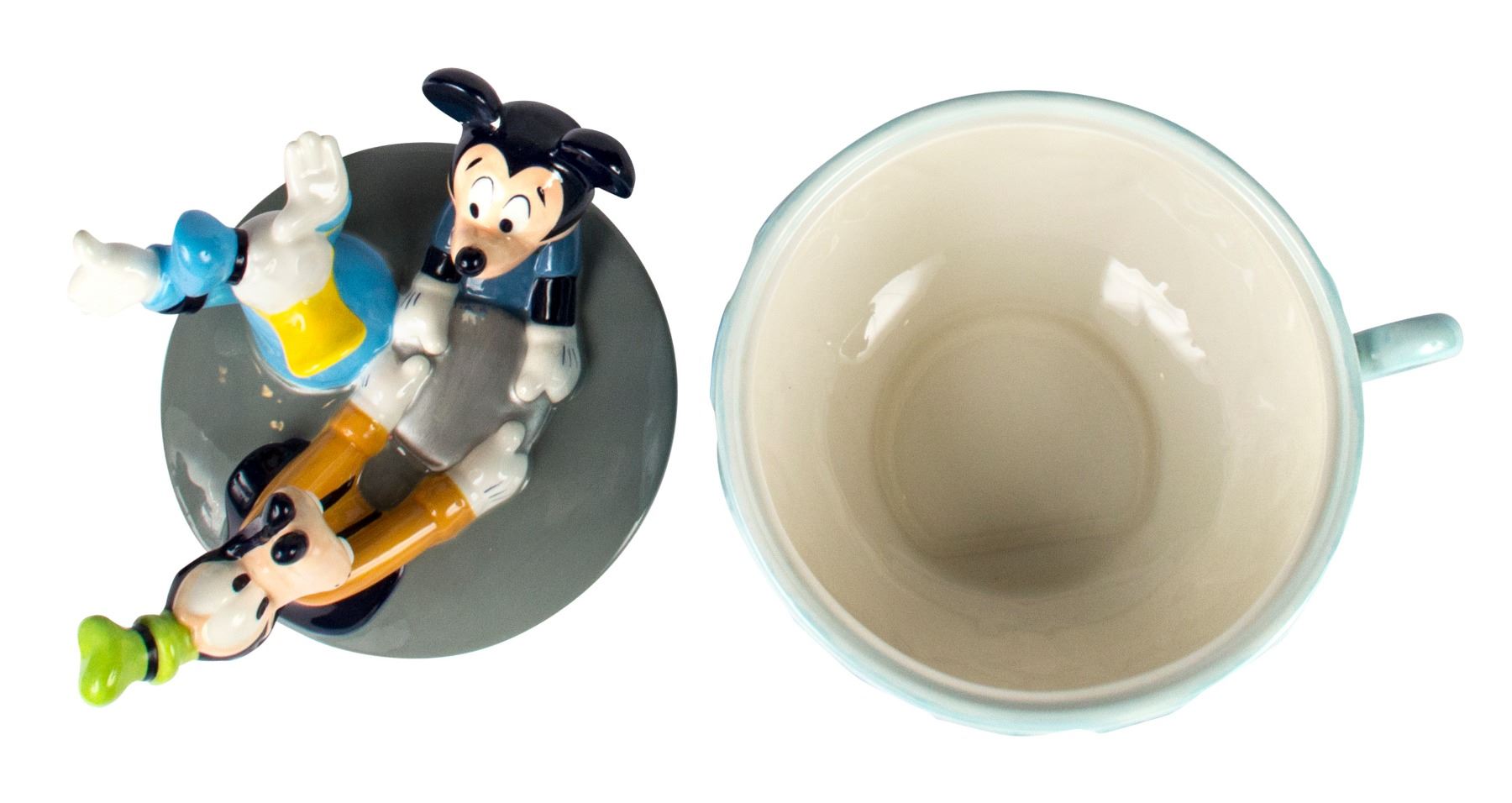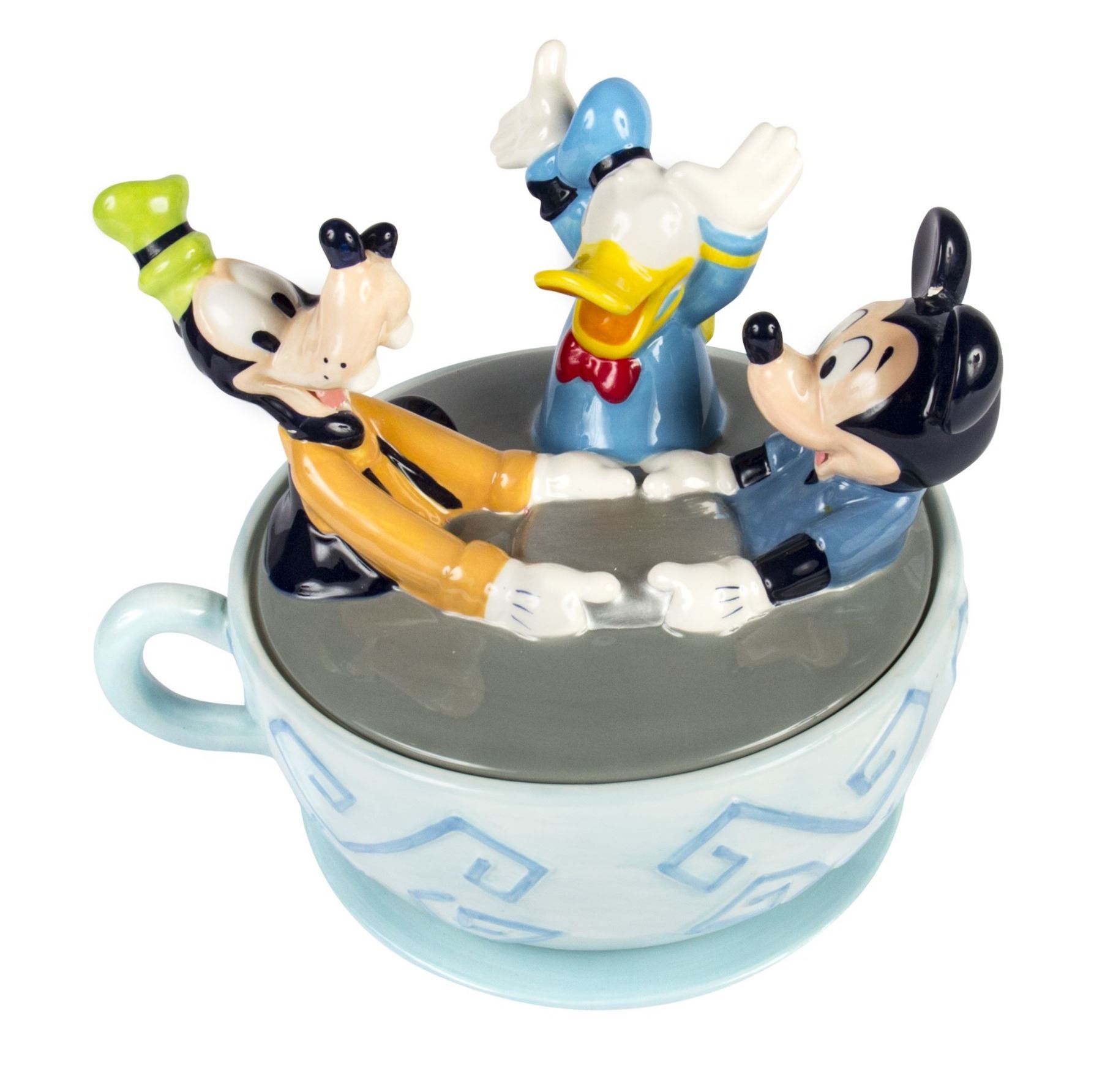 (Disneyland, c.1990s) A ceramic cookie jar that depicts Goofy, Donald, and Mickey riding the "Mad Tea Cups" attraction. The cookie jar body is shaped like one of the tea cups, and the removeable lid contains the characters. The jar measures approximately 9.5" in diameter and 10.5" tall. The condition is fair to good, with a couple of repaired breaks in Goofy's head and Mickey's ear, and some small chips to the tea cup.
