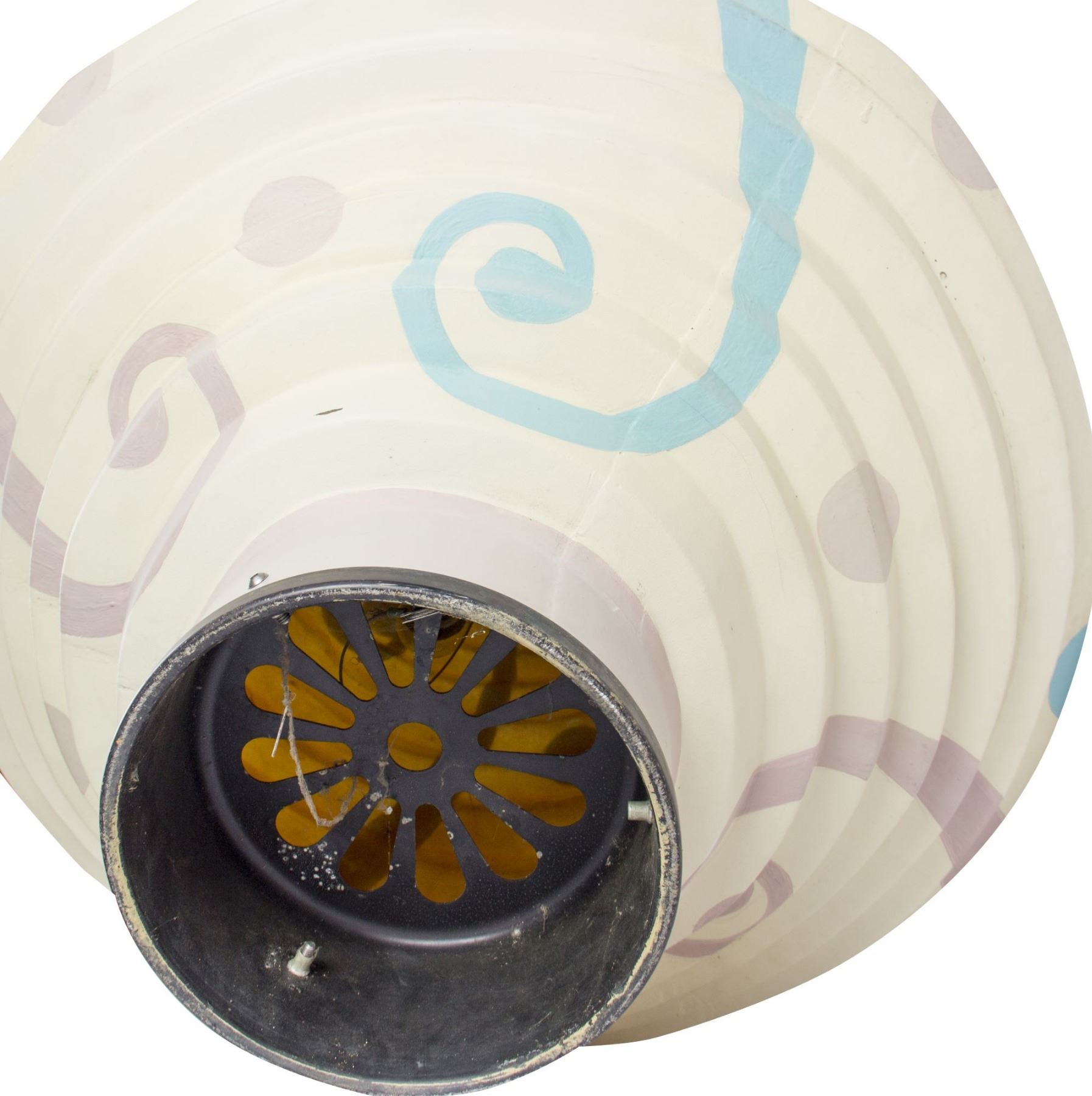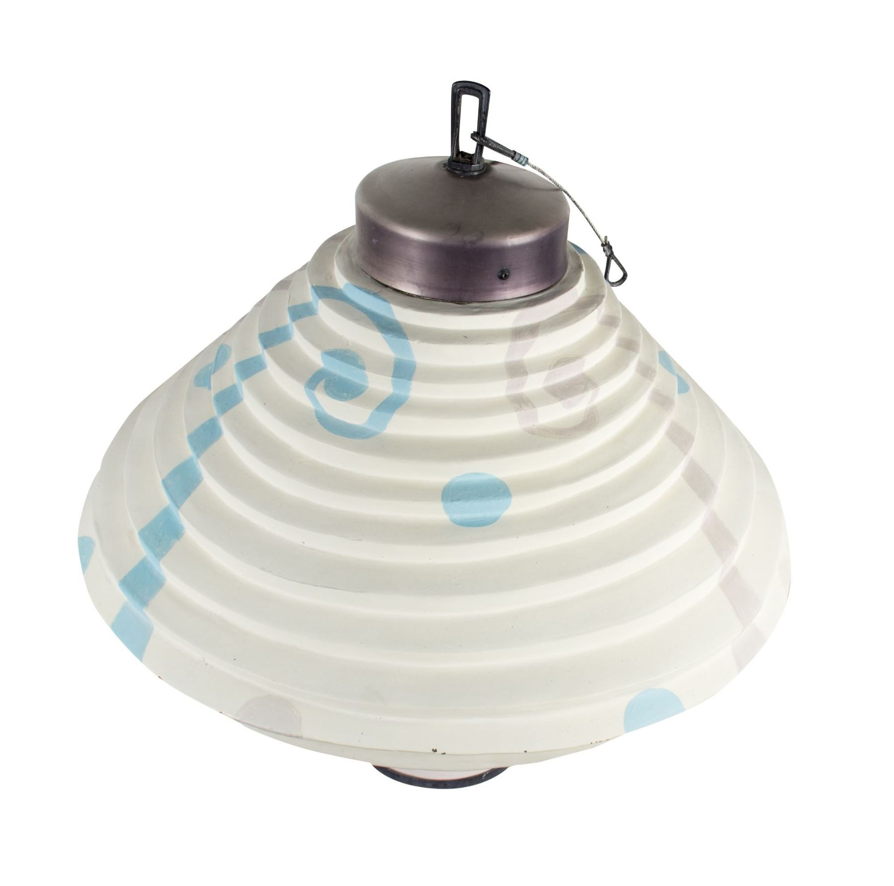 (Disneyland, c.1990s) An original hanging lantern prop used in the "Mad Tea Party" attraction, featuring a blue and grey swirl design. These large hanging lanterns feature patterns and colors in a similar fashion to the tea cups themselves, and are a very memorable and stylish part of the attraction. The lantern measures approximately 32" in diameter and 34" tall, and is in good functioning condition with a new electrical cord.