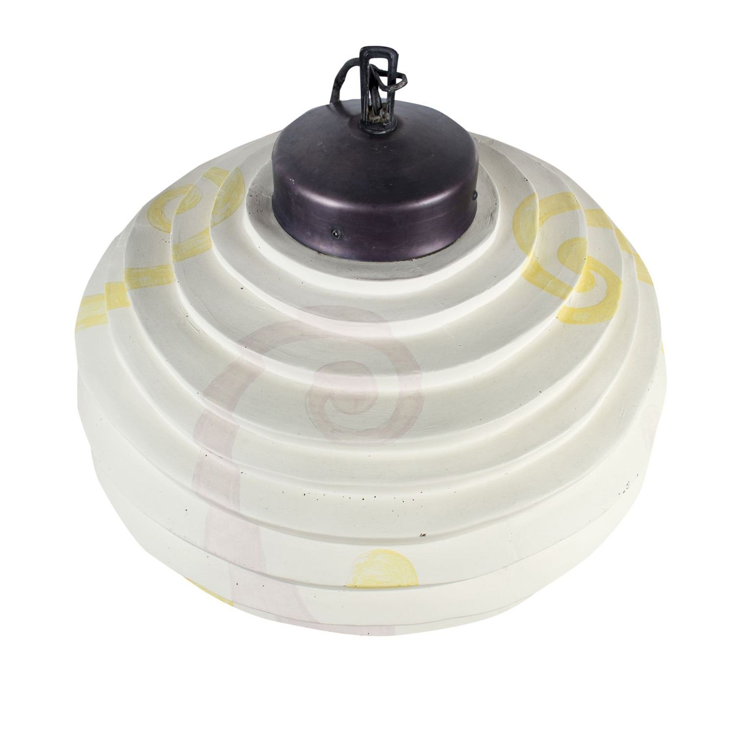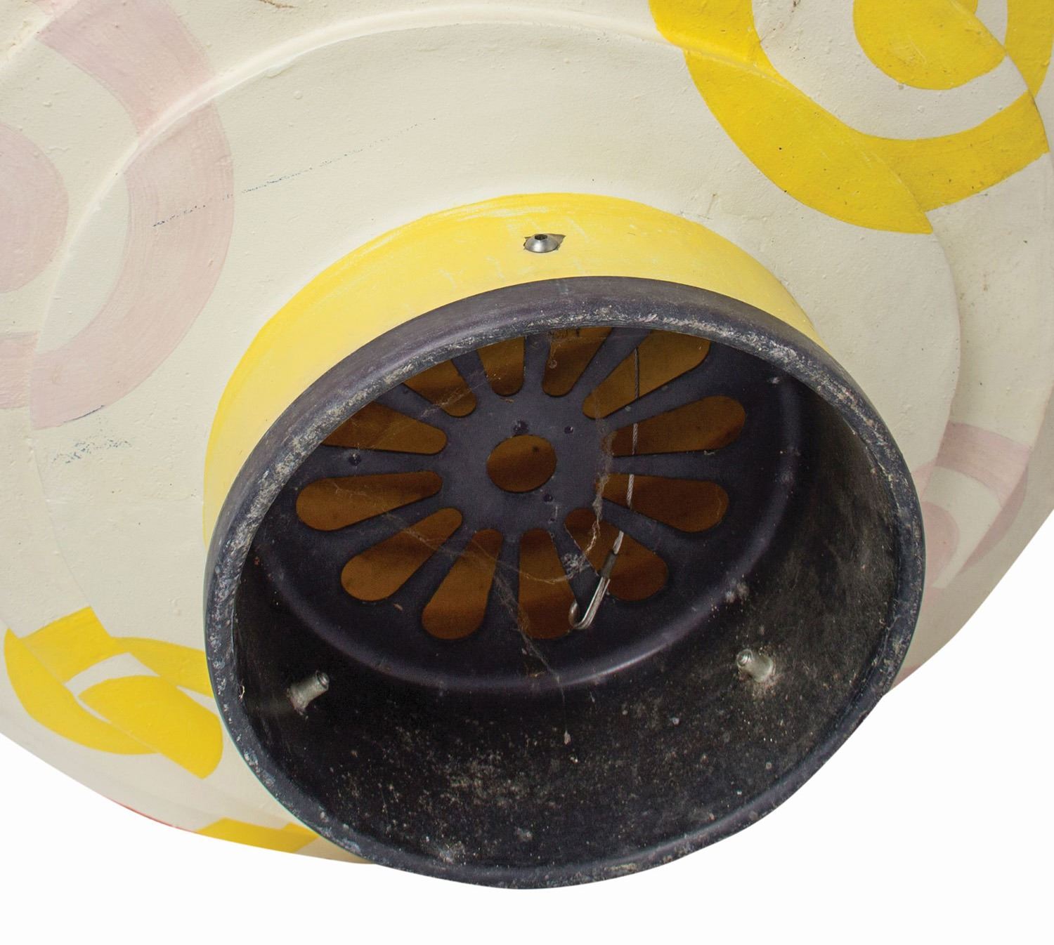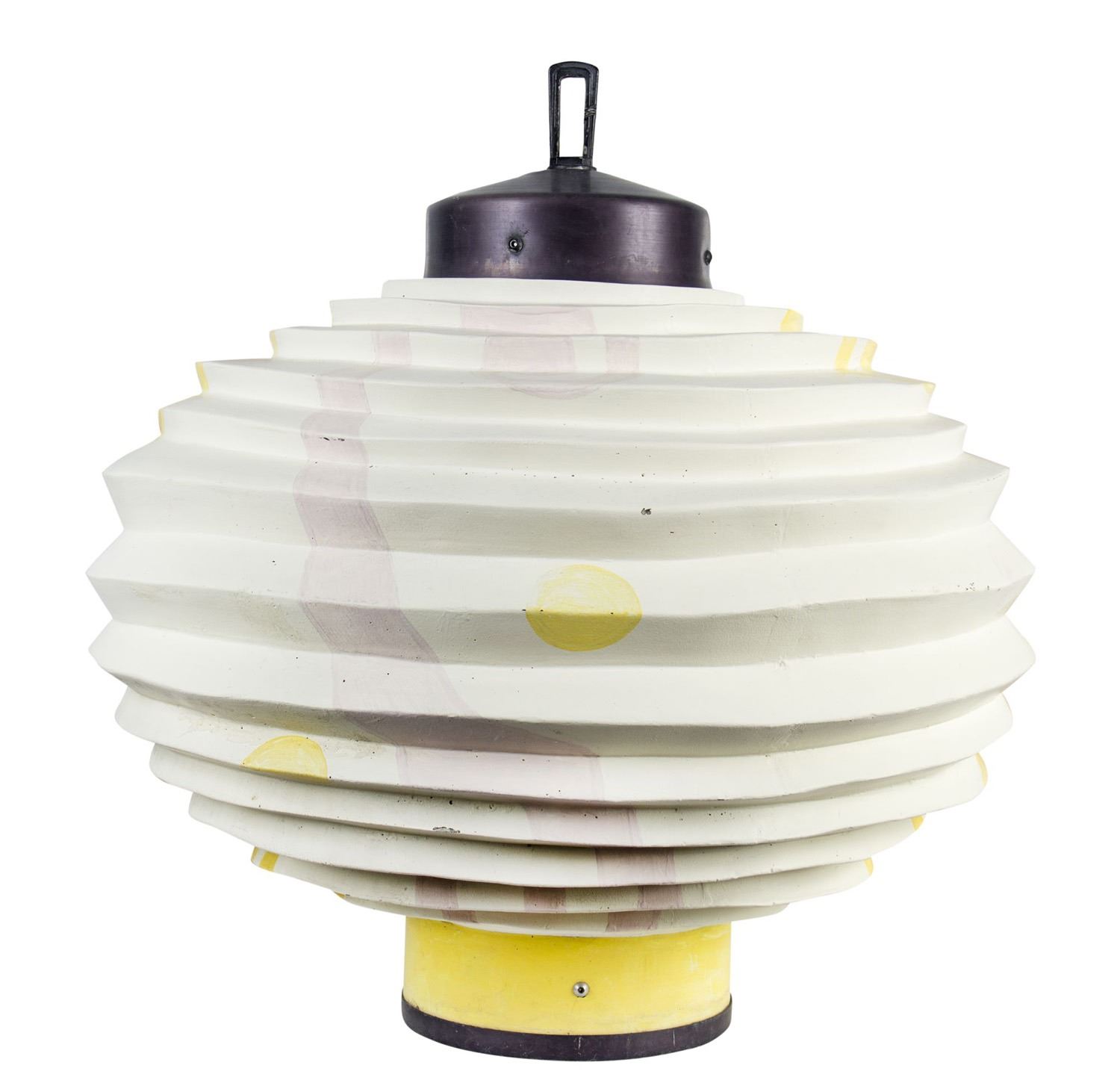 (Disneyland, c.1990s) An original hanging lantern prop used in the Mad Tea Party attraction. These large hanging lanterns feature patterns and colors in a similar fashion to the tea cups themselves, and are a very memorable and stylish part of the attraction. This particular lantern features a pink and yellow swirl design and measures approximately 27" in diameter and 28" tall. The lantern is in good functioning condition with a new electrical cord. Special shipping arrangements may apply. Please inquire for details and estimates.