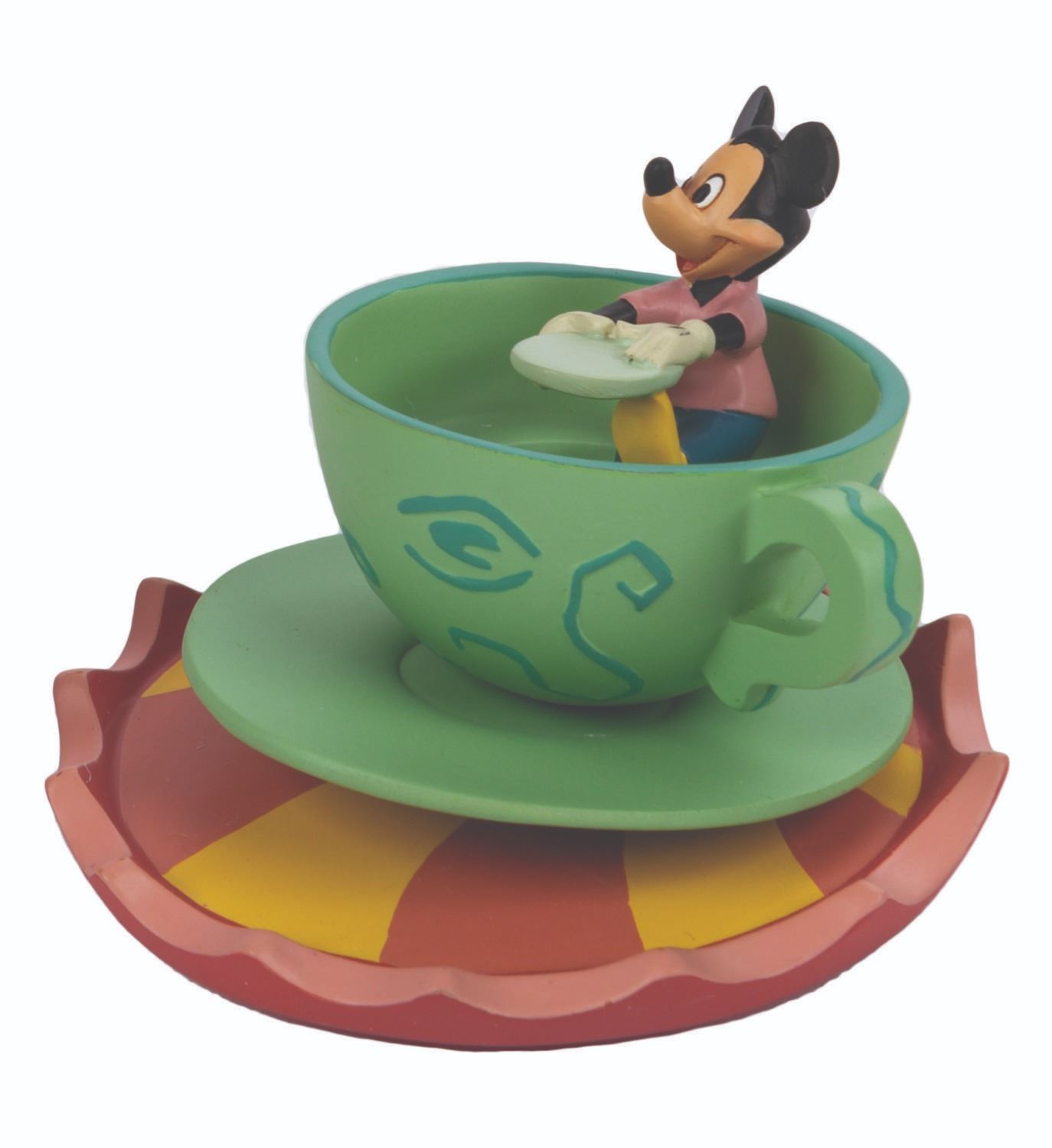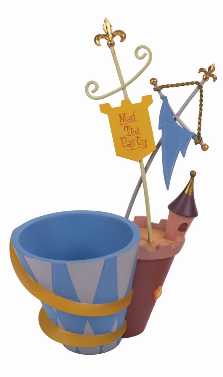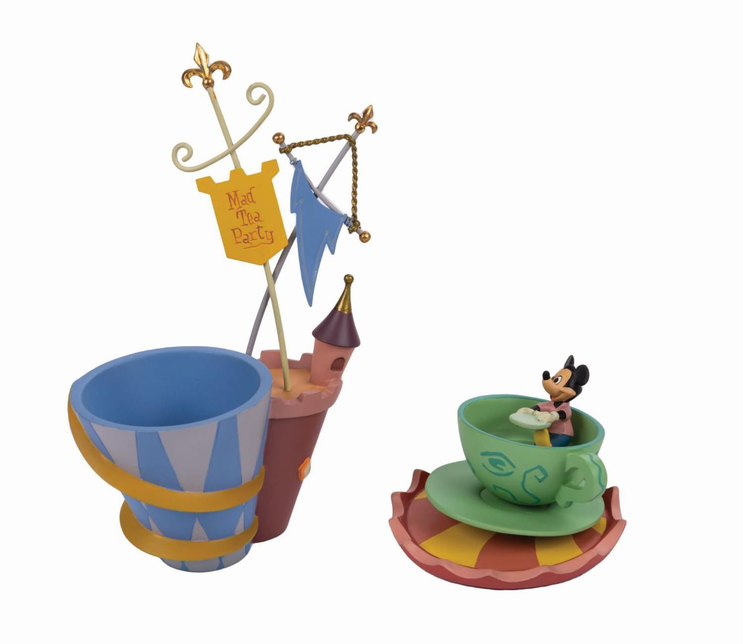 (Disneyland, c.2005) A limited edition "Mad Tea Party" trinket box set designed and sculpted by Kevin Kidney. This 2-piece trinket box set features (1) dimensional whimsical tower topped with Fantasyland standard, Mad Tea Party banner, and metallic Fleur-de-lis finials, and (1) Mickey Mouse going for a spin in a Mad Tea Party Saucer. The set is hand-numbered "0086" of 1955 retaining both its original Certificate of Authenticity and box. Measuring 7"x8.5" and 4.75" tall, the souvenir in very fine condition with some wear to the outer box.