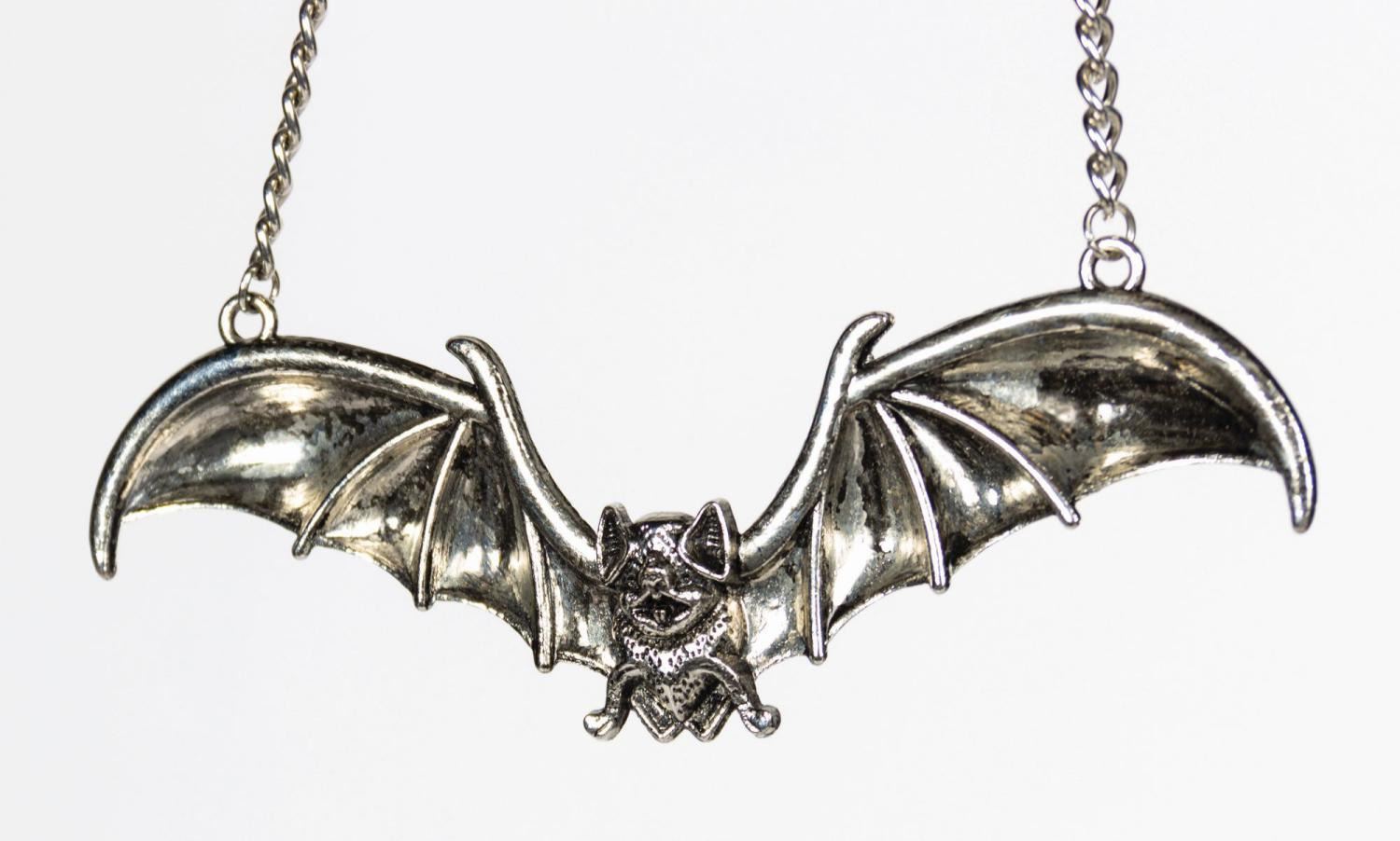 (Universal, c.1960s) An incredible replica of Lilly Munster's Bat Necklace that was given to Mae West by movie legend Yvonne Di Carlo. This silver plated necklace was owned and worn by West, and the necklace appears in two books by Michael J. Kouri. The long silver plated chain secures the bat by its wings. The bat itself measures 1"x5" and is in good condition with some chipping on the inside of the wings and some minor wear from use.