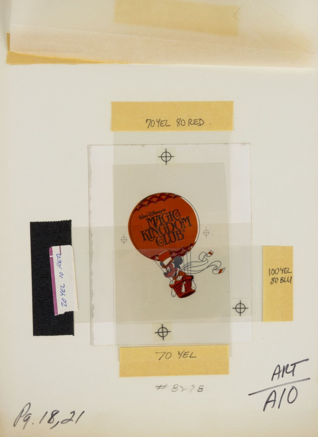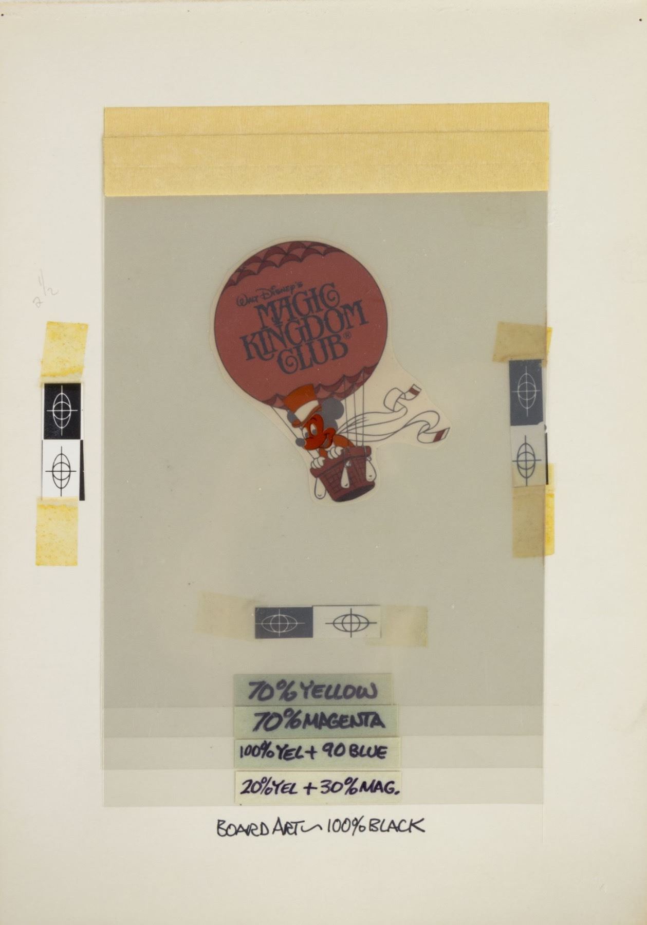 (Disneyland, 1970s) A grouping of artwork used to promote Disneyland's Magic Kingdom Club in the mid-to-late 1970s. This set includes matching imagery of Mickey Mouse in a hot air balloon, and includes (2) layered color separations, (1) negative cel layer, and (3) matching photostat images. The color separations feature several layers on artist's board and include notes to help depict which colors are to be used in which areas of the illustration. One of the color separation boards is marked "Pg. 18, 21" in reference to its use in a 1978 issue of "Disney News" magazine. This set ranges in size from the 5.5"x4.5" negative cel layer to the 12"x8" color separation board. The set is in very good condition with some expected wear from use.