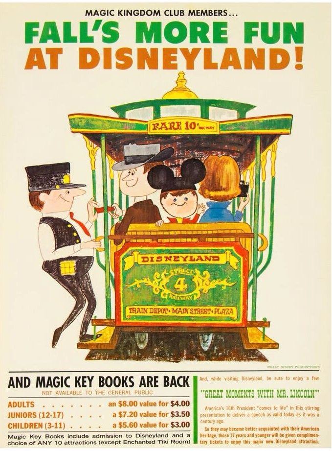 (Disneyland, 1965) A stylish rare poster advertising ticket book offers exclusive to the Magic Kingdom Club. The poster features a beautiful illustration of the Main Street Trolley and lists special ticket book prices below. This item measures 12"x9" and is in fine condition.