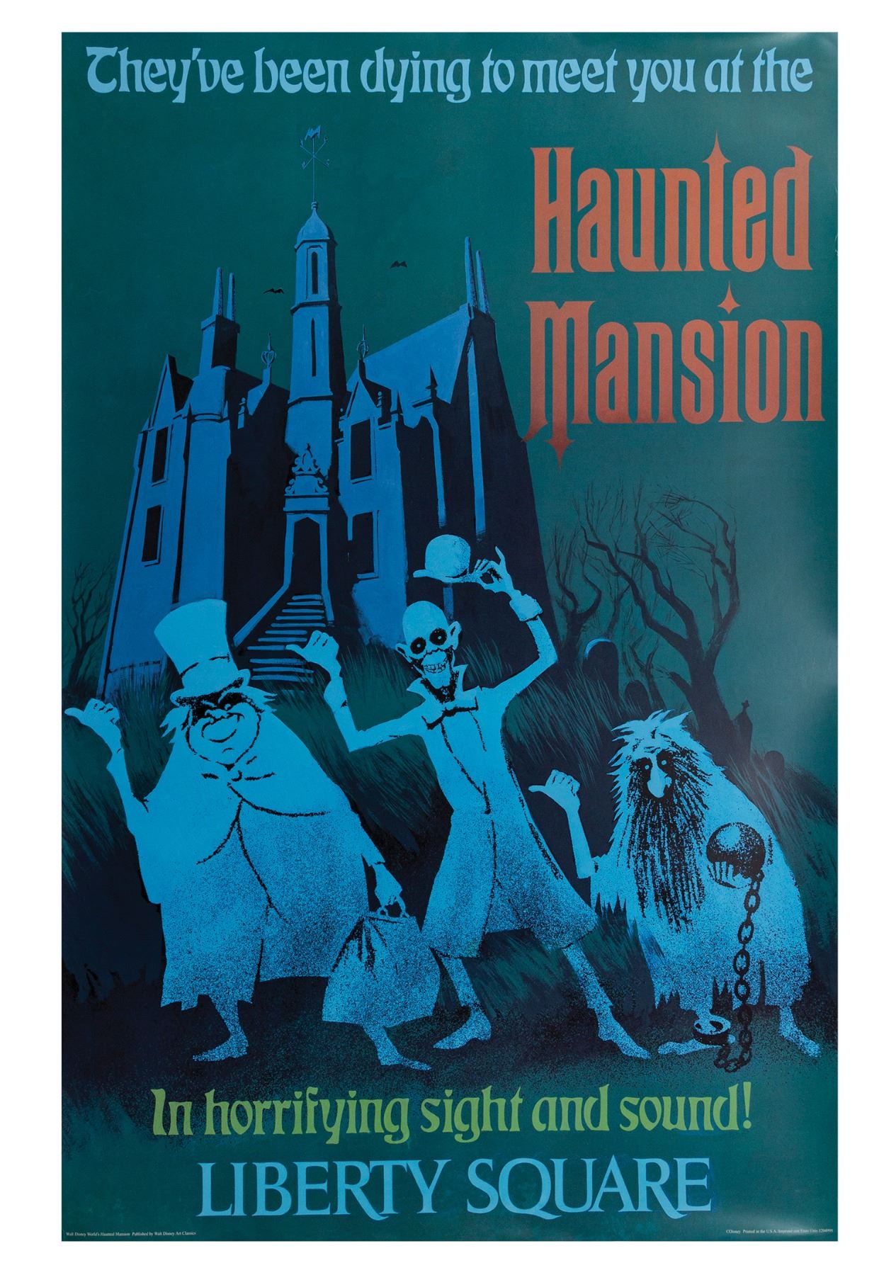 (Walt Disney World, c.2000s) A printed Haunted Mansion attraction poster produced by Walt Disney Art Classics. The poster features the design from the Magic Kingdom's version of the attraction, and depicts the fan-favorite Hitchhiking Ghosts. The poster comes rolled in its original tube and measures 36"x24". The condition is very good with some minor creasing at the edges.