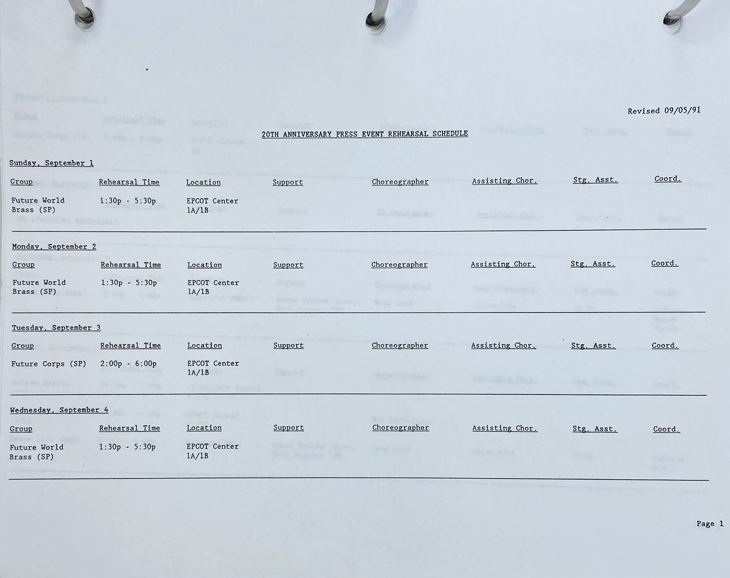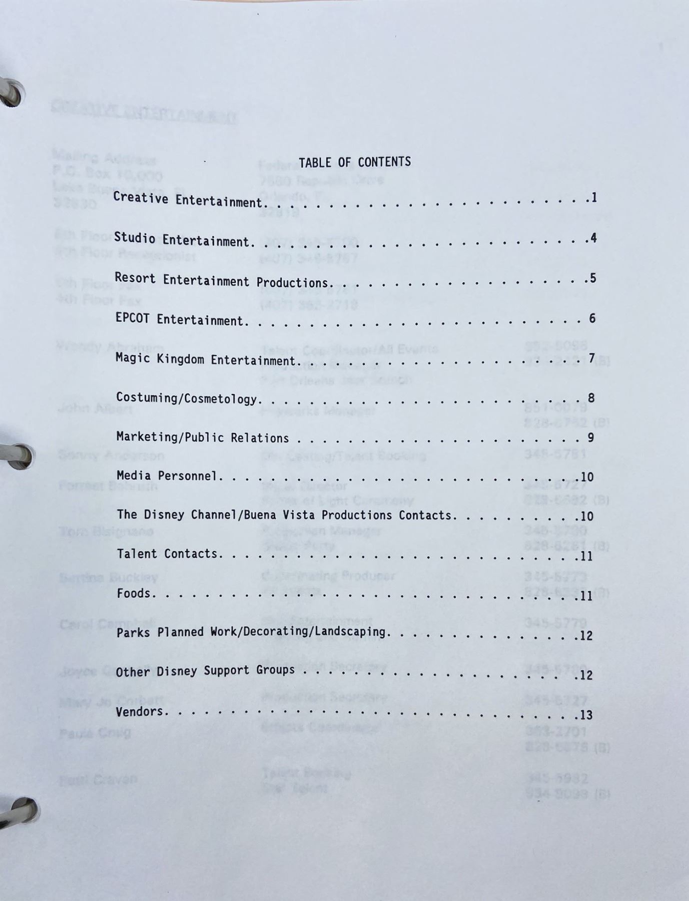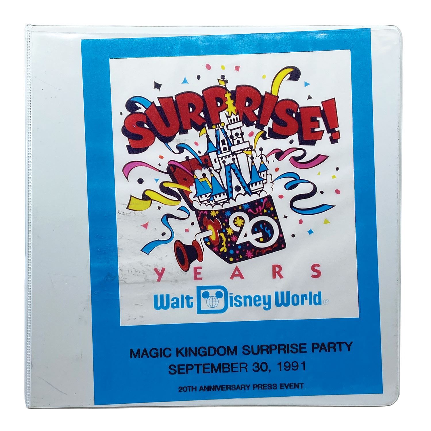 (Walt Disney World, 1991) A binder containing production materials for the Magic Kingdom Surprise Party, which was a press event leading up to the park's rededication for its 20th anniversary. The binder contains contact sheets, an event itinerary, a production schedule and rehearsal schedule, as well as breakdowns of performance information for each stage. The detailed information in this binder provides a fascinating glimpse of the production process for a Walt Disney World event. Measuring 11.5"x11" and 3" tall, the binder is in very good condition with expected wear from age and use, including some residue on the cover.