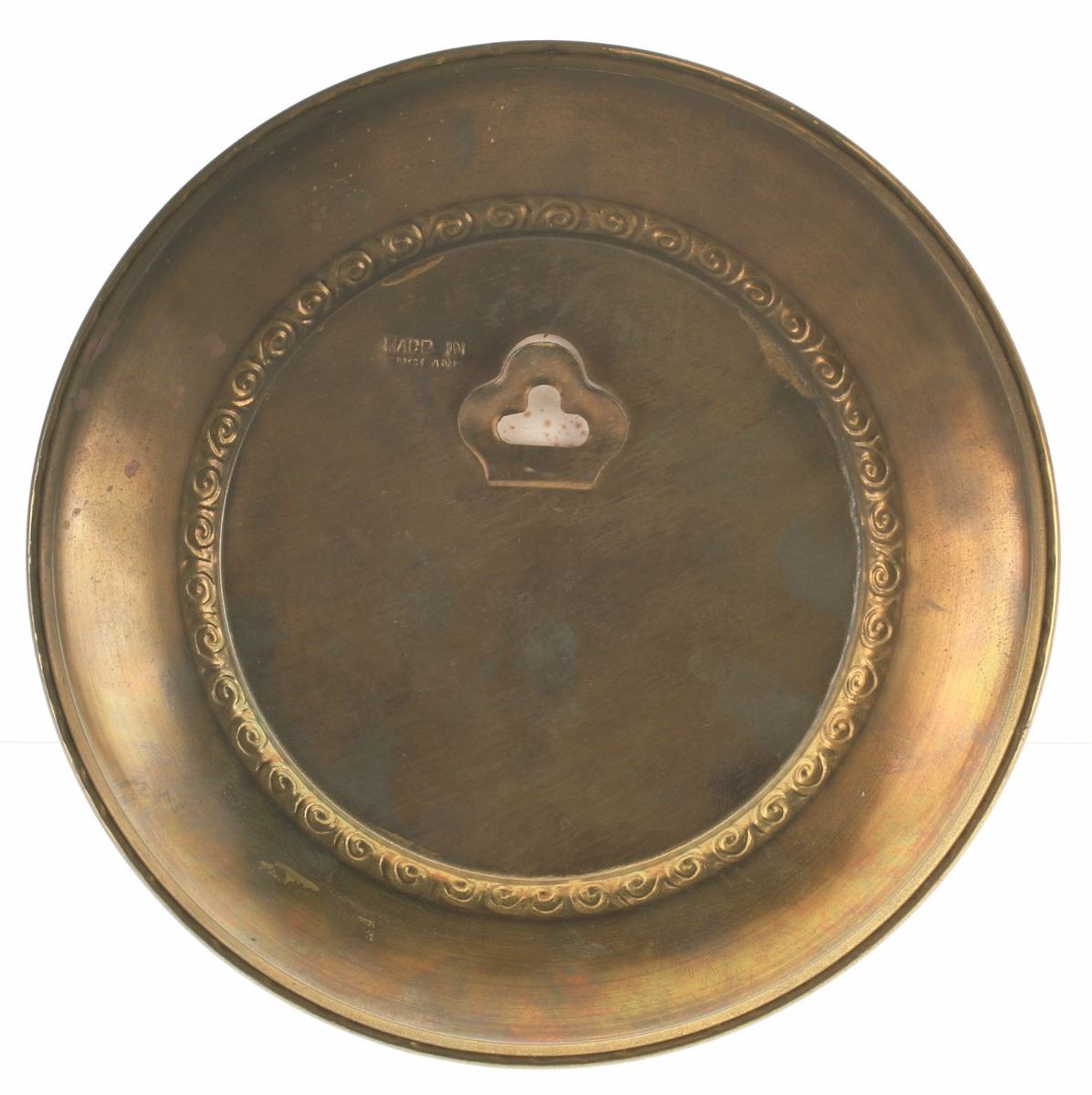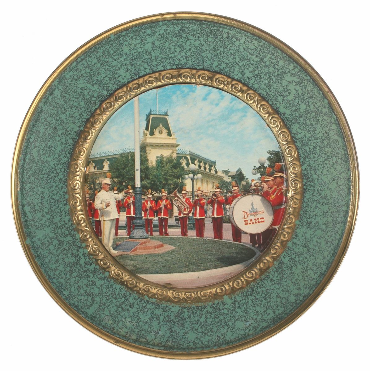 (Disneyland, 1950s) Small decorative wall plate featuring an image of the Disneyland Band on the front. Measures 5.5" in diameter and 0.75" tall. In good condition with minimal wear.