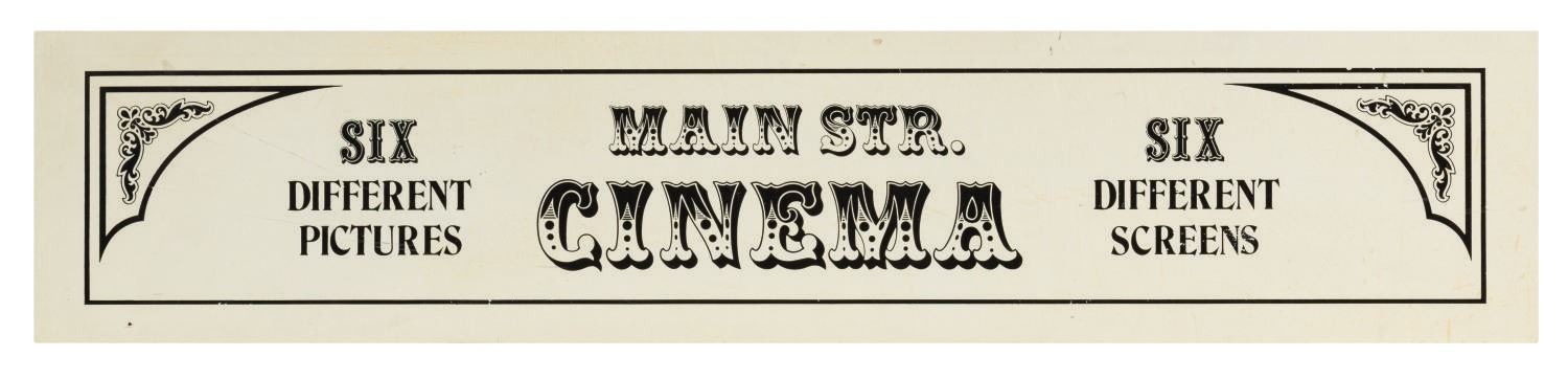 (Disneyland, c.1990s) A sign used within the Main Street Horse-Drawn Streetcar that advertised the Main Street Cinema. The vintage-style sign promoted the "six different screens" and "six different pictures" of the Main Street Cinema, and is patterned after the overhead placards that once decorated the canopies of actual 19th century streetcars around the United States. Measuring 6.25"x21.75", the flexible acrylic sign with screen printed characters is in very good condition, exhibiting minor surface scuffs from use.