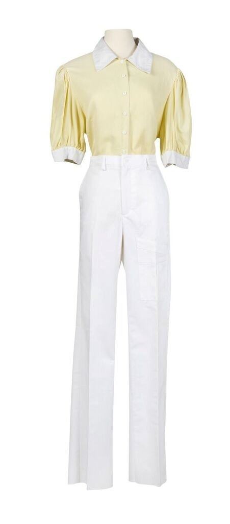 (Walt Disney World, 2000s) A female cast member costume from the "Main Street Confectionary" at Walt Disney World. This costume was worn by cast members who could be seen cooking a wide variety of colorful sweets for guests to enjoy. This costume includes the yellow and white blouse and white pants, both of which still retain their original Disney wardrobe tags. The blouse is a women's size XL and the pants are size 30. This costume is in very good condition with some wear from use including a small hole in the sleeve and a few faint discoloration spots on the pants. The outer size tag is still adhered to the pants.