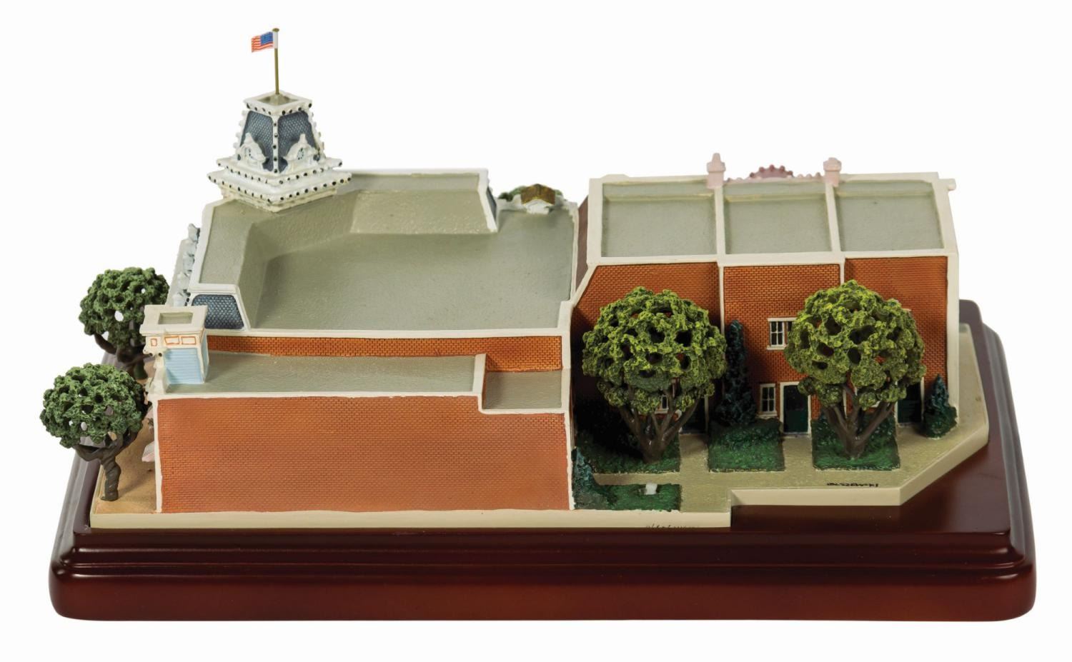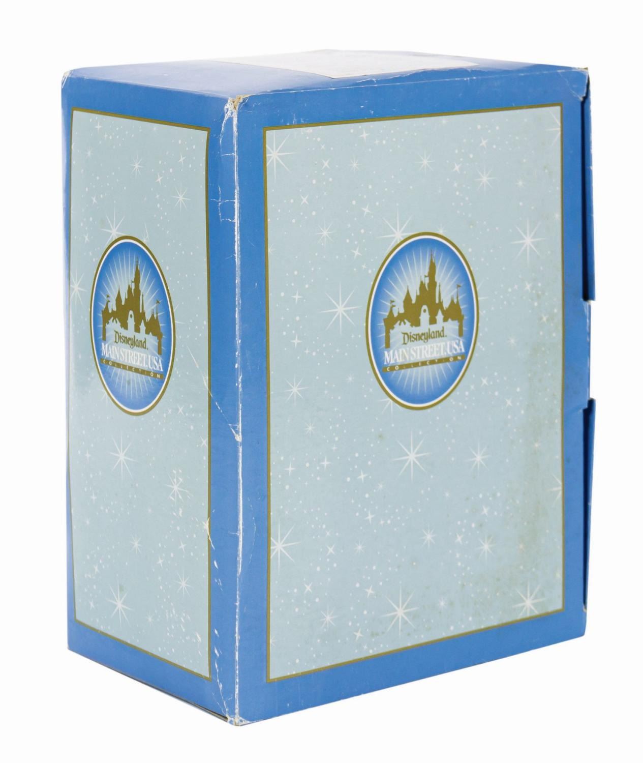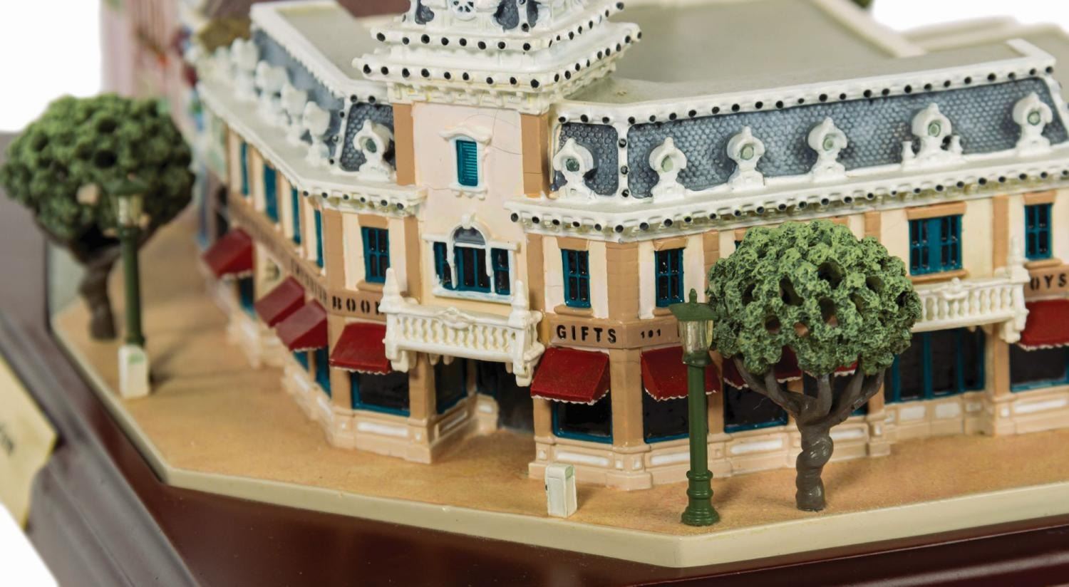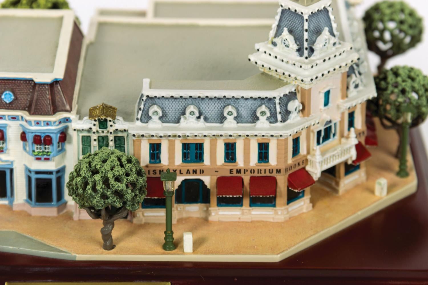 (Disneyland, 2004) A beautiful first edition scale model of Disneyland's Emporium located on Main Street. This model was created by renowned miniaturist Robert Olszewski for his very popular Main Street, U.S.A. collection of models. This model has lighted elements that are powered by a battery compartment in the base. The model is a first edition and comes in its original box, with a power cord and a certificate of authenticity. Measuring 6.25"x9.5" and 4.25" tall, the model is in fine condition with minor wear from previous display. There is some staining and surface wear on the box, and minor tearing at the corners.
