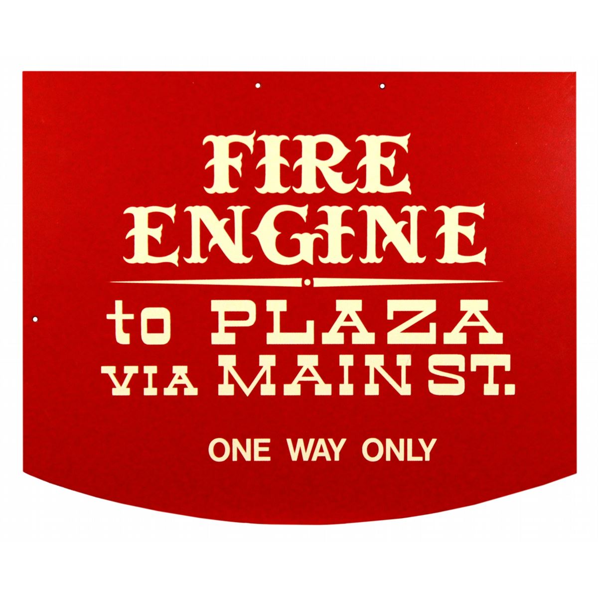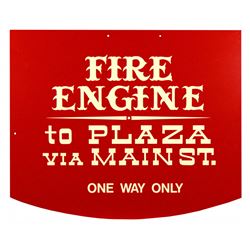 (Disneyland, 1970/80s) Hand-painted metal hanging sign that was made to be mounted to one of the two stops for the Main Street Fire Engine between Town Square and the hub plaza. At each stop, there was a flanged sign for the attraction with the name and price for admission. Measuring 15.5 x 19 in., this sign was most likely unused. In fine condition.