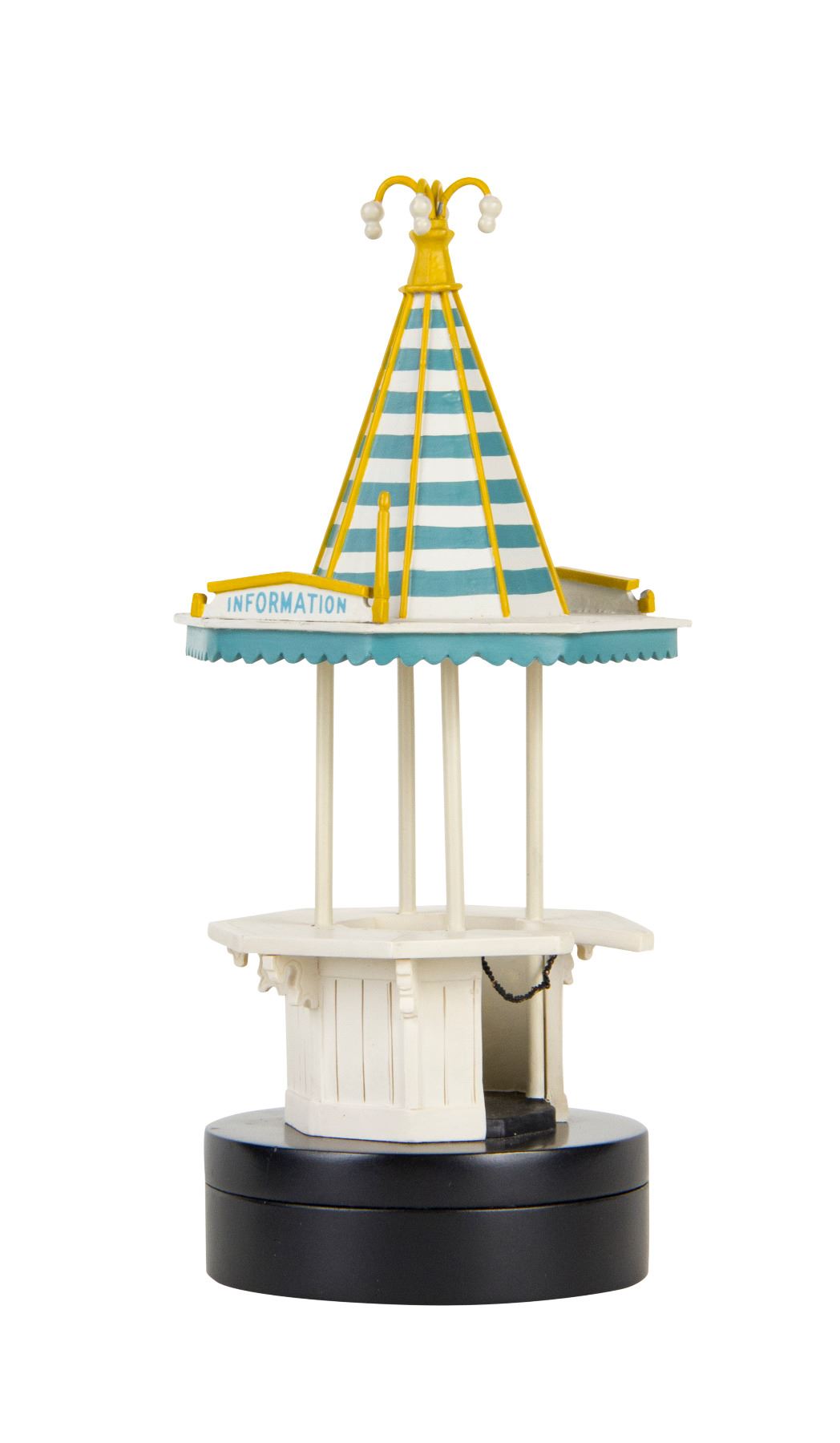 (Disneyland, 2005) A replica of a Disneyland information booth that once adorned Main Street USA. Sculpted by Kevin Kidney and Vladimir Petrov, this replica was created in resin and metal in a limited edition of only 1,000. The replica measures approximately 7.25" tall and the condition is fair to good, with a couple missing "information" signs and sign spikes along the top of the booth. This particular replica may have been a production sample, as the base has some notation written on a piece of tape, and the lid of the base has been adhered on so it cannot be lifted off.