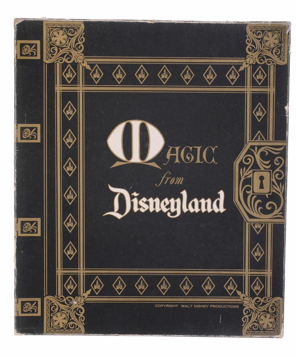 (Disneyland, 1960s) An absolutely stunning bit of Disneyland ephemera from one of the most elusive of the Main Street shops. This large "Magic from Disneyland" shopping box was used to assemble and sell magic kits as well as for special large purchases. The top of the box is made to appear as an antiquarian book, complete with keyhole lock. This box is extremely rare and measures 12.25"x5.25" and 14.25" tall. In good condition overall with some wear throughout. The lid has some clear tape on the corners.