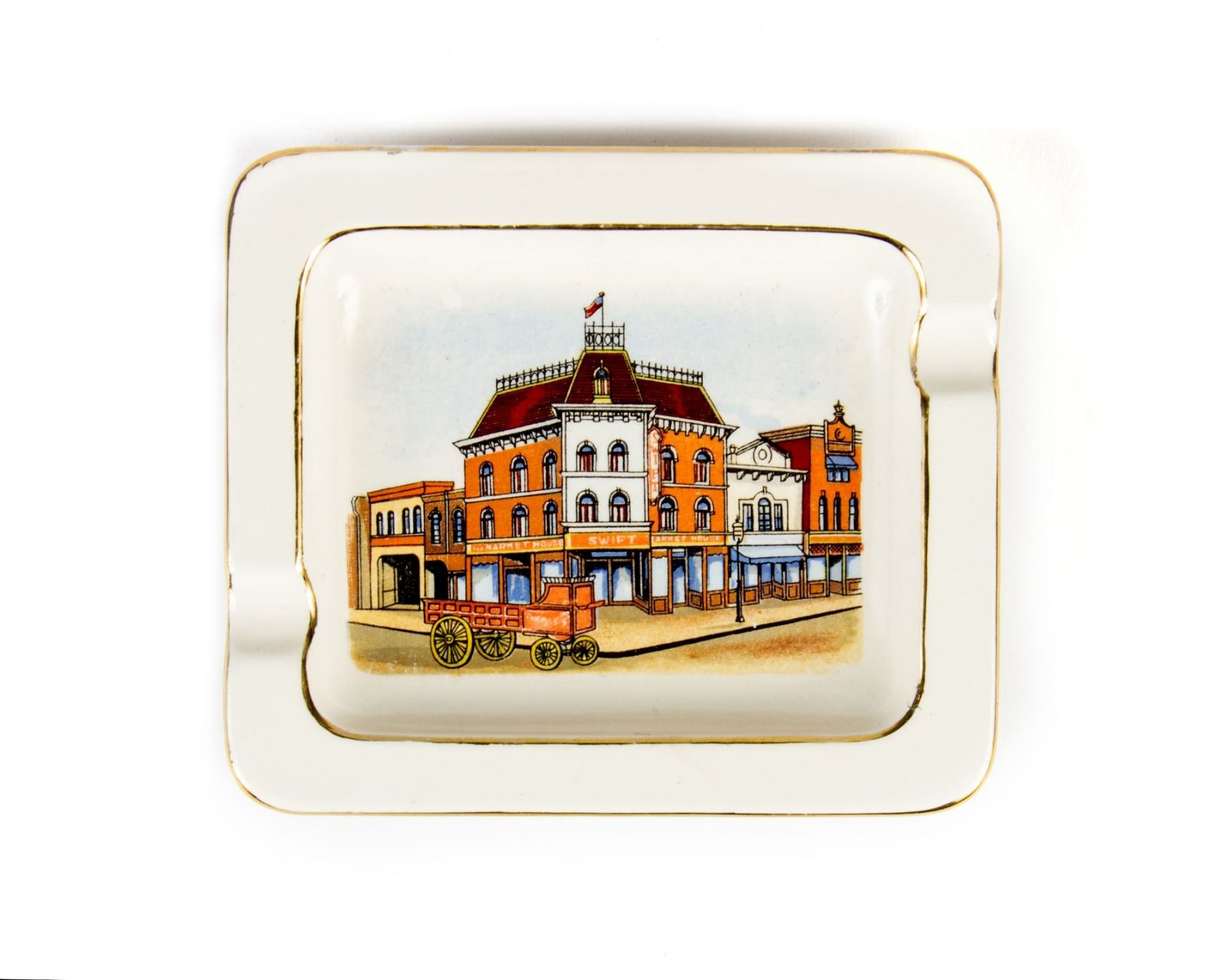 (Disneyland, c.1960s) A souvenir ashtray featuring Main Street's "Market House" sponsored by Swift's Meats. Swift sponsored the "Market House" from 1955 to 1970, and this ashtray beautifully captures the feel of this early Disneyland location. Measuring 4.25"x5", the ashtray is in very good condition with minor wear.