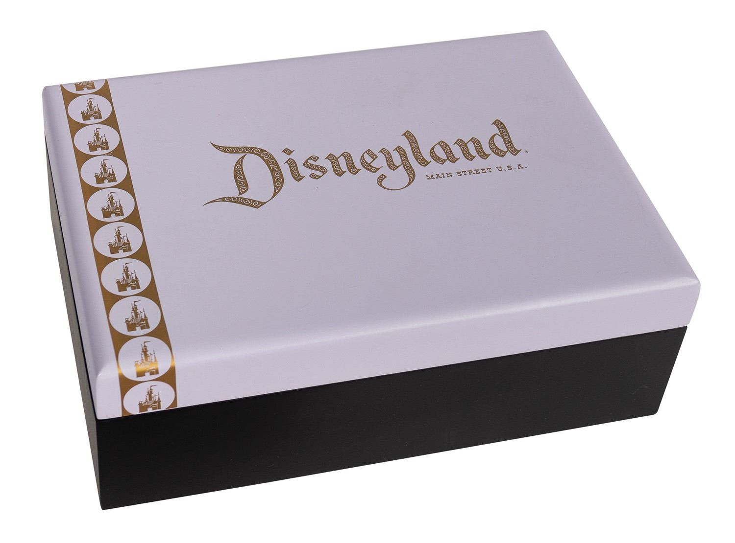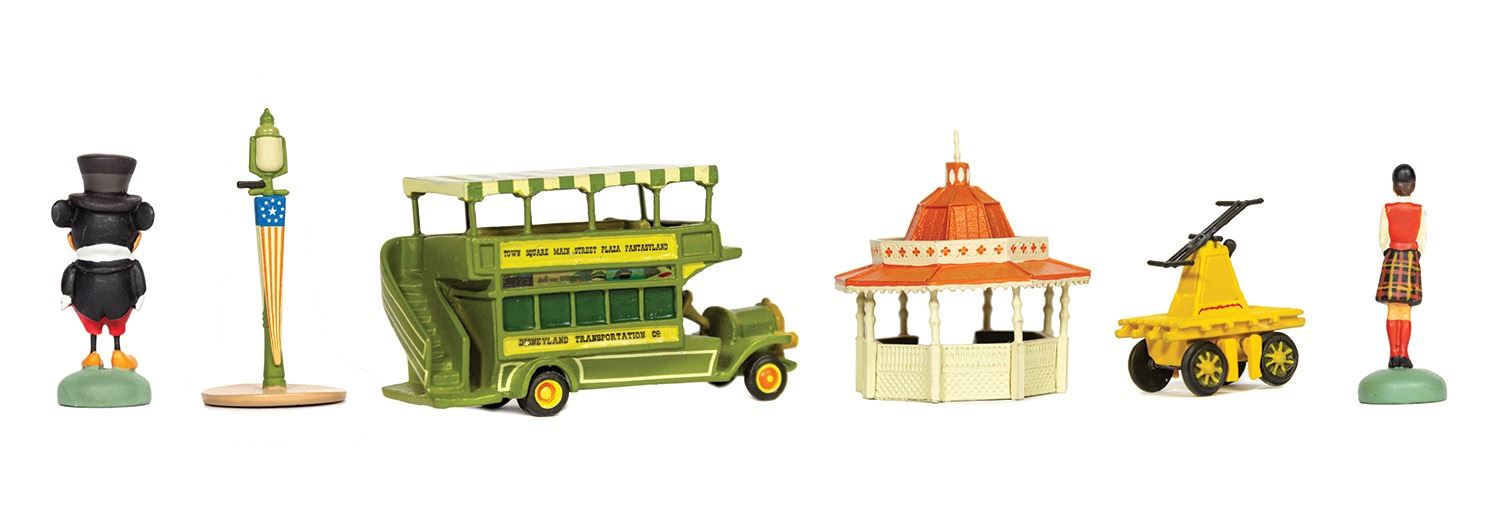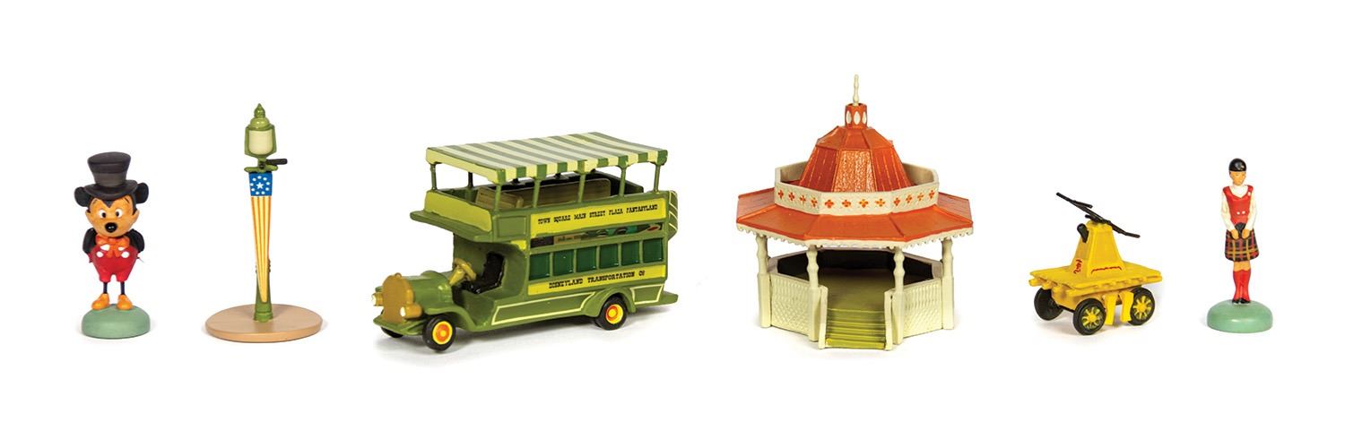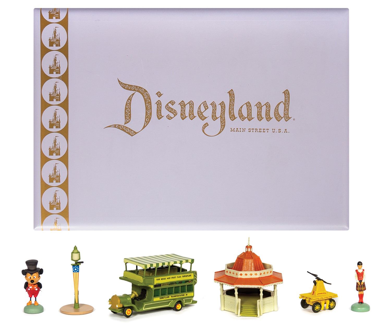 (Disneyland, 2005) This limited edition boxed set of Main Street themed pewter miniatures was created by Kevin Kidney and Jody Daily for Disneyland's 50th anniversary. Limited to only 1500 pieces, this remarkable set includes miniatures of: Mickey Mouse, a Main Street double-decker bus, a gazebo, a lamp post, a railroad handcar, and a cast member tour guide. The boxed set measures 7"x10" and 3.5" tall, and is in very good condition. The original COA is included.