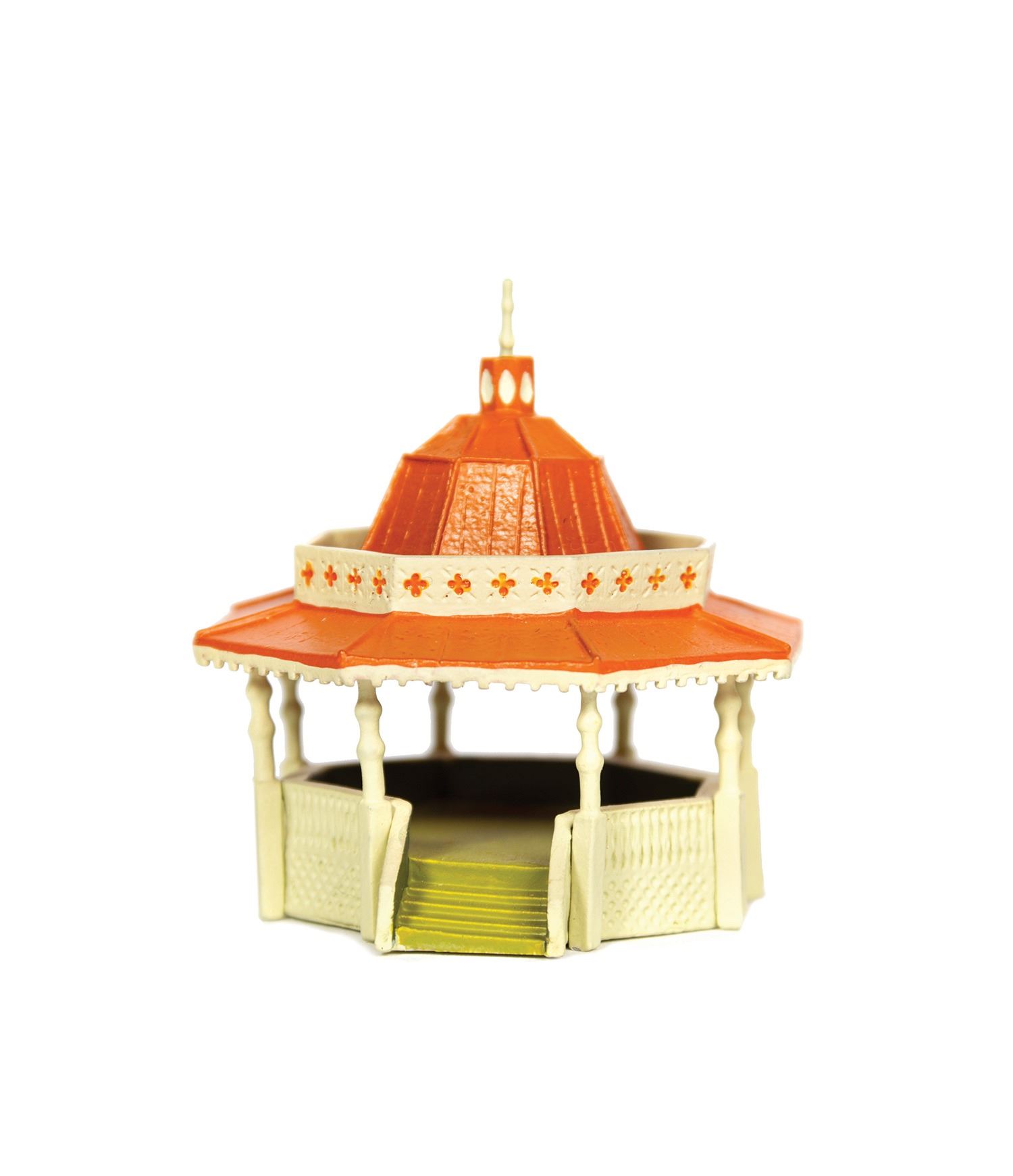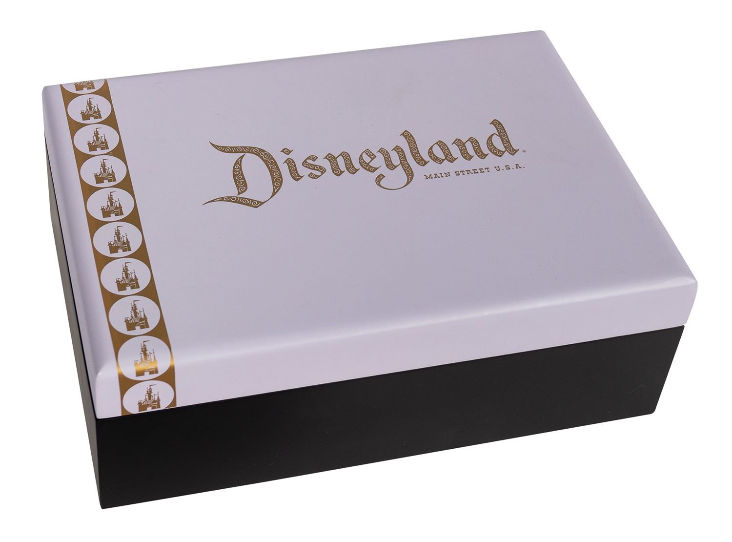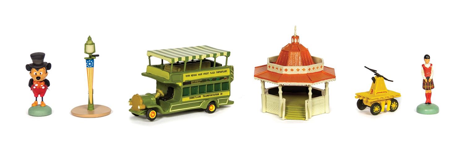 (Disneyland, 2005) This limited edition boxed set of Main Street themed pewter miniatures was created by Kevin Kidney and Jody Daily for Disneyland's 50th anniversary. Limited to only 1500 pieces, this remarkable set includes miniatures of: Mickey Mouse, a Main Street double-decker bus, a gazebo, a lamp post, a railroad handcar, and a cast member tour guide. The boxed set measures 7"x10" and 3.5" tall and is in very good condition. The original COA is included.