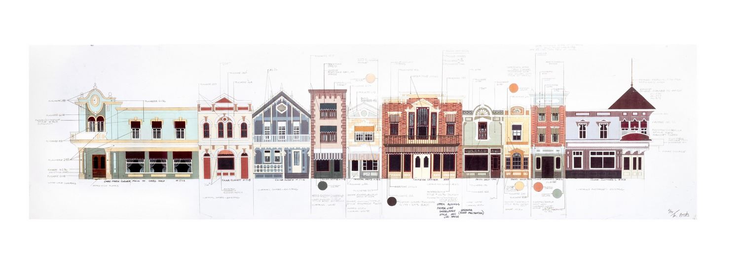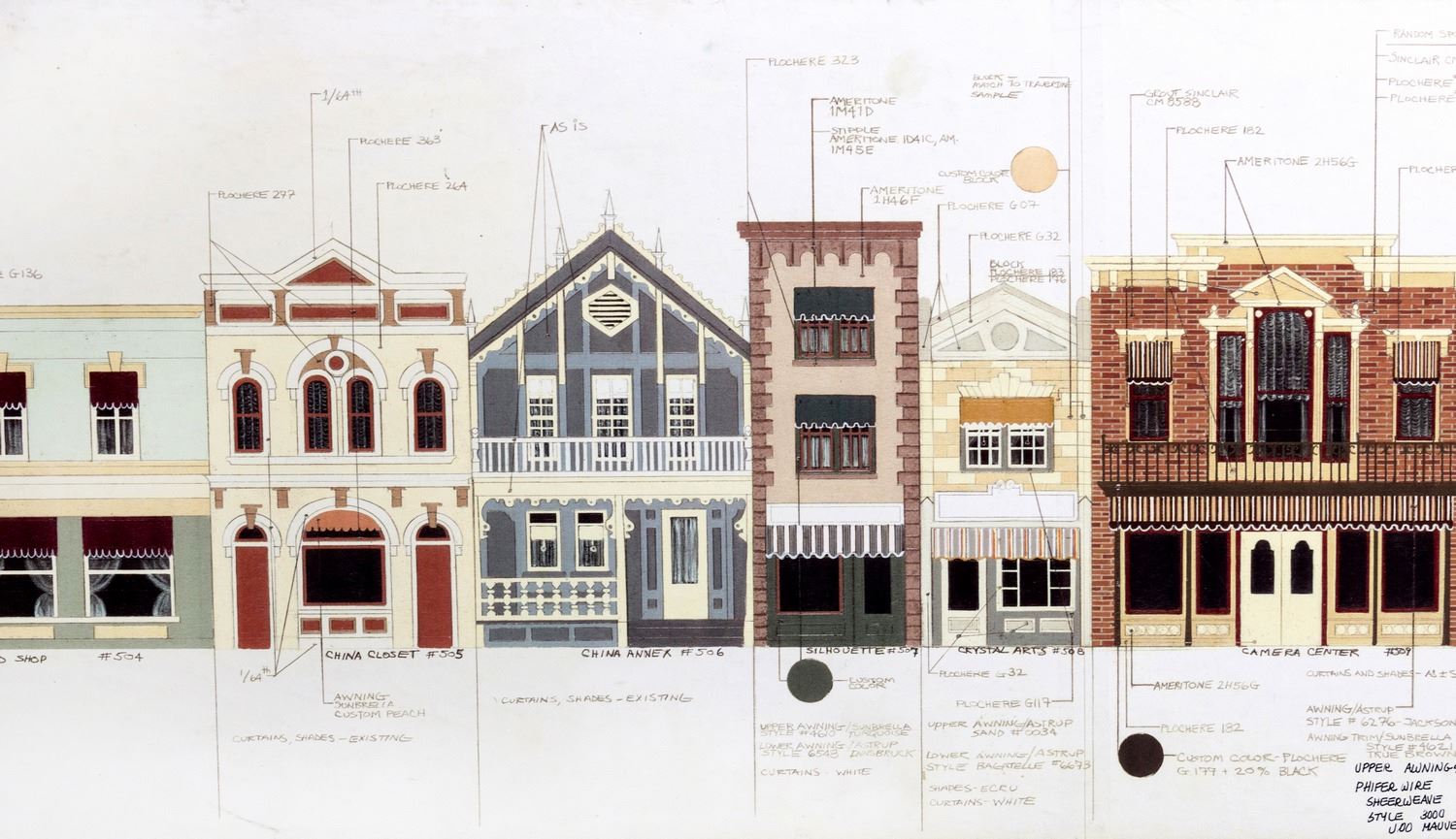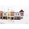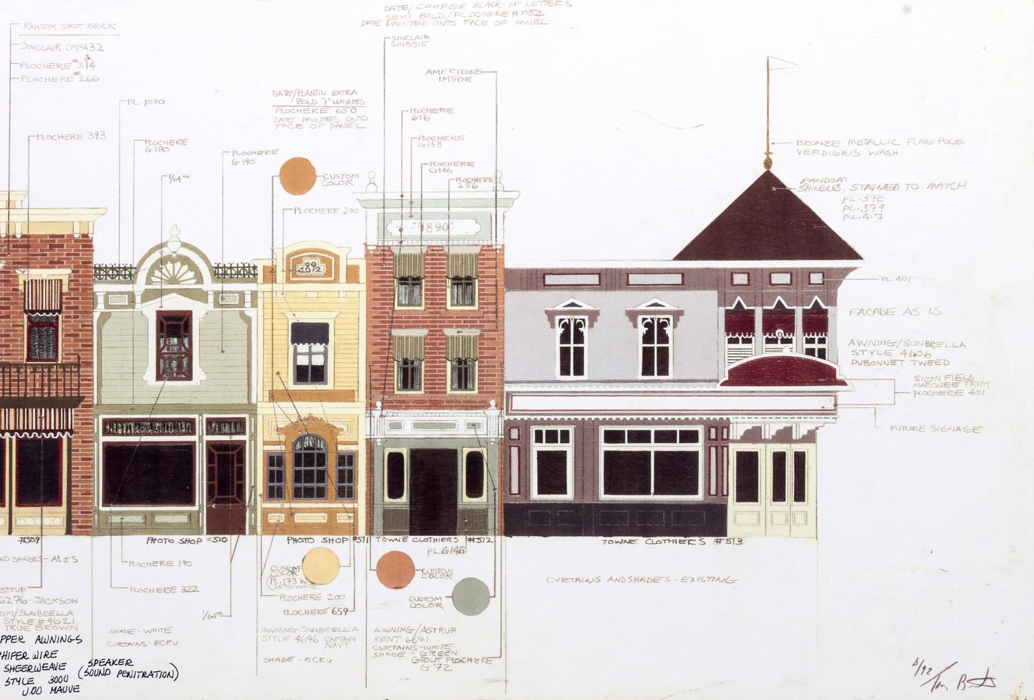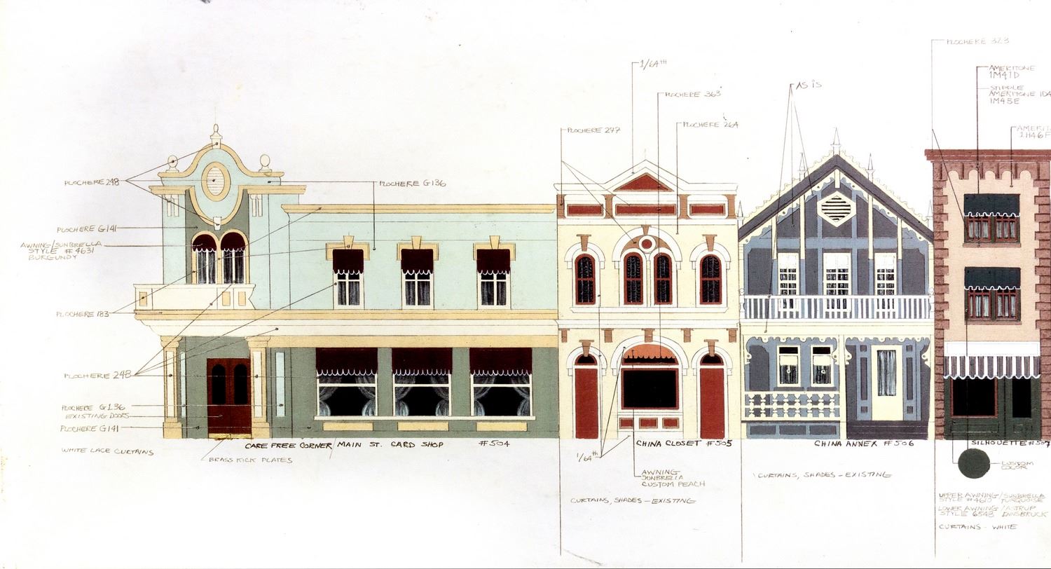 (Disneyland, 1993) A rare studio working print that features the colored elevations for Main Street at Disneyland. This print is mounted to board and was used during a Main Street refurbishment in 1993. The artwork was reproduced from an illustration used on an earlier project, and features additional hand-written notes in ink over the reproduced artwork. The notes along the bottom-edge discuss new details for the awnings including the wire, speakers, and color choices. By using existing artwork from a previous Main Street project, Imagineers could work over, and make notes on, the existing plans without affecting the original artwork. The back of the artwork features the Walt Disney Company copyright mark. This item measures 13"x48.5" and is in good condition with some scuffing and spots of wear from use.