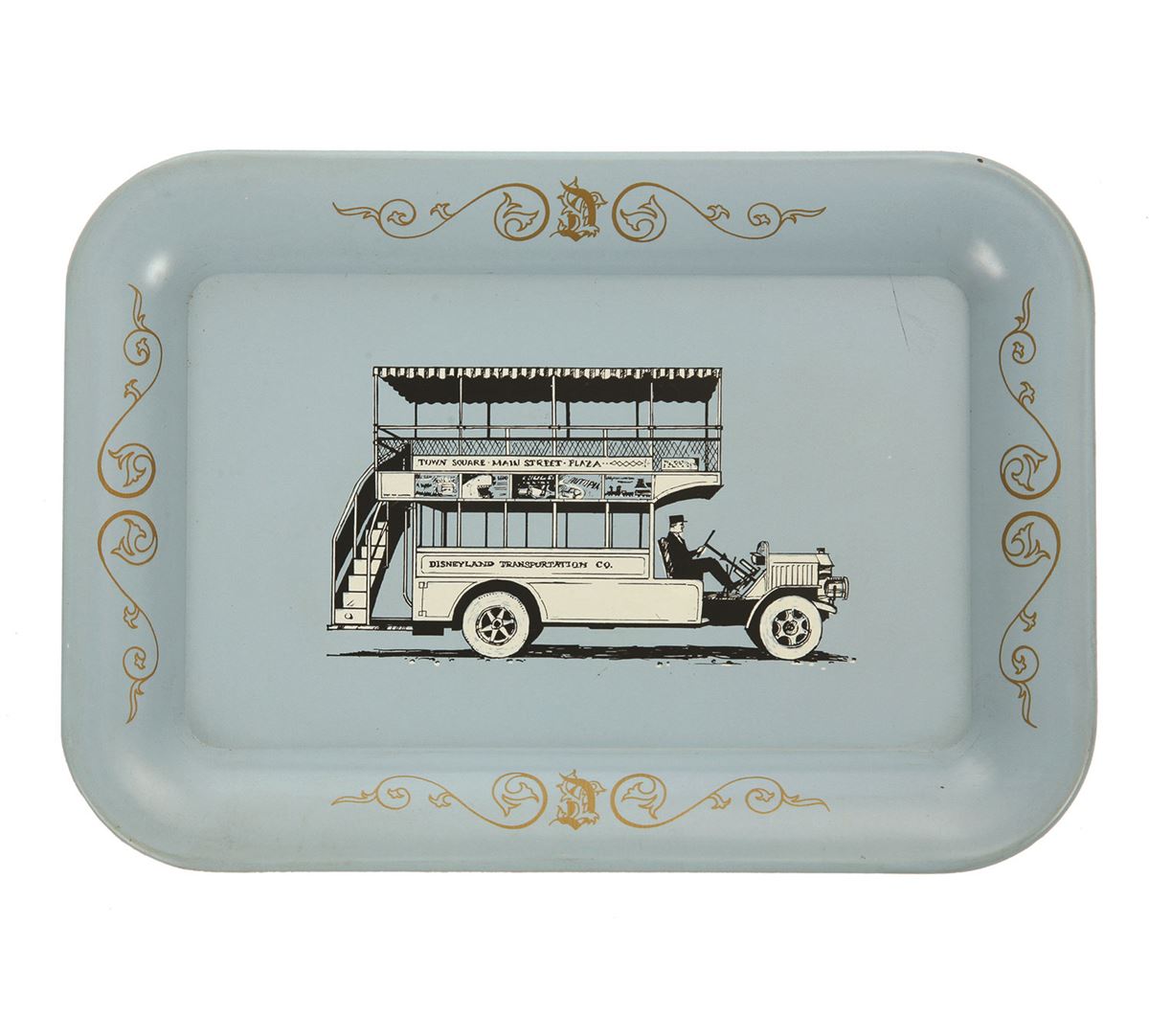 (Disneyland, 1950s)A blue Main Street Souvenir Tin Tray featuring artwork of a the Omni Bus. Made in Japan. Measures 4.75"x6.75". In good condition with some light scratching and Velcro on the back of the tray.