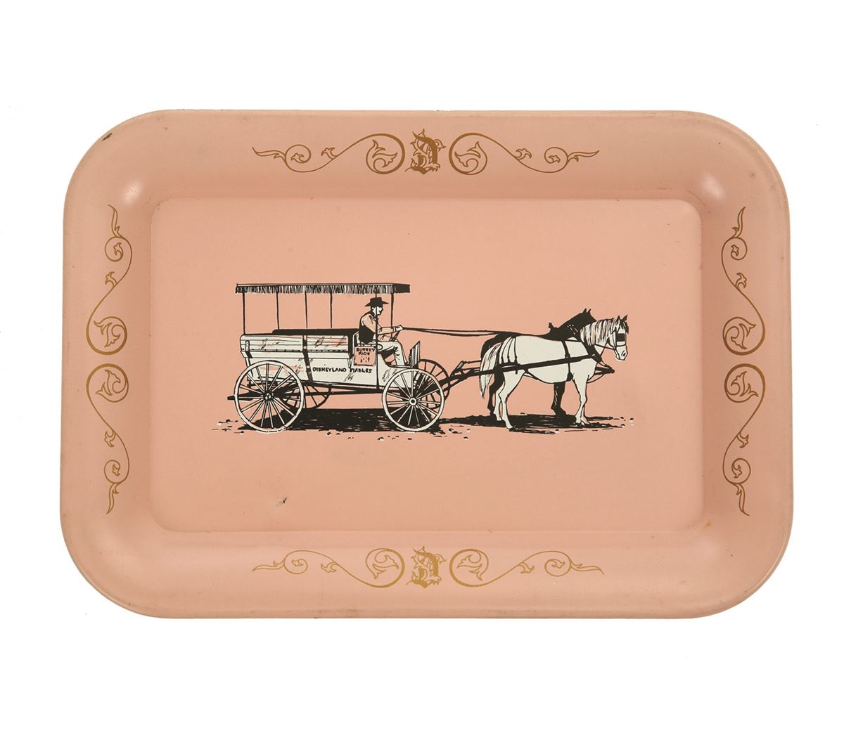 (Disneyland, 1950s) A pink Main Street Souvenir Tin Tray featuring artwork of a Horse and Carriage. Made in Japan. Measures 4.75"x6.75". In good condition with some small dents and light scratching.