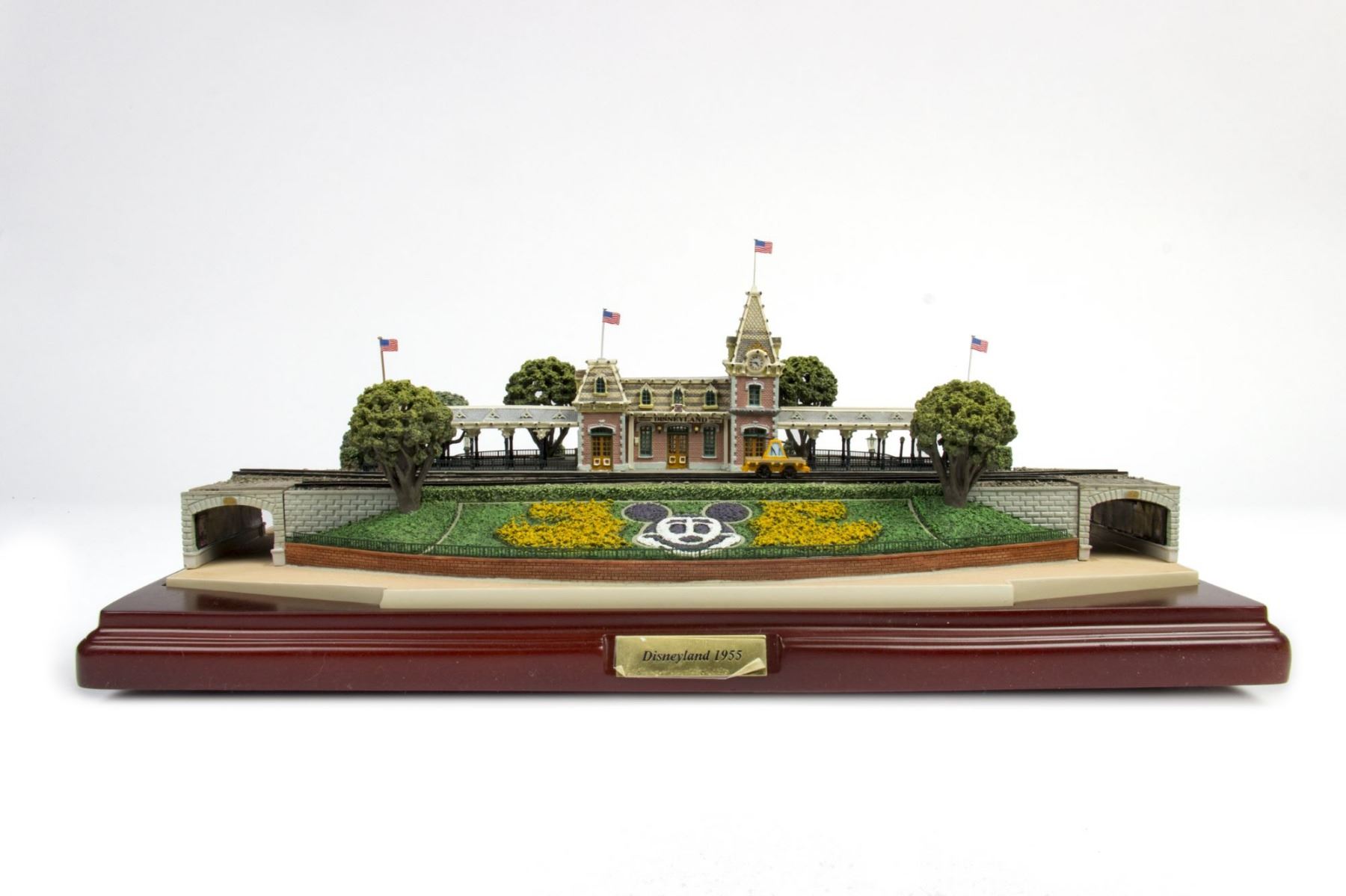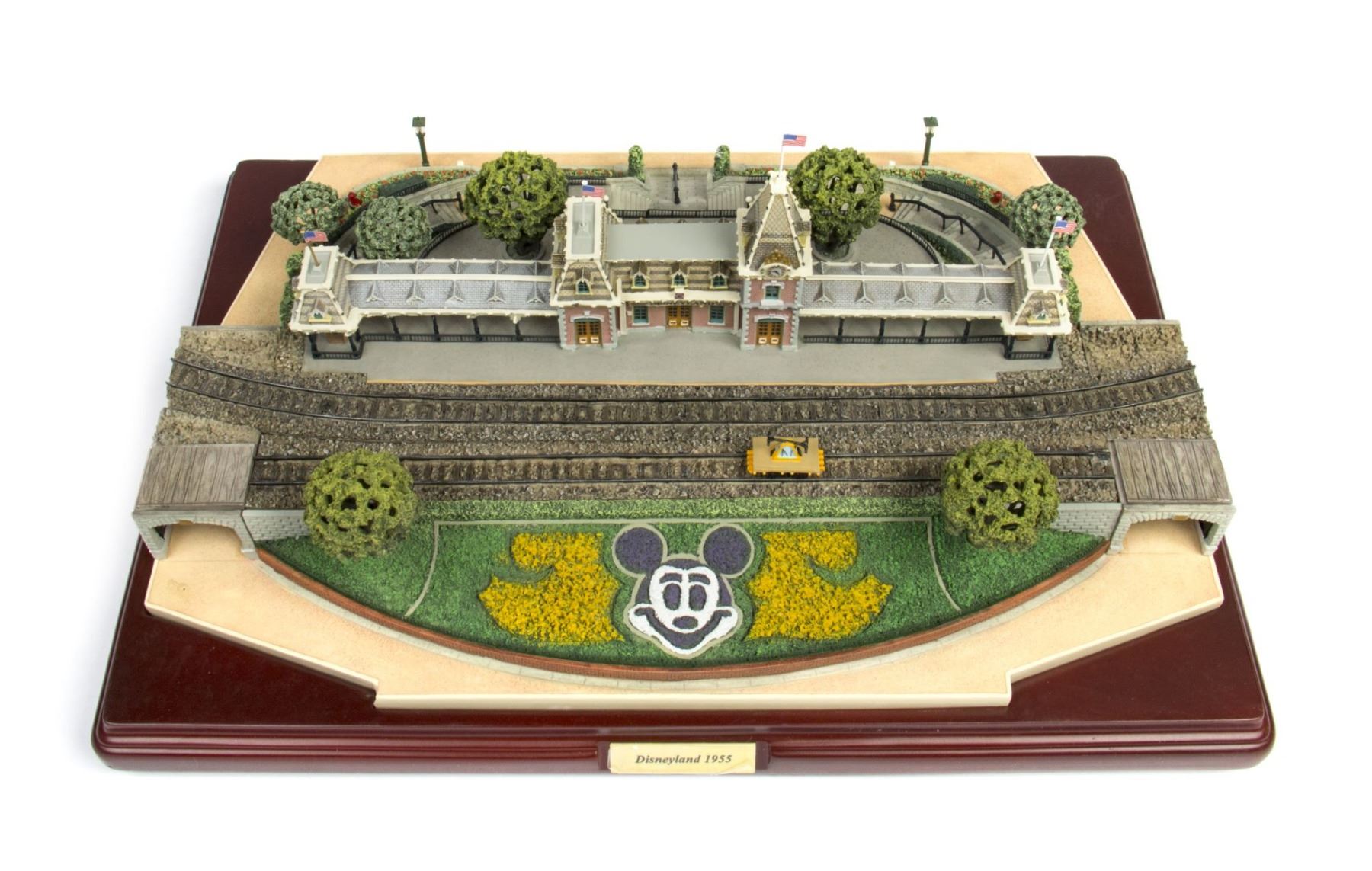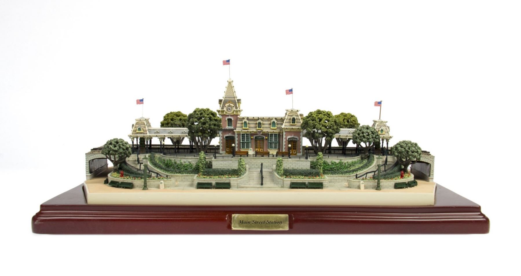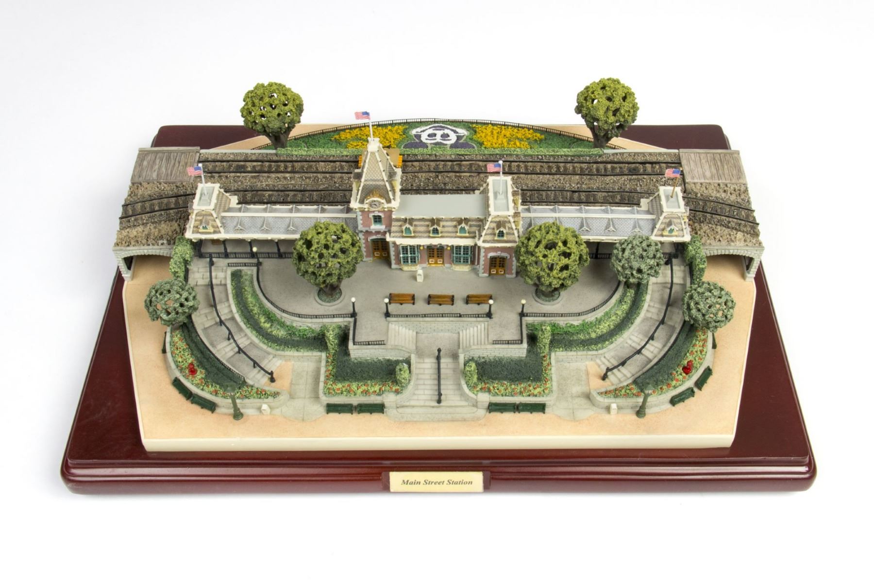 (Disney, c.2007) An original scale model of Disneyland's Main Street Station, created by renowned miniaturist, Robert Olszewski. This model was designed by Olszewski for Disney's incredibly popular Main Street U.S.A. Collection of miniatures. Created in resin with a wood base and a brass plaque, the model measures approximately 9.5"x14" and 6" tall. The condition is good with minor wear from previous display. The original box is included. Given that these miniatures have numerous fine details, there may be a small chip, crack, or break that may have gone unnoticed. Please use the images of the item to help assess the full condition.
