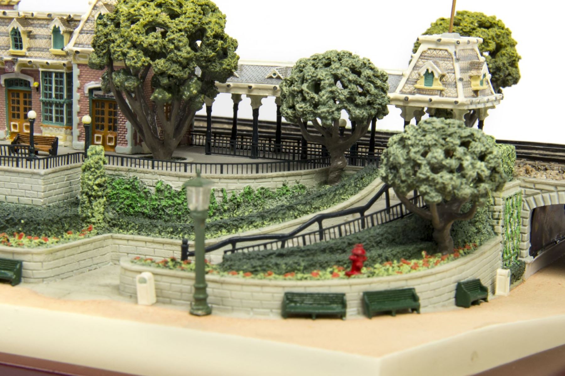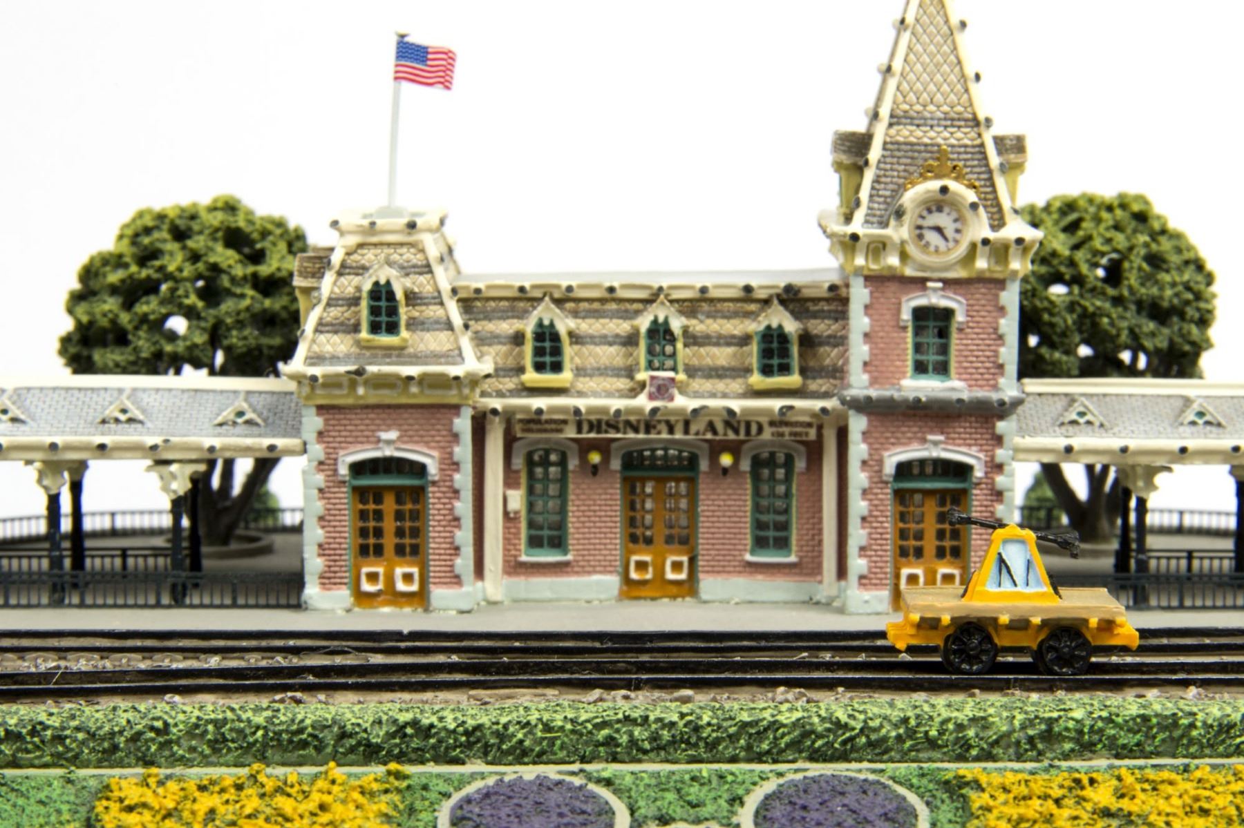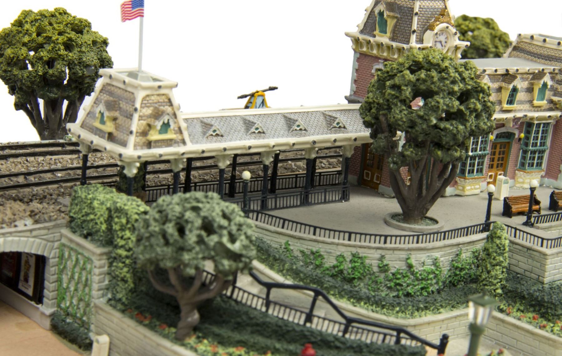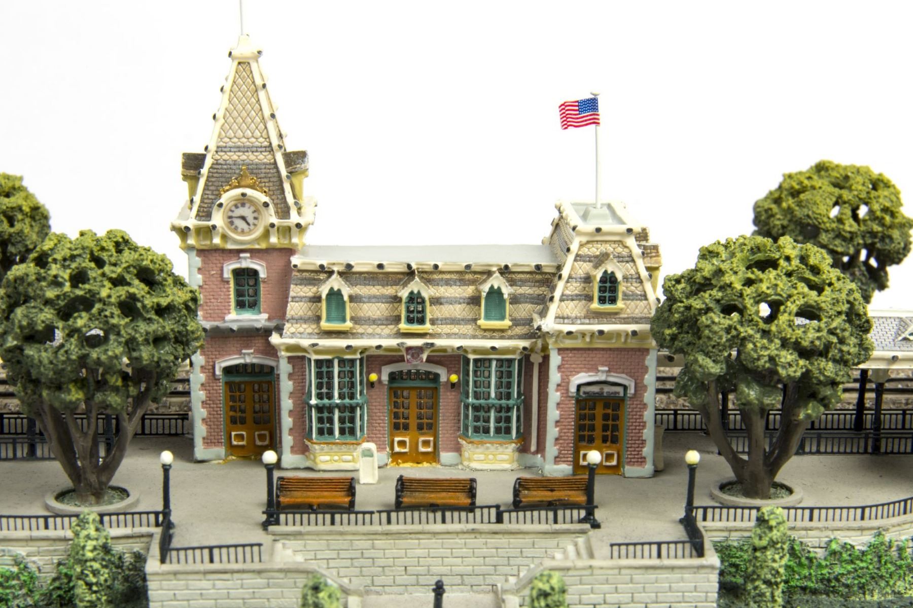(Disney, c.2007) An original scale model of Disneyland's Main Street Station, created by renowned miniaturist, Robert Olszewski. This model was designed by Olszewski for Disney's incredibly popular Main Street U.S.A. Collection of miniatures. Created in resin with a wood base and a brass plaque, the model measures approximately 9.5"x14" and 6" tall. The condition is good with minor wear from previous display. The original box is included. Given that these miniatures have numerous fine details, there may be a small chip, crack, or break that may have gone unnoticed. Please use the images of the item to help assess the full condition.