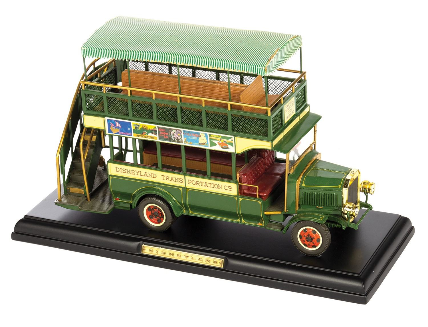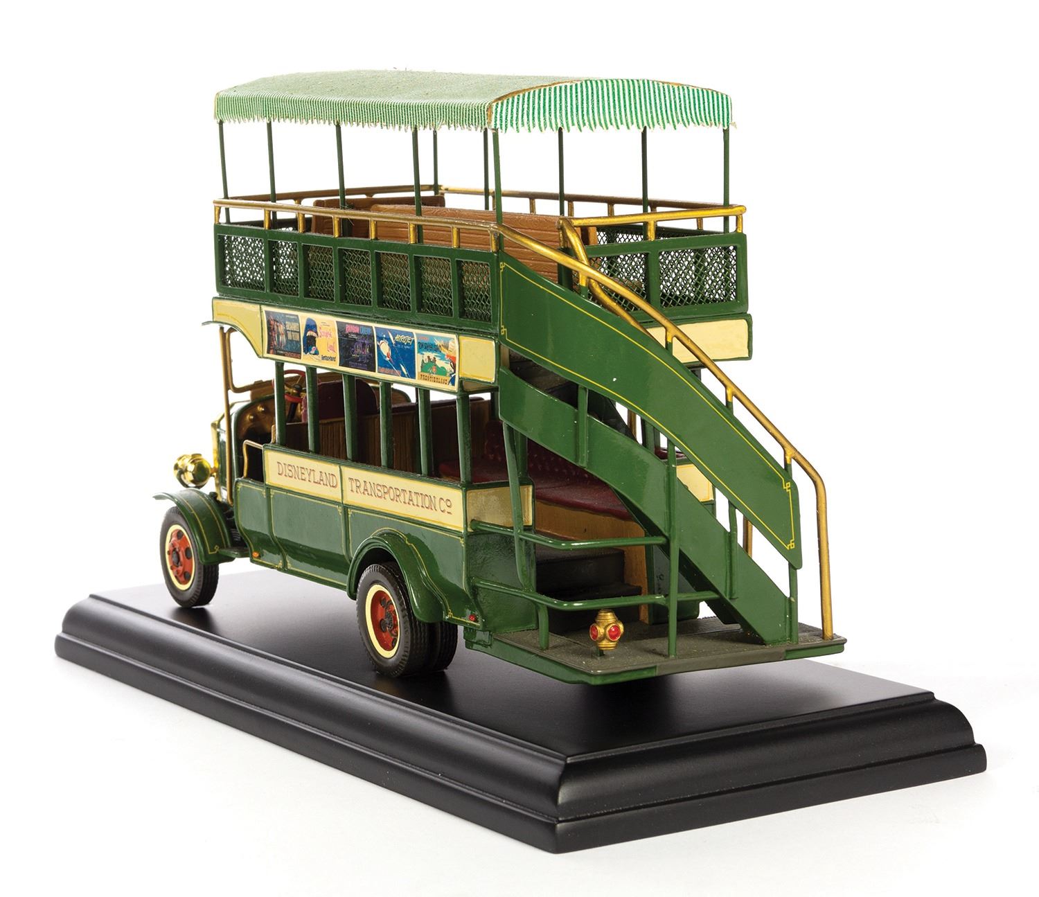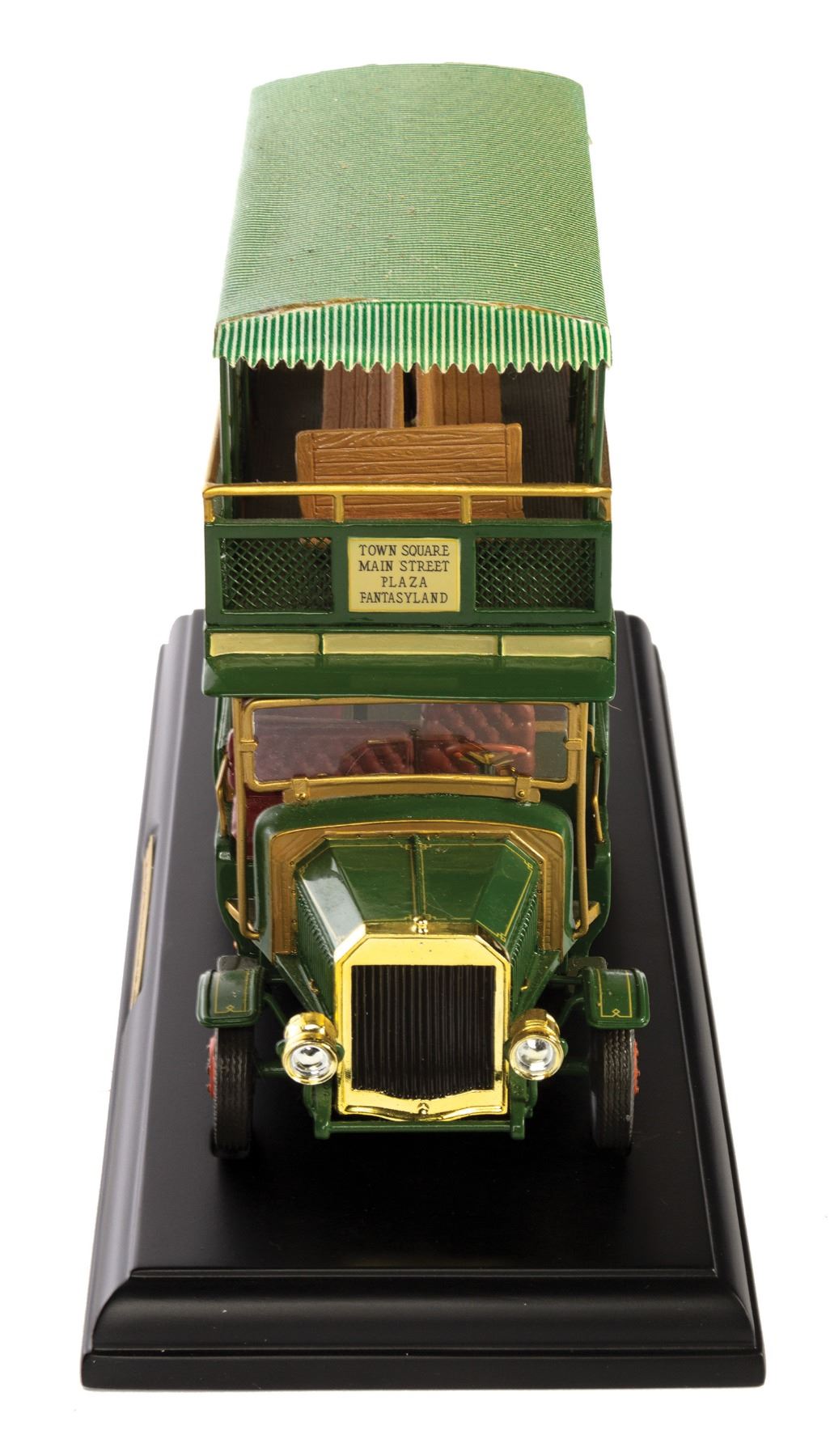 (Disneyland, 2005) A Main Street U.S.A. Omnibus replica that was made for the 50th anniversary of Disneyland. This model was designed by Kevin Kidney and Jody Daily, and the model comes with a COA that is signed by Bob Gurr. This replica was created in a limited edition of only 500 and is accomplished in metal and resin with a vinyl canopy and wood base. The model measures 10.5"x3" and is about 7" tall, and is in very good condition with minor wear. There is minor fraying on the canopy which is common on these models.