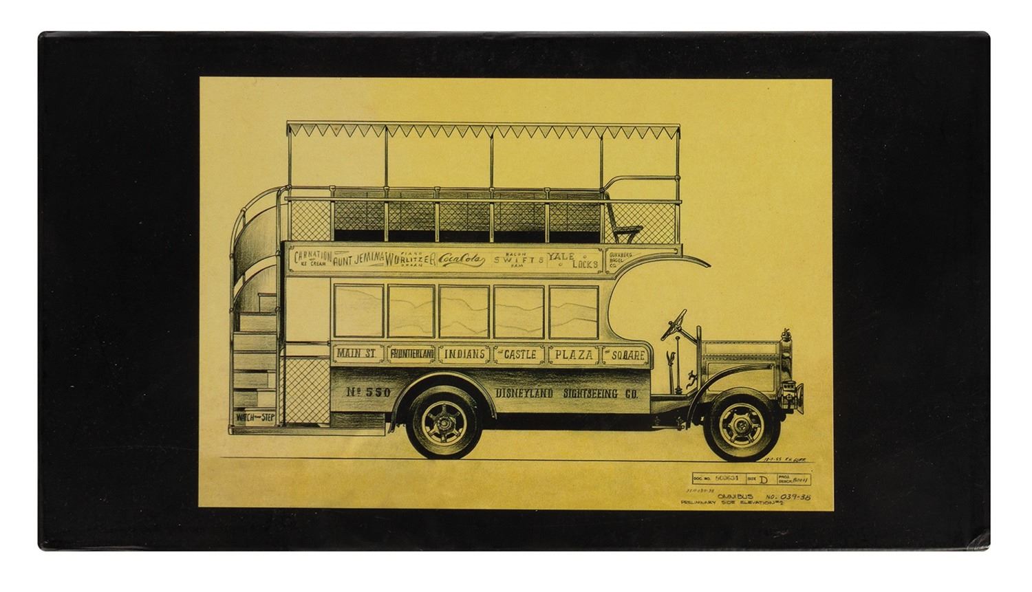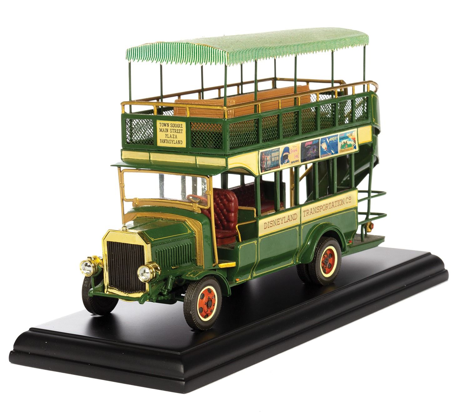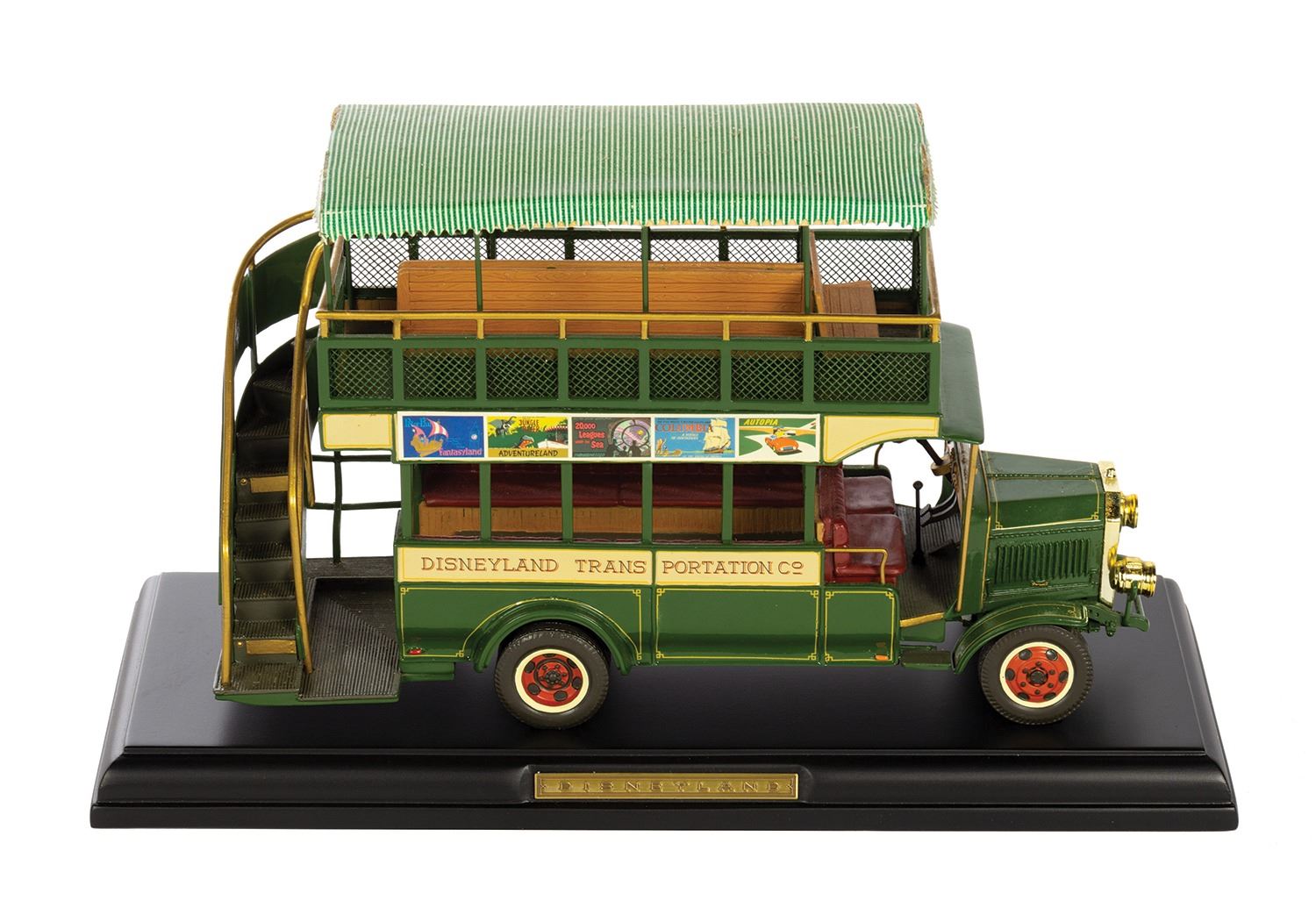 (Disneyland, 2005) A Main Street U.S.A. Omnibus replica that was made for the 50th anniversary of Disneyland. This model was designed by Kevin Kidney and Jody Daily, and the model comes with a COA that is signed by Bob Gurr. This replica was created in a limited edition of only 500 and is accomplished in metal and resin with a vinyl canopy and wood base. The model measures 10.5"x3" and is about 7" tall, and is in very good condition with minor wear. There is minor fraying on the canopy which is common on these models.