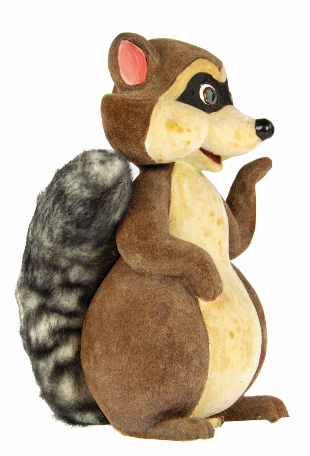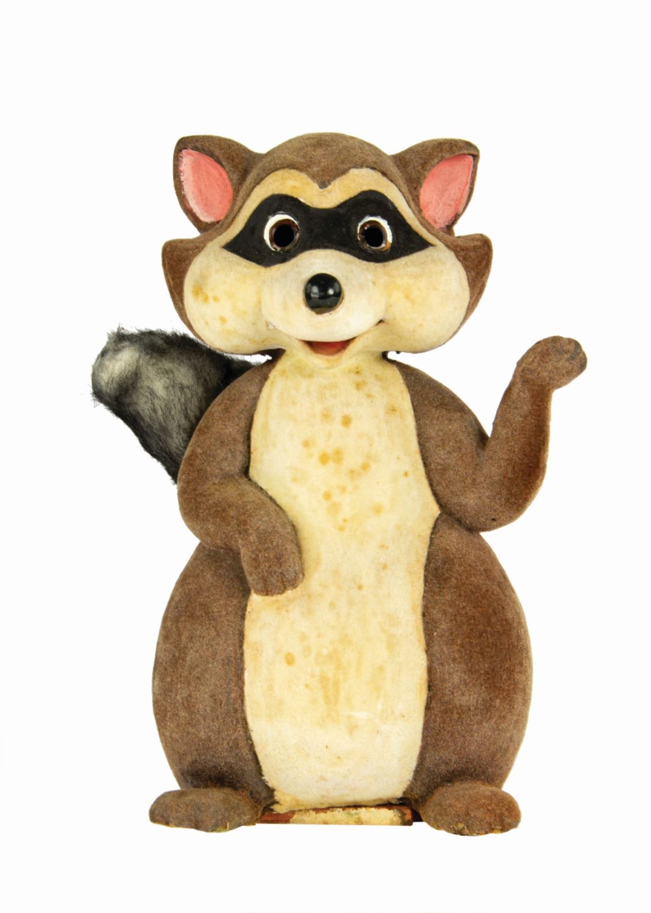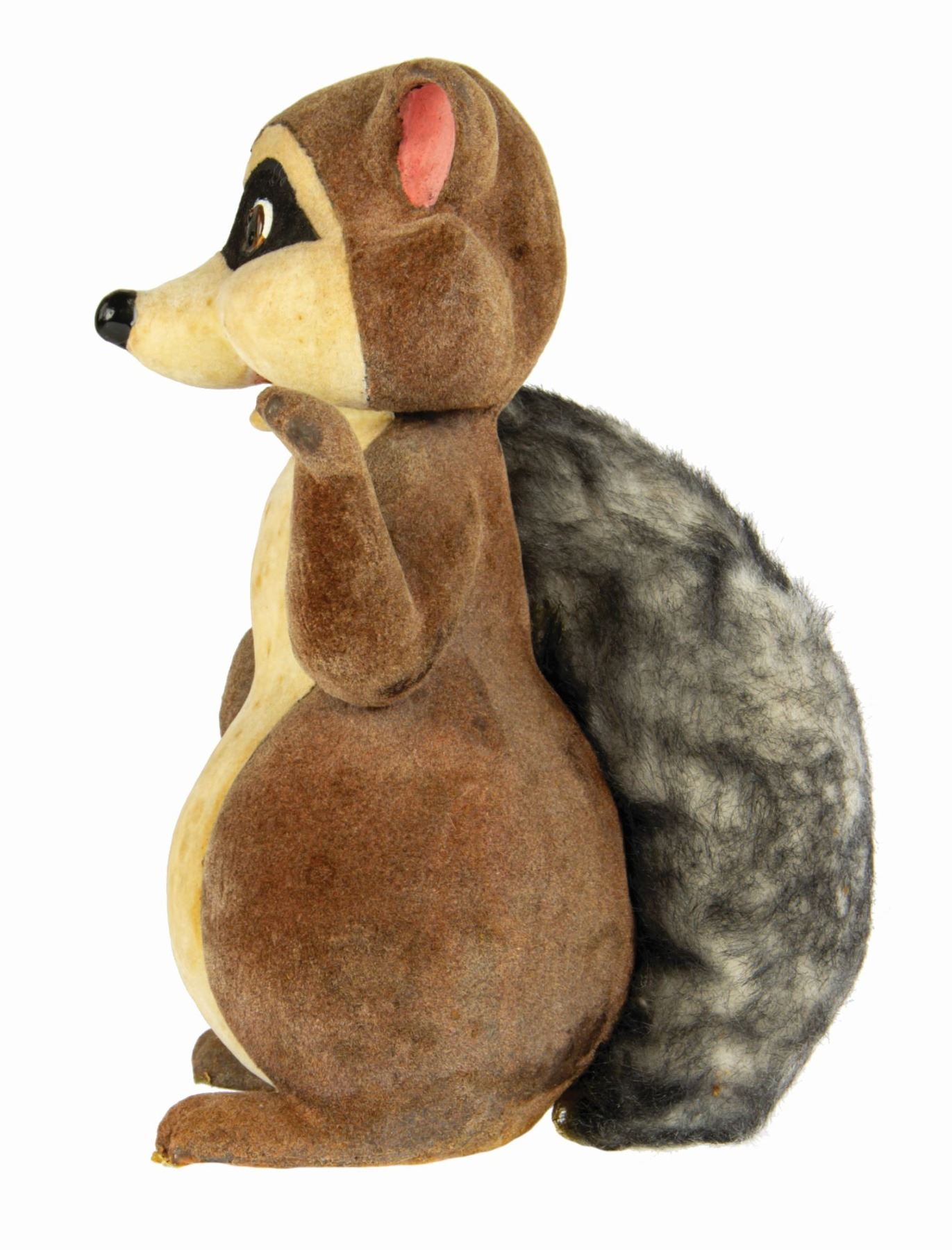 (Disneyland, 1970s) An original Raccoon prop figure used within a Bambi themed window display at the Main Street Emporium. Composed of dense foam coated in felt, the figure has a wooden block and screw at the base that was used to secure it within the display. The figure comes with a certificate of authenticity from a Disneyana Convention in the 1990s. Measuring 13" tall, the figure is in good condition with spots of discoloration and wear throughout from use.