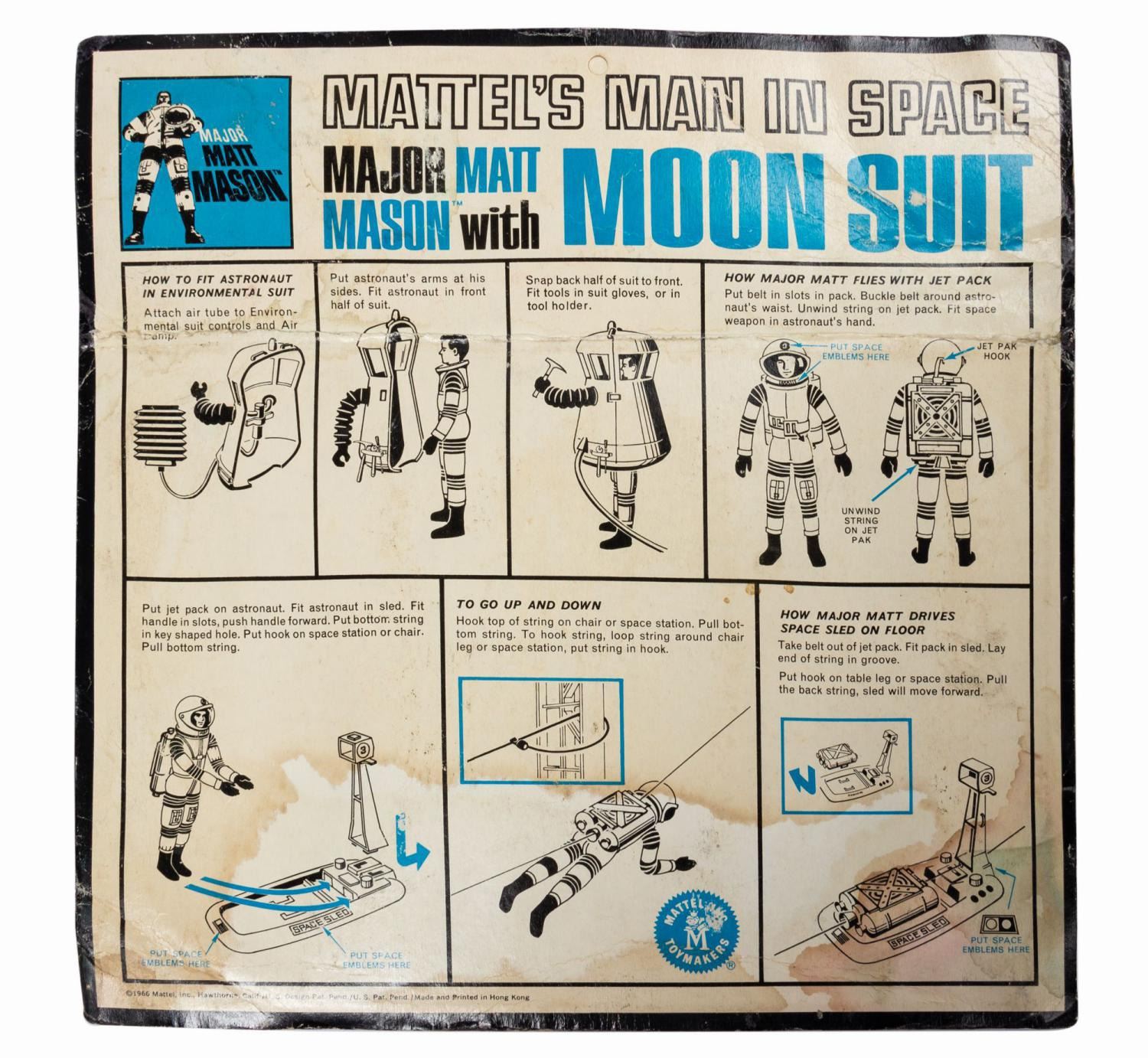 (Mattel, 1966) A vintage Major Matt Mason with Moon Suit playset manufactured by Mattel. Called "Mattel's Man in Space," the Matt Mason line was the toymaker's attempt to cash in on interest in all things out-of-this-world during the height of the Space Race. Never opened, all items are inside the original plastic bubble, which is still attached to the original backing card, though there is some minor separation at upper left. It is rare to find a set so well preserved. Measuring 13"x11.25" and 2.25" deep, the unpunched card is in good condition. It exhibits some creasing at top and some warping and damp staining to the reverse from exposure to moisture. Unopened, the action figure and accessories are as-new.