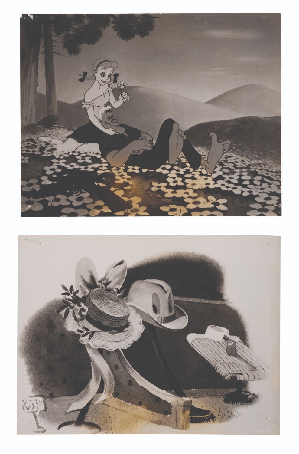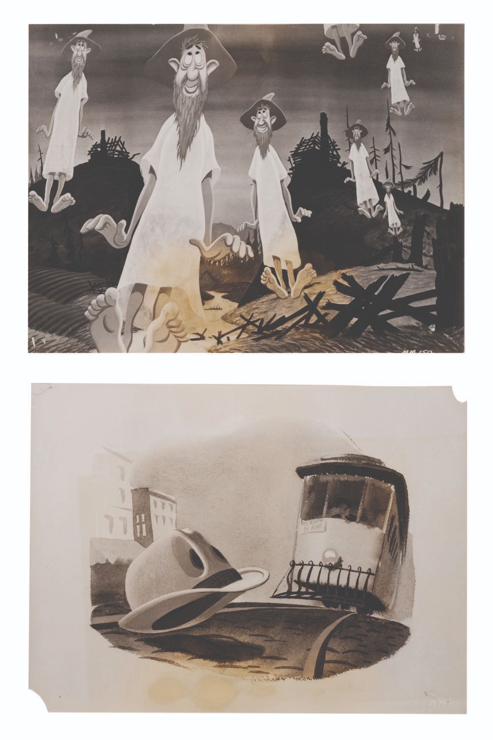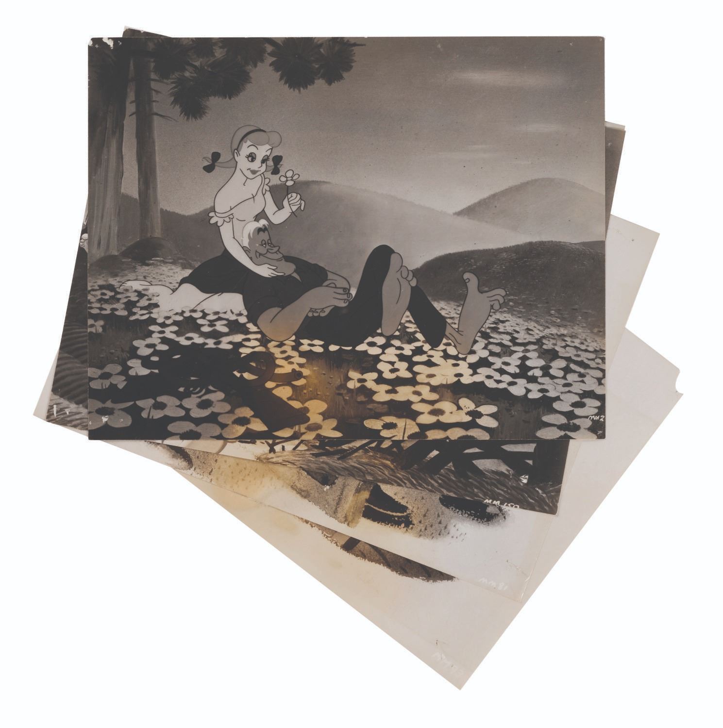 (Disney, 1946) A collection of 5 "Make Mine Music" publicity photos. Included are stills from Johnny Fedora and Alice Bluebonnet, Casey at the Bat, and the Martins and the Coys. Measuring 9" x 7.25" each, the photos are in very good condition, despite a few creases, edge wear, slight fading, and spots of yellowing to some.