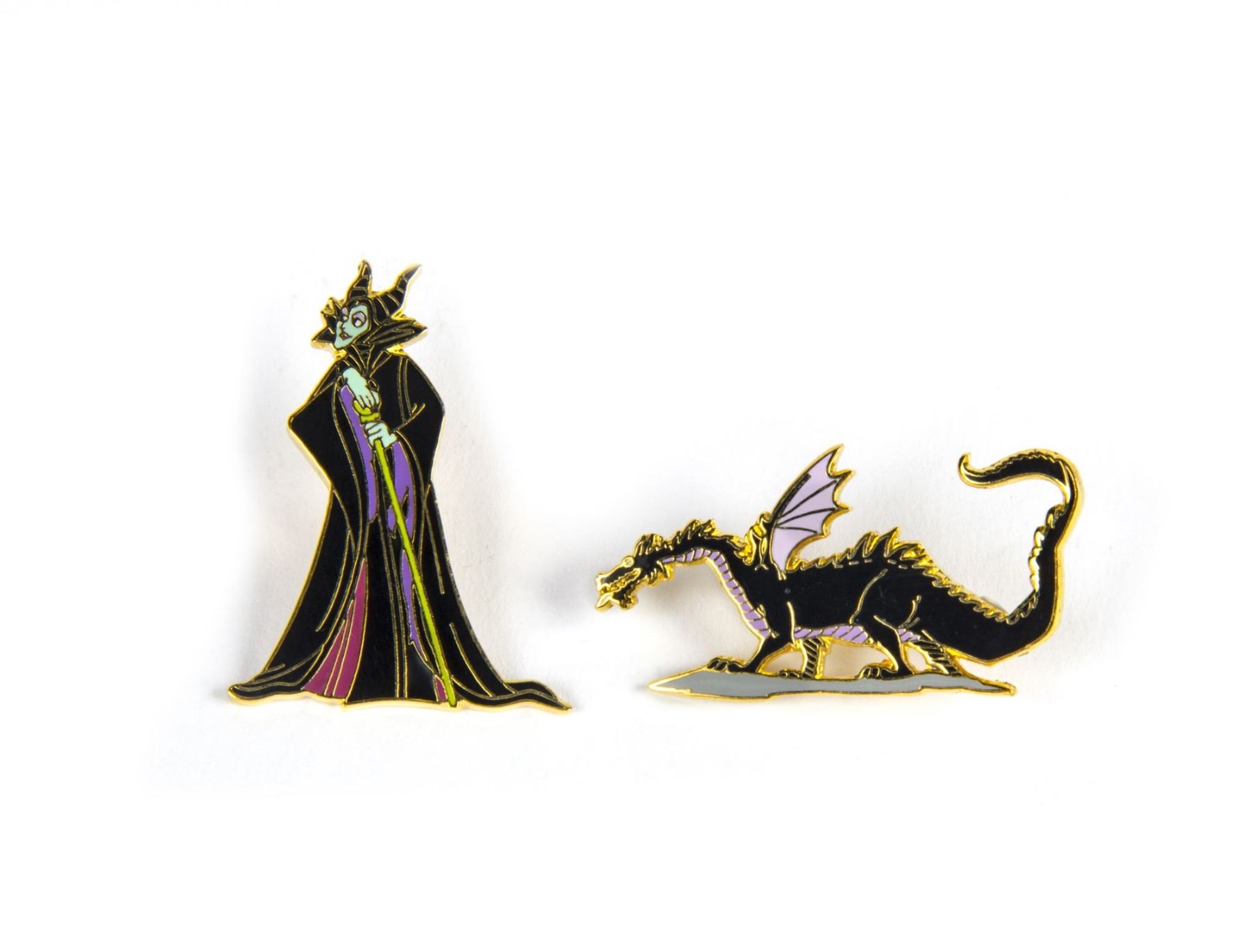 (Disneyland, c.2000) A pair of enamel pins featuring Maleficent and Maleficent as the dragon from Walt Disney's "Sleeping Beauty". The dragon pin is a limited edition, and these pins form a fantastic pair together of variant forms of this iconic villain. The dragon measures 0.75"x1.5" and Maleficent measures 1.5"x1". The pair is in very good condition.