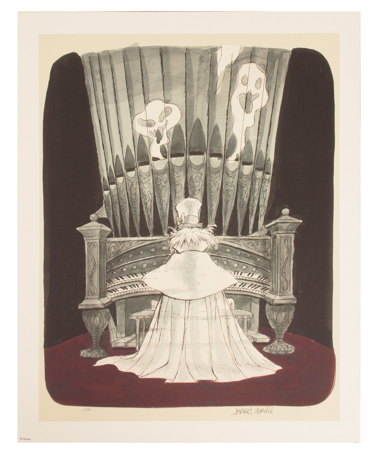 (Disneyland, 1999) An incredibly rare set of (6) high-quality giclee prints featuring the iconic concept artwork of Imagineer Marc Davis for the Haunted Mansion. This is one of the most difficult Haunted Mansion collectibles to obtain. Each print is signed by Davis, and out of only 10 sets produced, this is set number 1. Together, these giclee prints of Davis' artwork beautifully archive the creation of this historic attraction. The set comes in an elegant display box with velvet and felt lining, and includes white museum gloves for handling the giclees. There is a glass portion of the lid which one of the giclee prints can be displayed under. Each giclee measures 16"x20" and the set is in very fine condition with minor surface wear to the display box. The original Disney Gallery numbered Certificate of Authenticity is included.