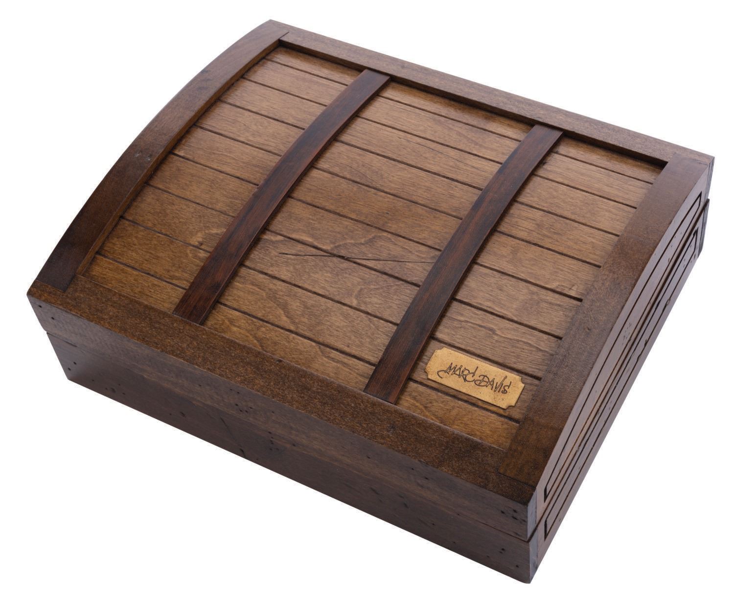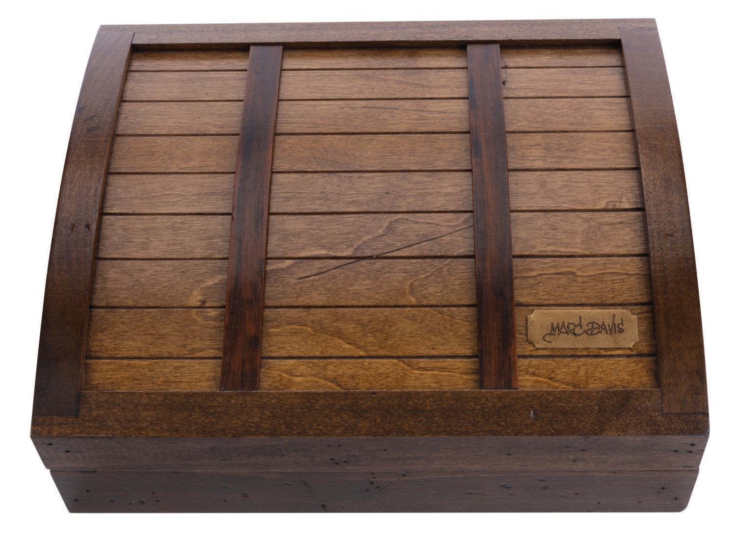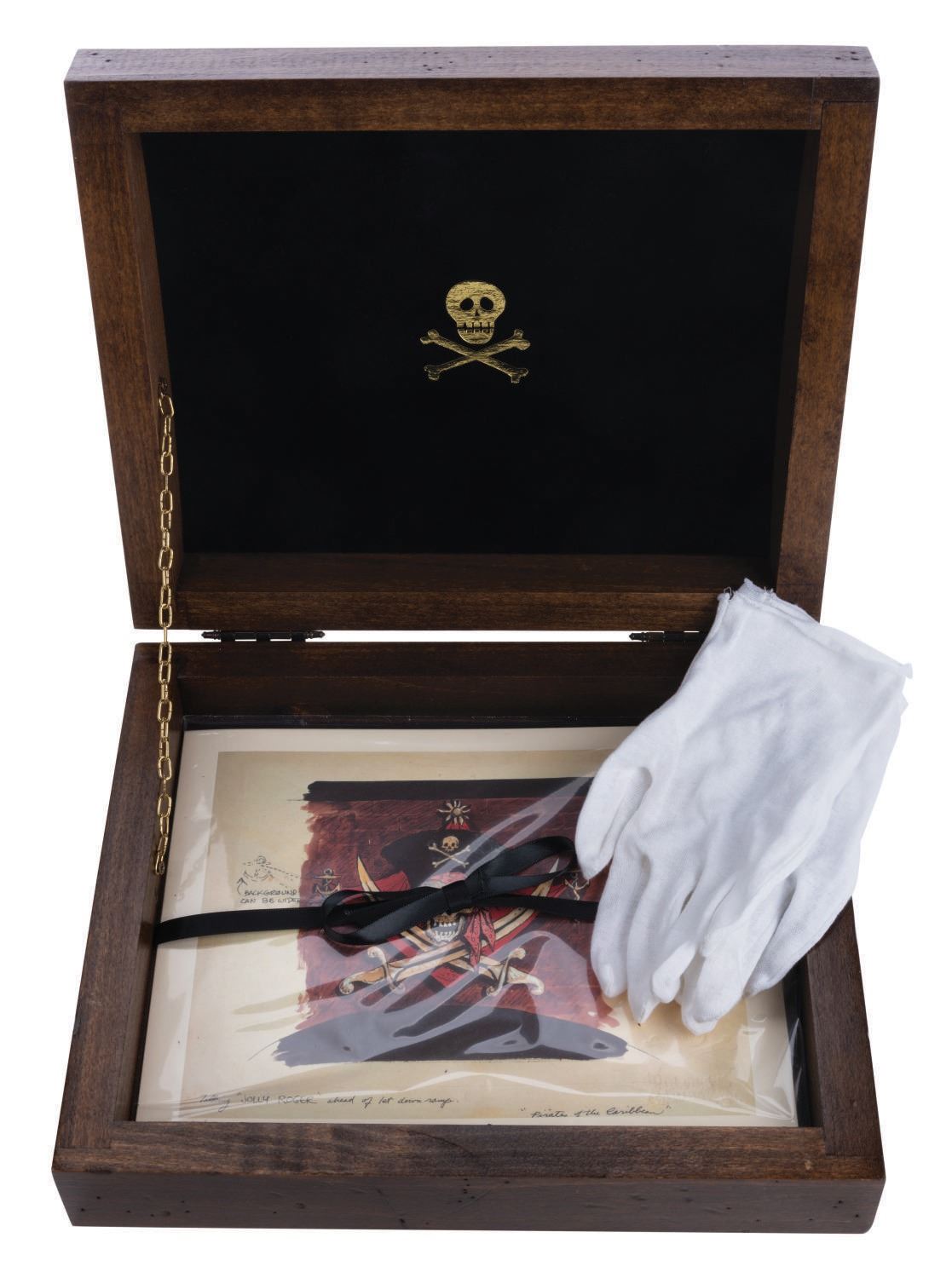 (Disneyland, 2000) A limited edition set consisting of (7) lithographic prints of Marc Davis's original concept artwork for the Pirates of the Caribbean attraction. This is the first set created in the edition of just 100 pieces. Each print is debossed with a Pirates stamp at lower right and hand numbered in pencil "99/100." The set is accompanied by a Disney COA, a set of white gloves for handling, and housed in a decorative wooden treasure chest box, with intentional distressed motif, and features a metal plaque on the lid engraved with Marc Davis's trademark signature. A Jolly Roger is stamped in gold on the lid's interior black felt lining. The lithographs each measure 8"x10" and the chest is 10.25"x12" and 4.25" in deep. All are in very fine, as-new condition.