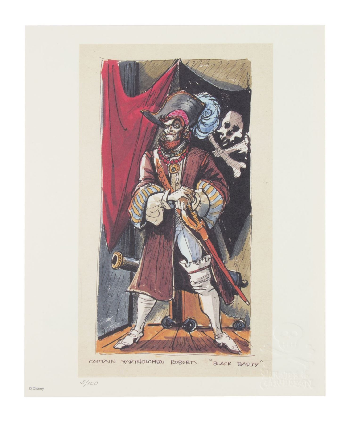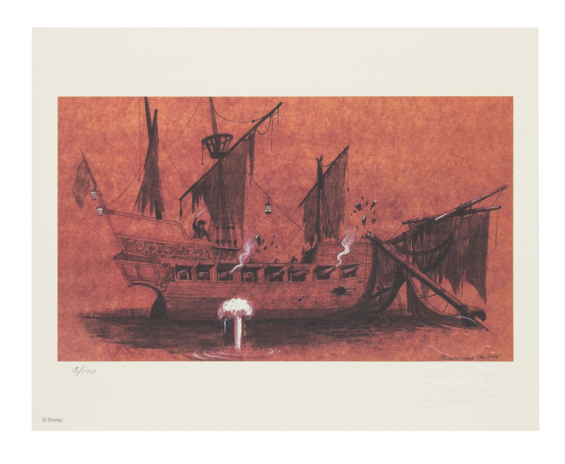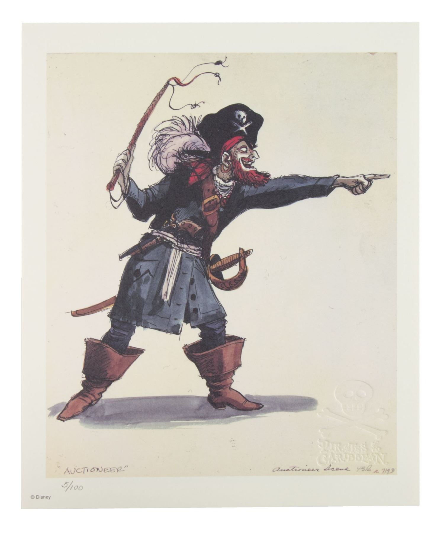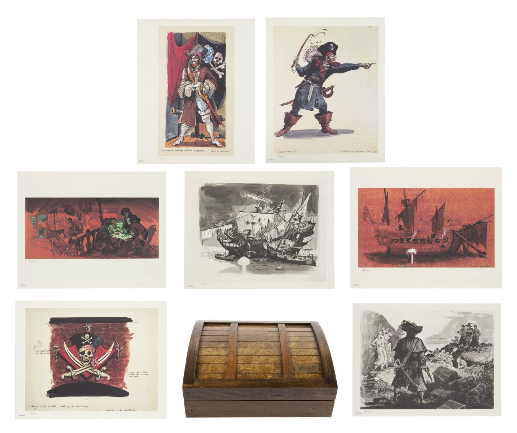 (Disneyland, 2000) An extremely rare limited edition set of (7) lithographs featuring the iconic concept art of Imagineer Marc Davis. The set comes in a treasure chest style case with white museum gloves for handling the high-quality lithographs. Each lithograph is hand-numbered 5/100. The concept art included in this set provides an incredible archive of imagery relating to the development of this historic attraction. Many familiar characters and elements from the attraction can be seen throughout, with each lithograph measuring 8"x10". The set is in very fine condition with minor surface wear to the chest, and includes its original Disney Gallery certificate of authenticity and a short biography sheet of Davis' career. The COA is hand-signed by Disney Legend Marty Sklar.