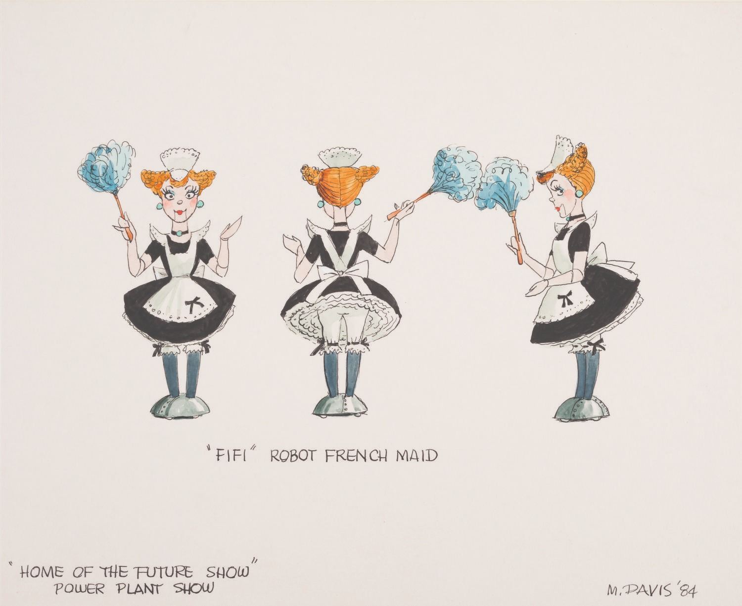 (Six Flags, 1984) A very rare piece of concept art for the Six Flags Power Plant in Baltimore Maryland, by Disney Legend Marc Davis. Conceived as a combination entertainment, dining, and shopping area, Six Flags wanted to diversify away from simply "ride parks" into Urban Entertainment Centers. One of their key directives was that the project must not include any rides - which the many former Disney Imagineers employed on the project advised against. In the end, the Power Plant opened in 1985 and closed in 1986 due mainly to poor attendance. This piece is one of many characters Disney Legend Marc Davis designed for the Power Plant. Fifi the Robot French Maid was likely never realized, although there was a section that displayed inventions for Future Living. Measuring 12"x14.5" mounted to 16"x19" board, the original art is in fine condition.