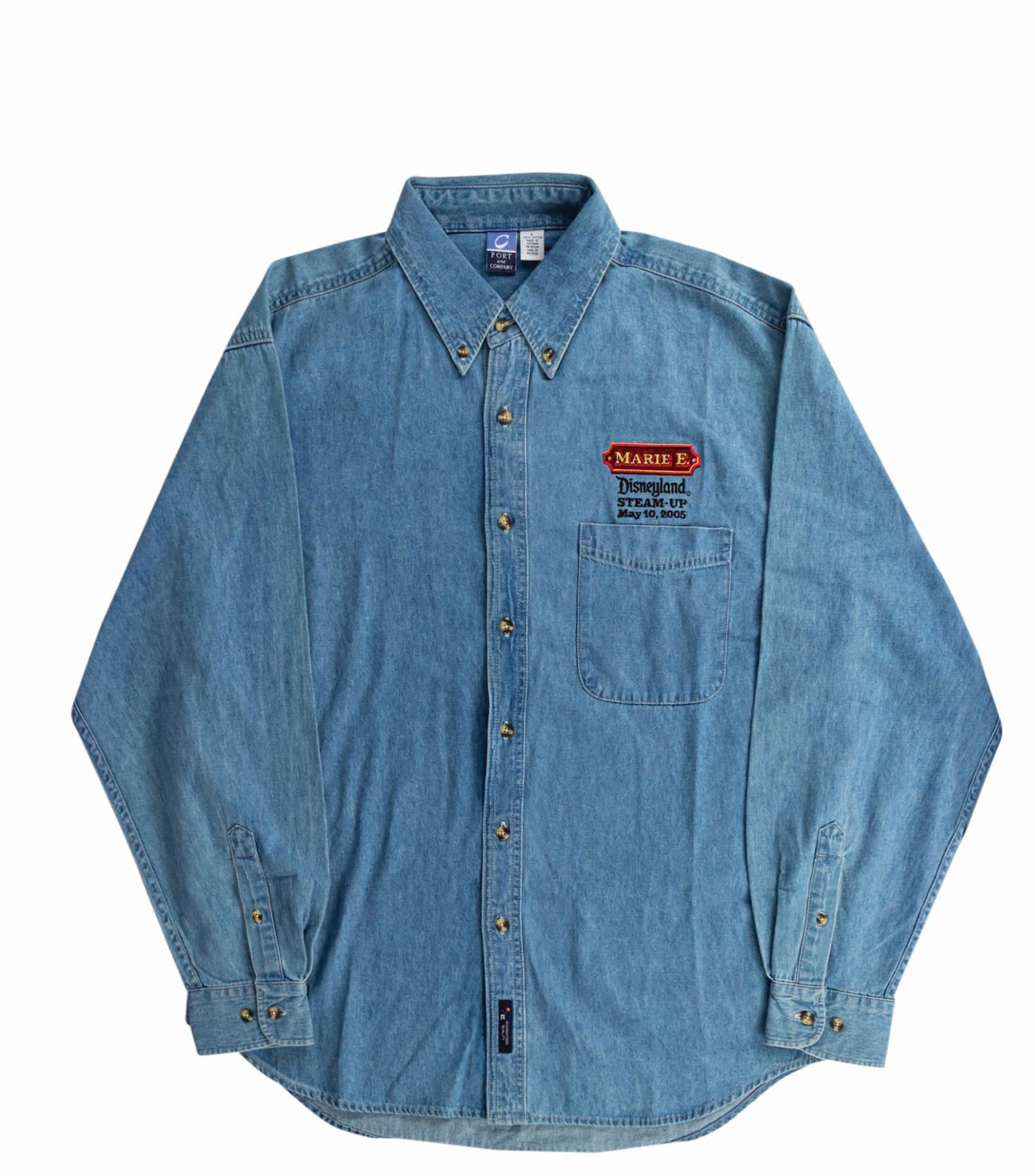 (Disneyland, 2005) A blue denim shirt commemorating the 2005 Marie E. Disneyland Steam Up event honoring animator and Disney legend Ollie Johnston. One of Walt Disney’s nine old men, Ollie Johnston was lifelong steam train enthusiast. His 1:12 scale miniature La Canada Valley Railroad was the inspiration for Walt Disney’s own Carolwood Pacific Railroad. In 1949, Johnston refurbished a full-size locomotive, which he named the Marie E. Later, that steam engine was purchased by Disney and Pixar executive John Lasseter. On the morning of May 10, 2005, Ollie Johnston was invited by Lasseter to Disneyland to participate in a ceremony celebrating Disneyland’s 50th Anniversary. Unbeknownst to Johnston, Lasseter had arranged for the Marie E. to be brought to the park and installed on the Disneyland Railroad track. The Marie E. Disneyland Steam-Up paid tribute to Johnston’s enormous contributions and decades of service to Disney, and he was given the chance to drive the locomotive that he restored by hand around the park, which was the first time before or since any outside equipment was allowed to run on Disneyland’s rails. Attendees to the exclusive event were given shirts like these. A DVD of the proceedings is also included. The shirt is in very fine as-new condition.