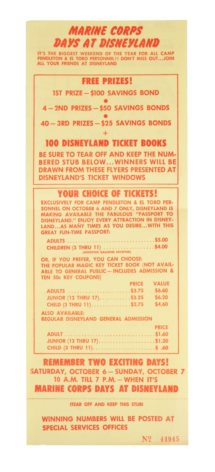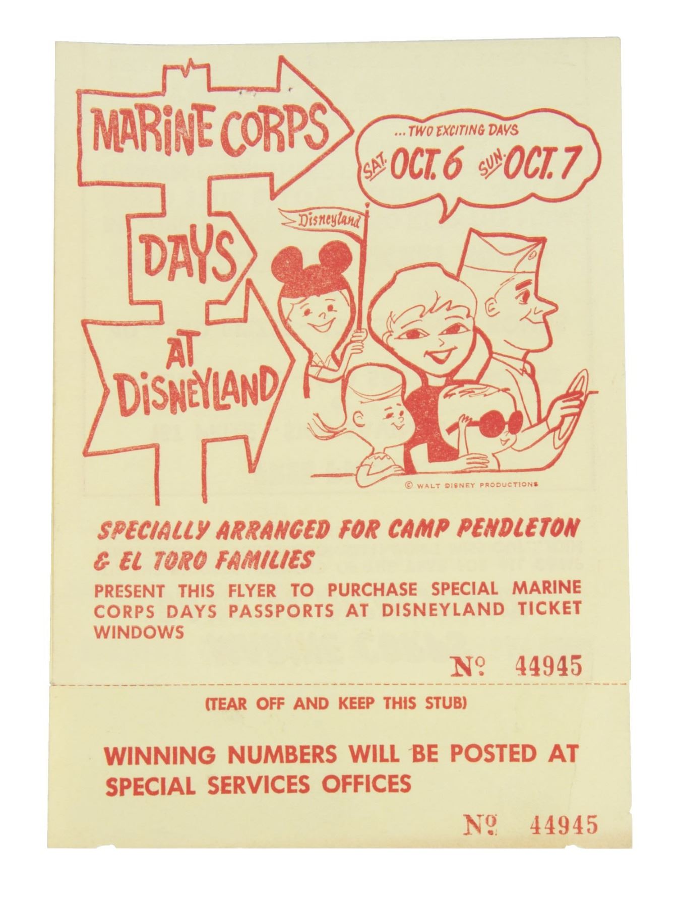 (Disneyland, 1962) A rare flyer for "Marine Corps Days at Disneyland" from Oct. 6-7 of 1962. Part of this flyer includes a raffle stub for prizes including savings bonds and ticket books. The flyer opens to reveal information on ticket deal options that were exclusive for Camp Pendleton and El Toro marine corps members. The raffle stub is still attached and the flyer measures 8"x5.5". The condition is good with some edge-wear and a few staple holes from the original display of the flyer.