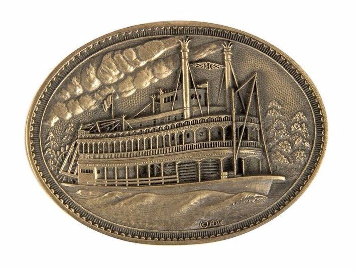 (Disneyland, 1970s) A bronze medallion featuring a relief image resembling the "Mark Twain" riverboat. This item was presented to a buyer for the Main Street Emporium as a prototype for a possible souvenir. This item measures 2.5"x3.5" and is in very good condition.