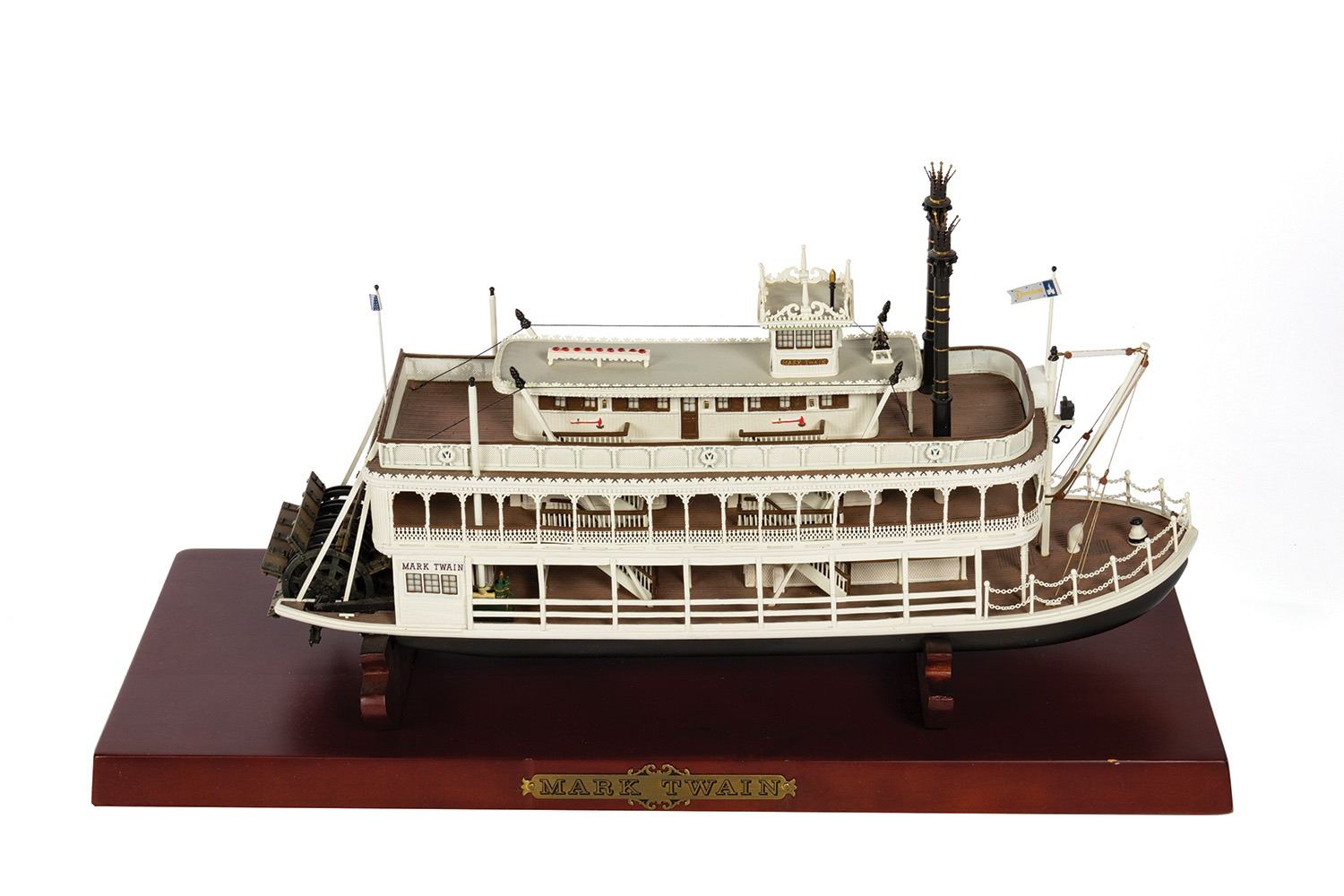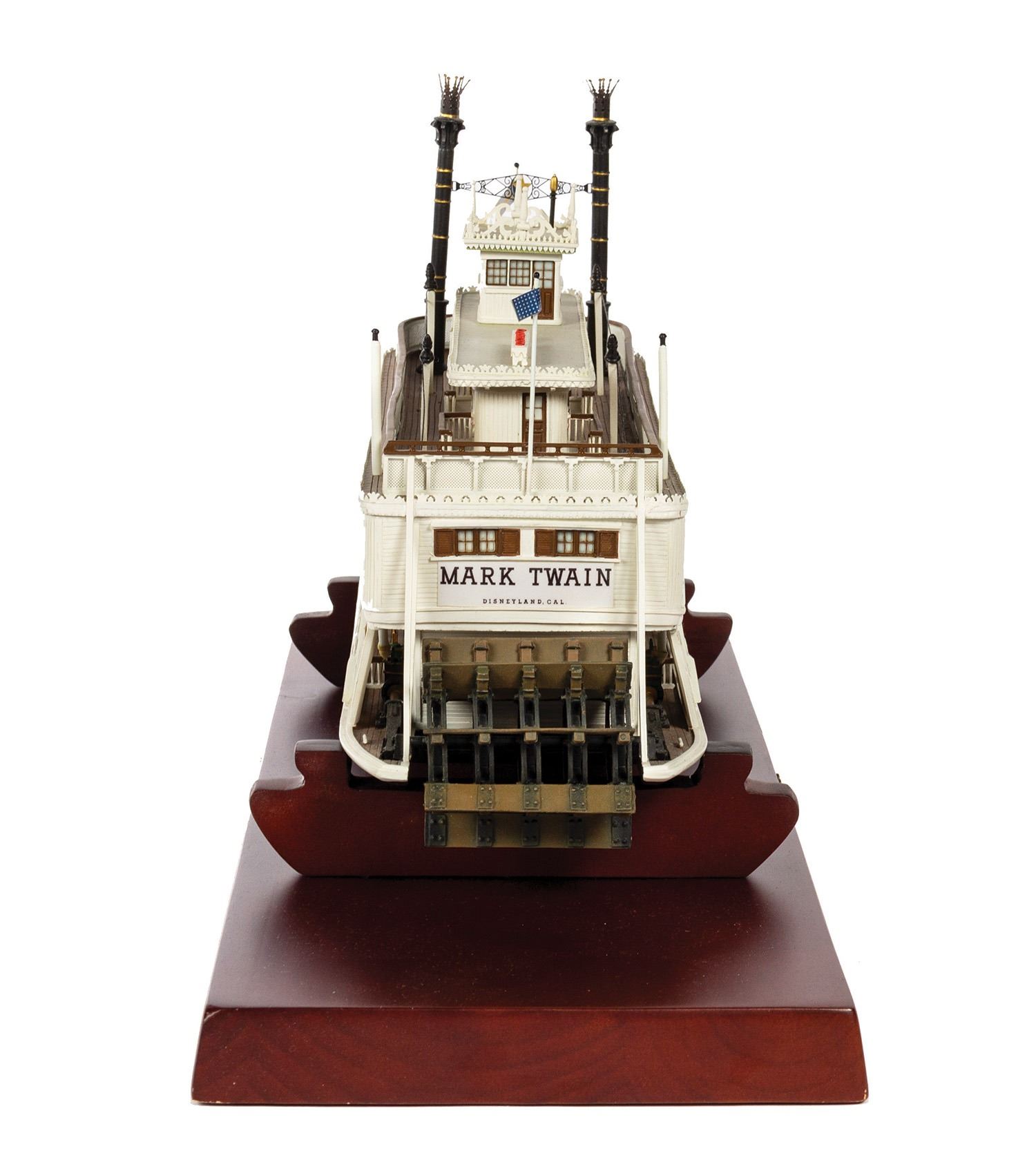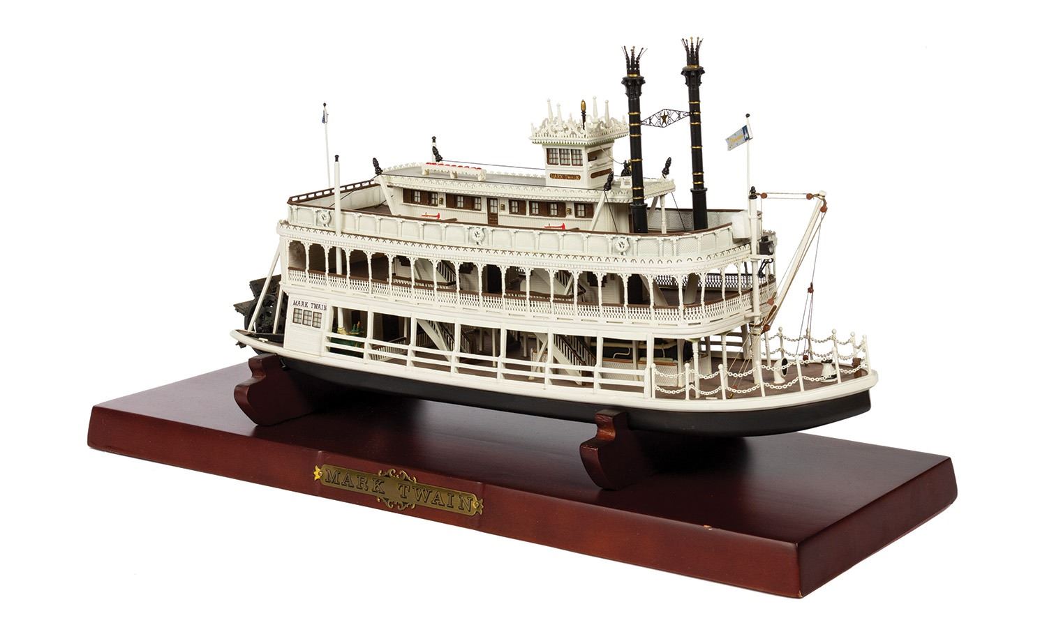 (Disneyland, 2007) A limited edition replica of the Mark Twain riverboat by Kevin Kidney and Jody Daily. Created in an edition of only 500 pieces, the replica is a beautiful recreation of one of Disneyland's first attractions. Measuring 6.75"x18.5" and 9.5" tall, the replica is in very good condition with a small chip in the base and comes with the original Certificate of Authenticity.