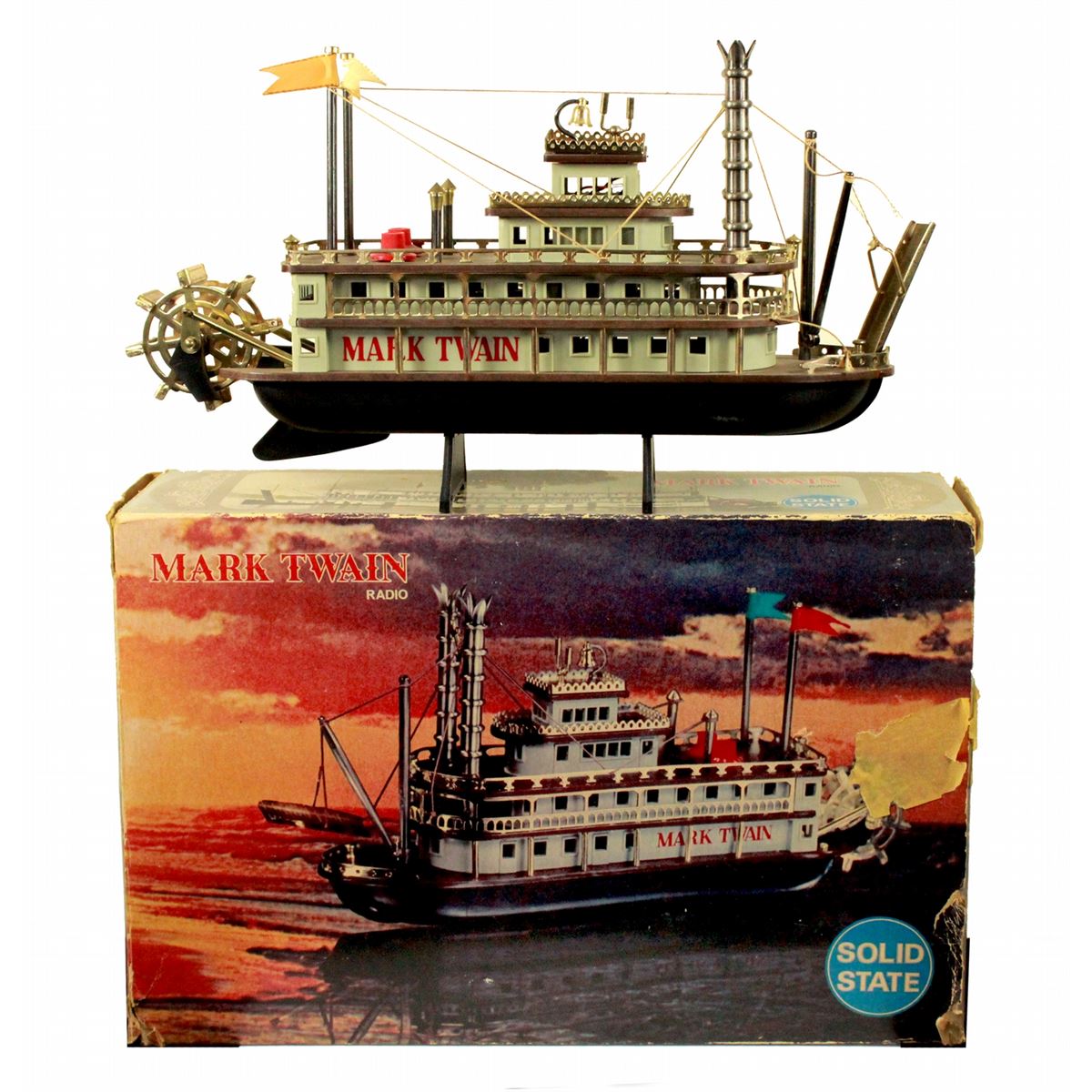 (Disneyland, 1965) A figural transistor radio of the Mark Twain Riverboat made in Japan and still with the original box. The radio measures 2.75 x 12 x 7.25 in. including stand. In very good condition overall. Operation was not tested.