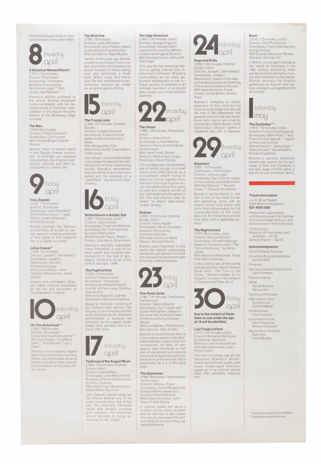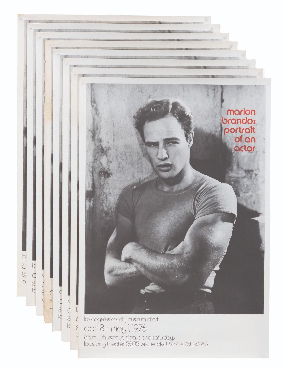 (Los Angeles County Museum of Art, 1976) Seven posters for the Los Angeles County Museum of Art program 'Marlon Brando: Portrait of an Actor' held from April 8 to May 1, 1976. The posters show the dates and times for screenings, which were held at Leo S. Bing Theater. Measuring 14.5 " x 21.5 ", the posters are in very good condition with very light wear from age.