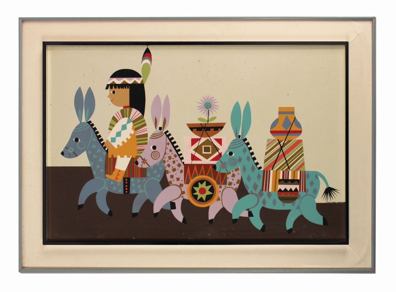 (Contemporary Resort, 1970s-80s) An original silkscreened print used in a hotel room at the Contemporary Resort at Walt Disney World. The imagery was taken directly from Mary Blair's original concept art, and the print is accomplished directly onto art board and comes within its original glassless frame. Measuring 26.5"x36.5", the room decor is in fair condition with some foxing throughout, small cracks as the corners of the mat, and some wear to the wooden frame.